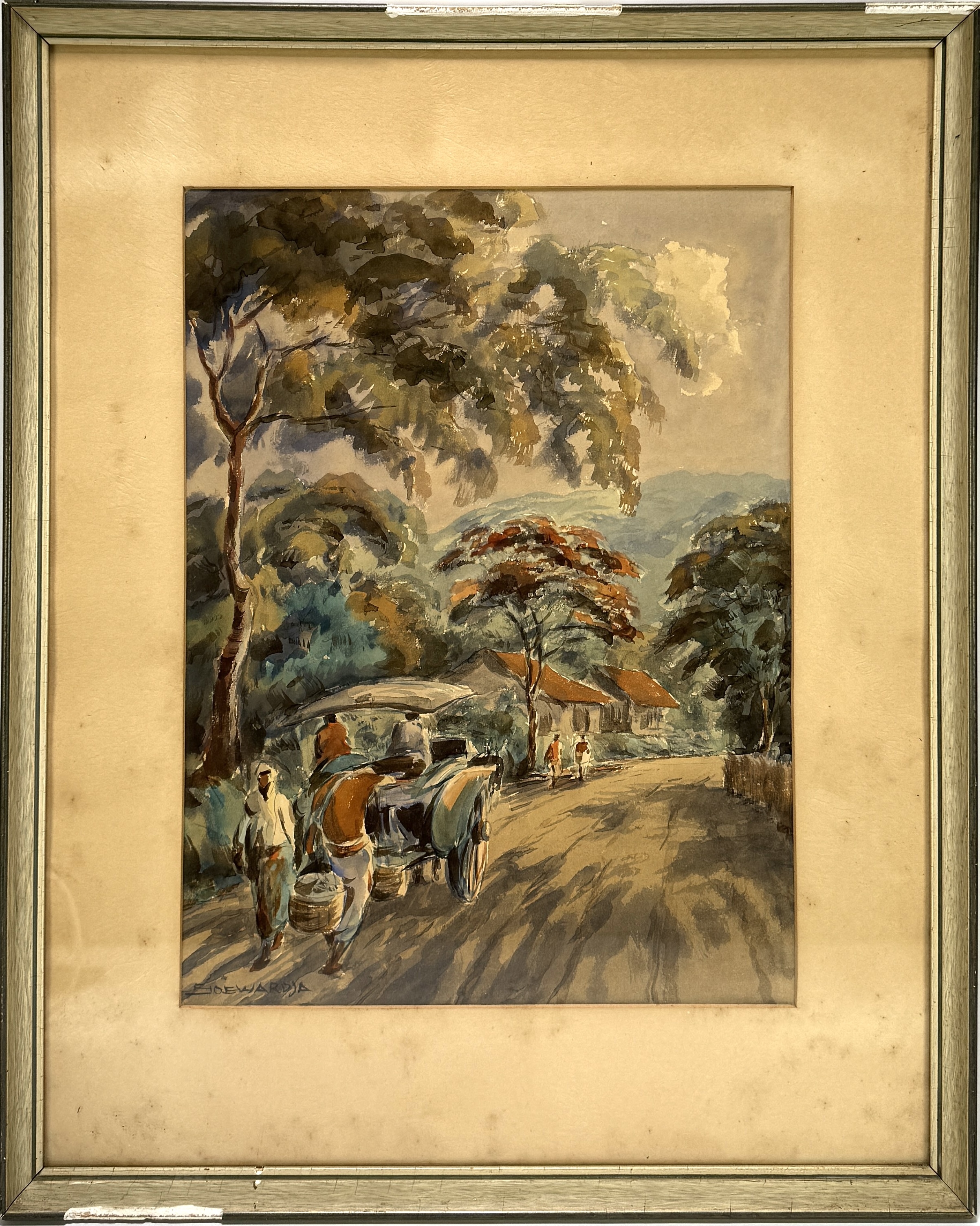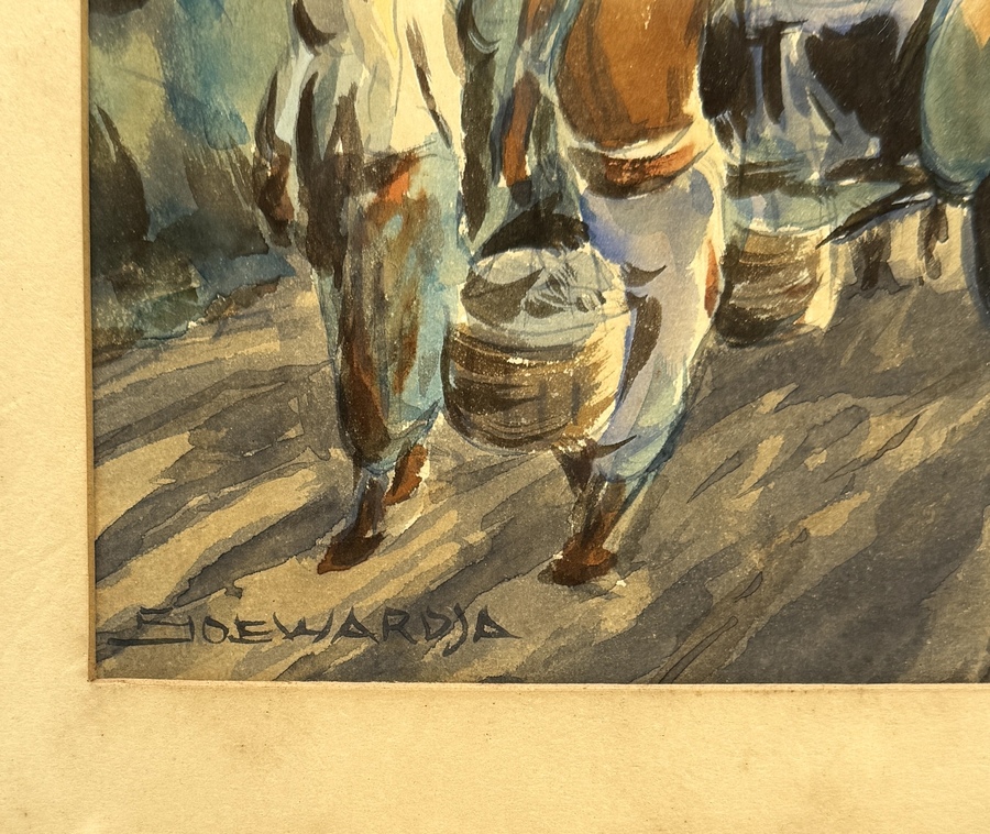 Aquarel door Soewardja (1900–1968) in Mooi Indië stijl, uitgevoerd op papier met een transparante techniek. De voorstelling toont een levendig straatbeeld met een ossenwagen op een onverharde weg, omgeven door tropische vegetatie en bergen in de verte. Het werk is linksonder gesigneerd. De aquarel dateert uit het midden van de twintigste eeuw en heeft een Indonesische herkomst. Wil je direct deelnemen? Plaats alvast een schriftelijk bod via onze website! |