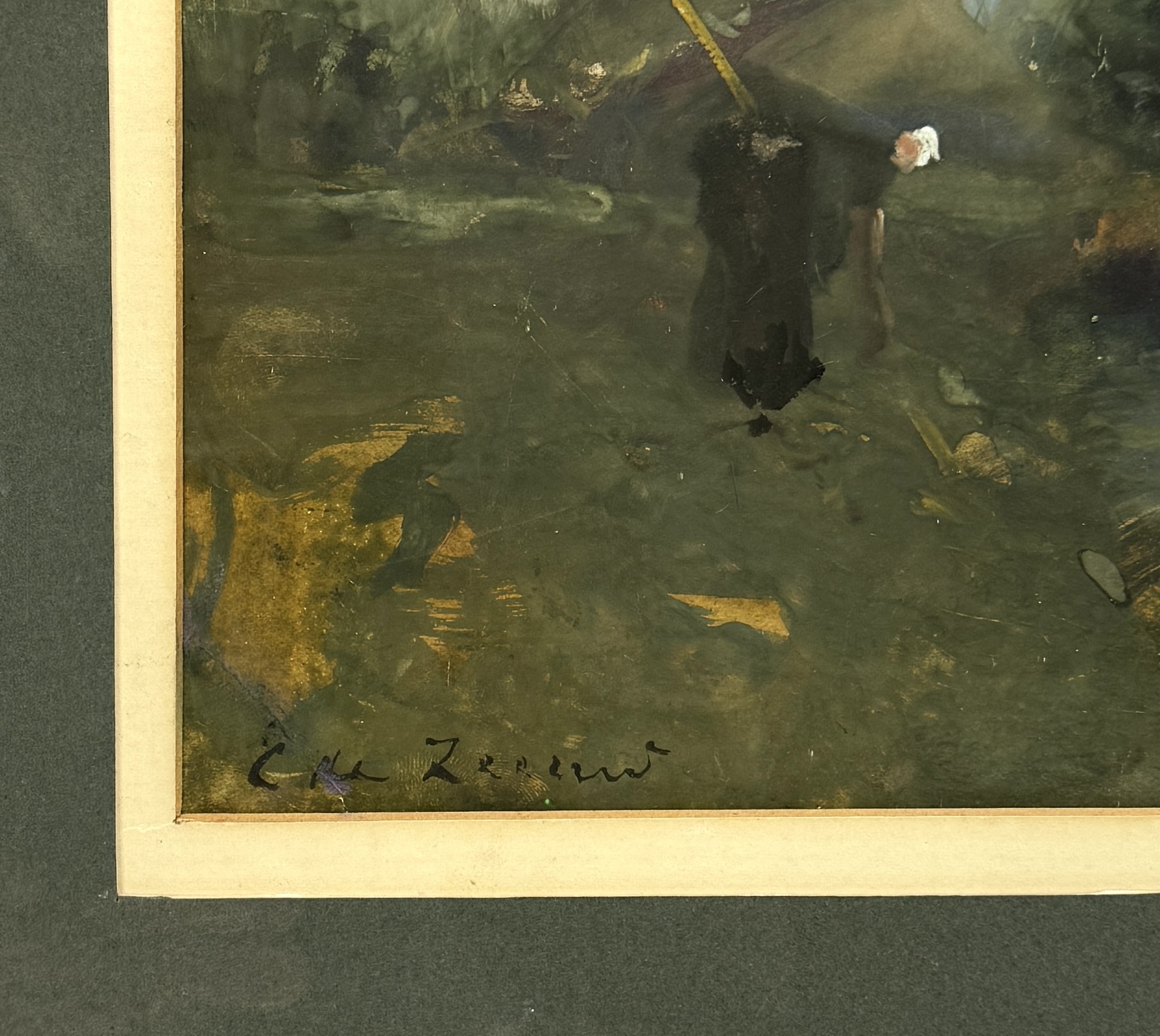 Aquarel door Adriaan Terhell (1863–1949), werkend onder het pseudoniem C. de Zeeuw, toont een landschap met twee molens langs een waterpartij in realistische traditie. Uitgevoerd in aquarel op papier, met een horizontale compositie en nadruk op atmosferische werking. Het gedempte palet van groen, oker en grijsblauw versterkt het landelijke karakter. Linksonder gesigneerd, begin 20e eeuw, Nederlandse herkomst. Deze aquarel zelf beoordelen? Je bent welkom op onze kijkdagen op 10, 11 en 12 april. |