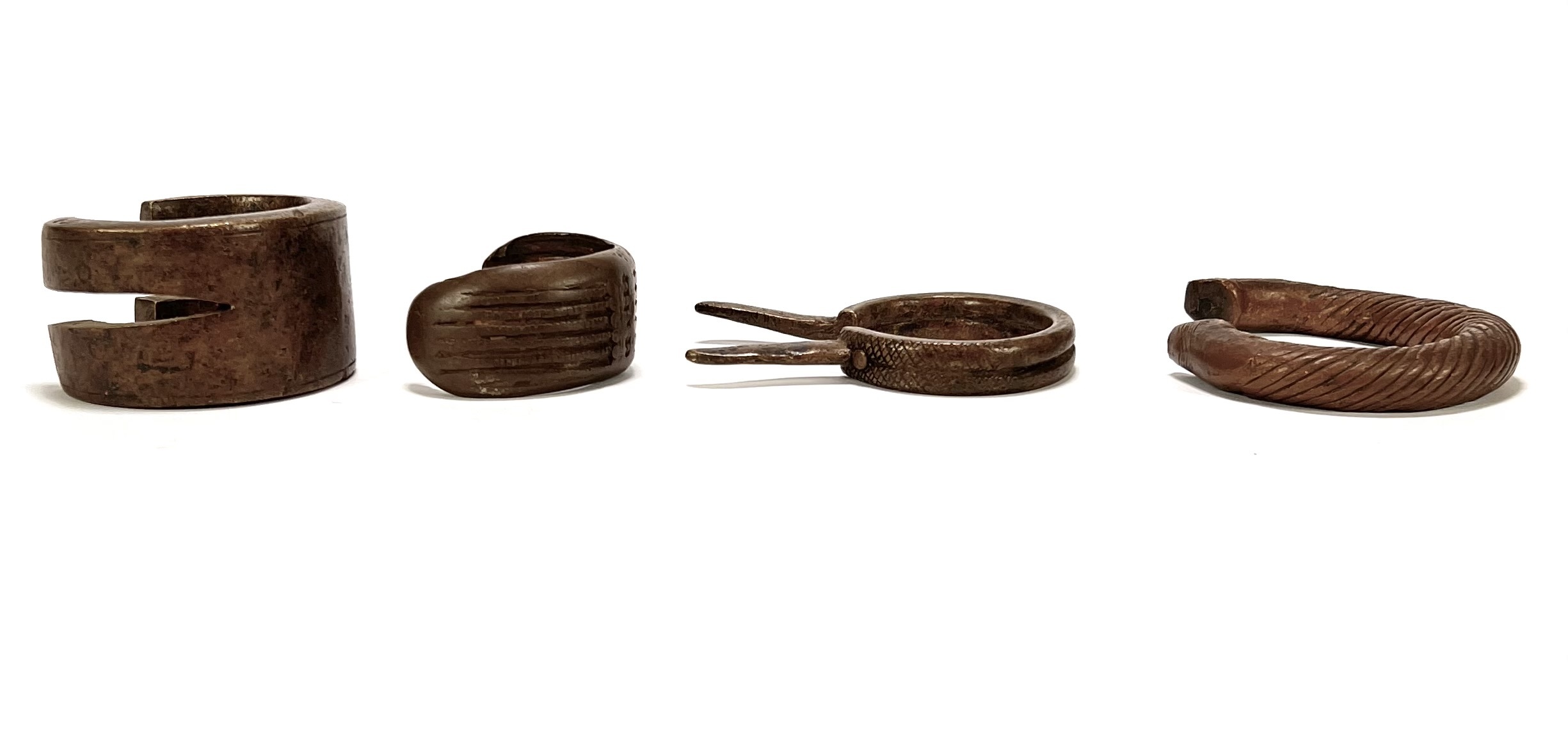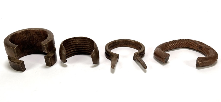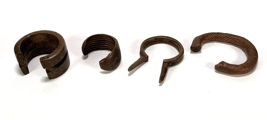 Diverse armbanden uit West-Afrika, midden 20e eeuw, vervaardigd uit gegoten messing en brons. Het kavel bevat vier armbanden, waaronder manilla valuta met traditionele torsie motieven en geometrische patronen. De armbanden dienden oorspronkelijk als betaalmiddel en status symbool binnen West-Afrikaanse handelsculturen. Kom langs tijdens de kijkdagen (10 t/m 12 april) en ontdek de armbanden zelf! |