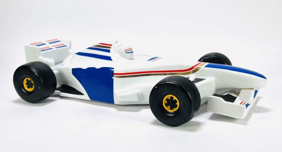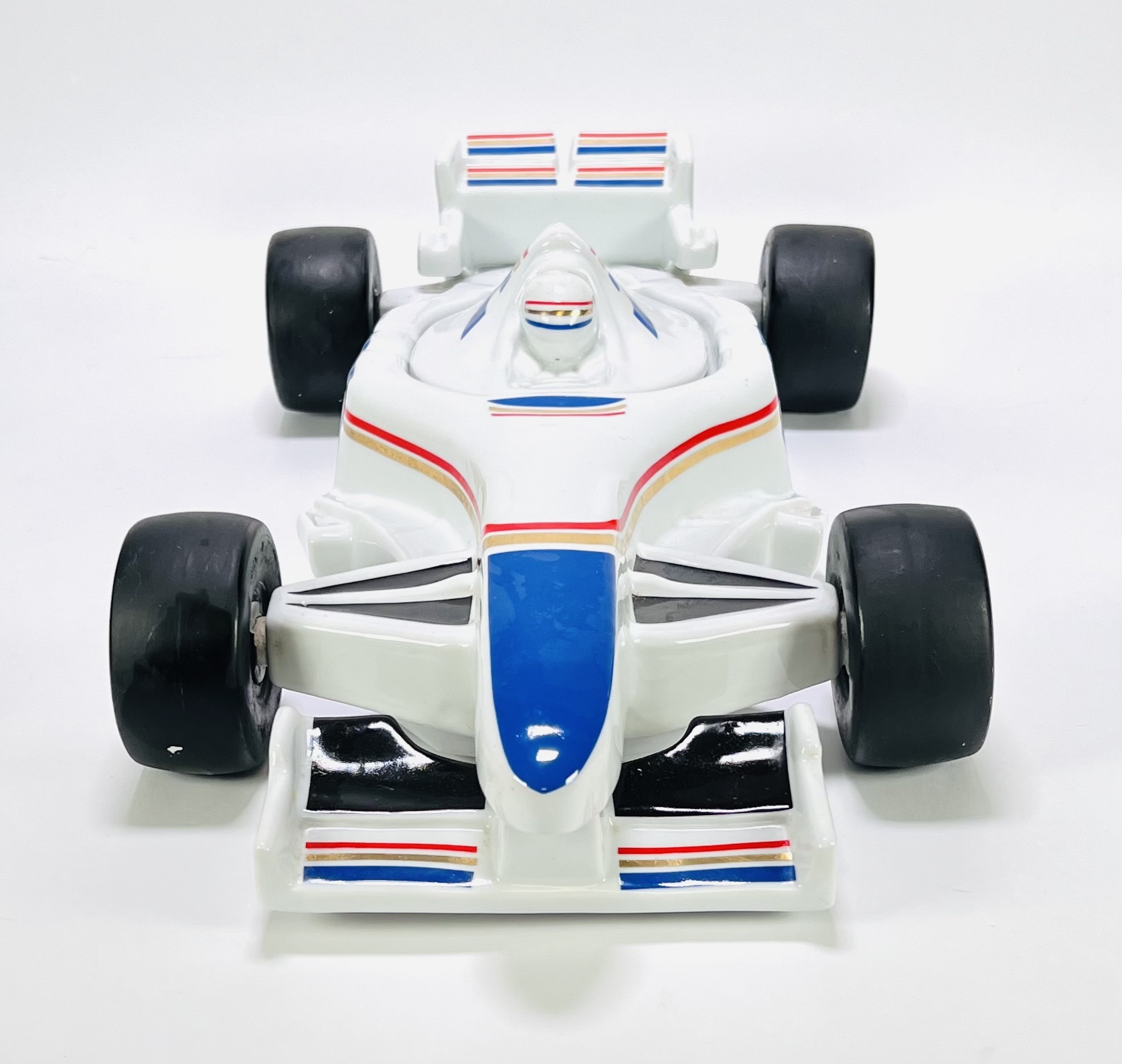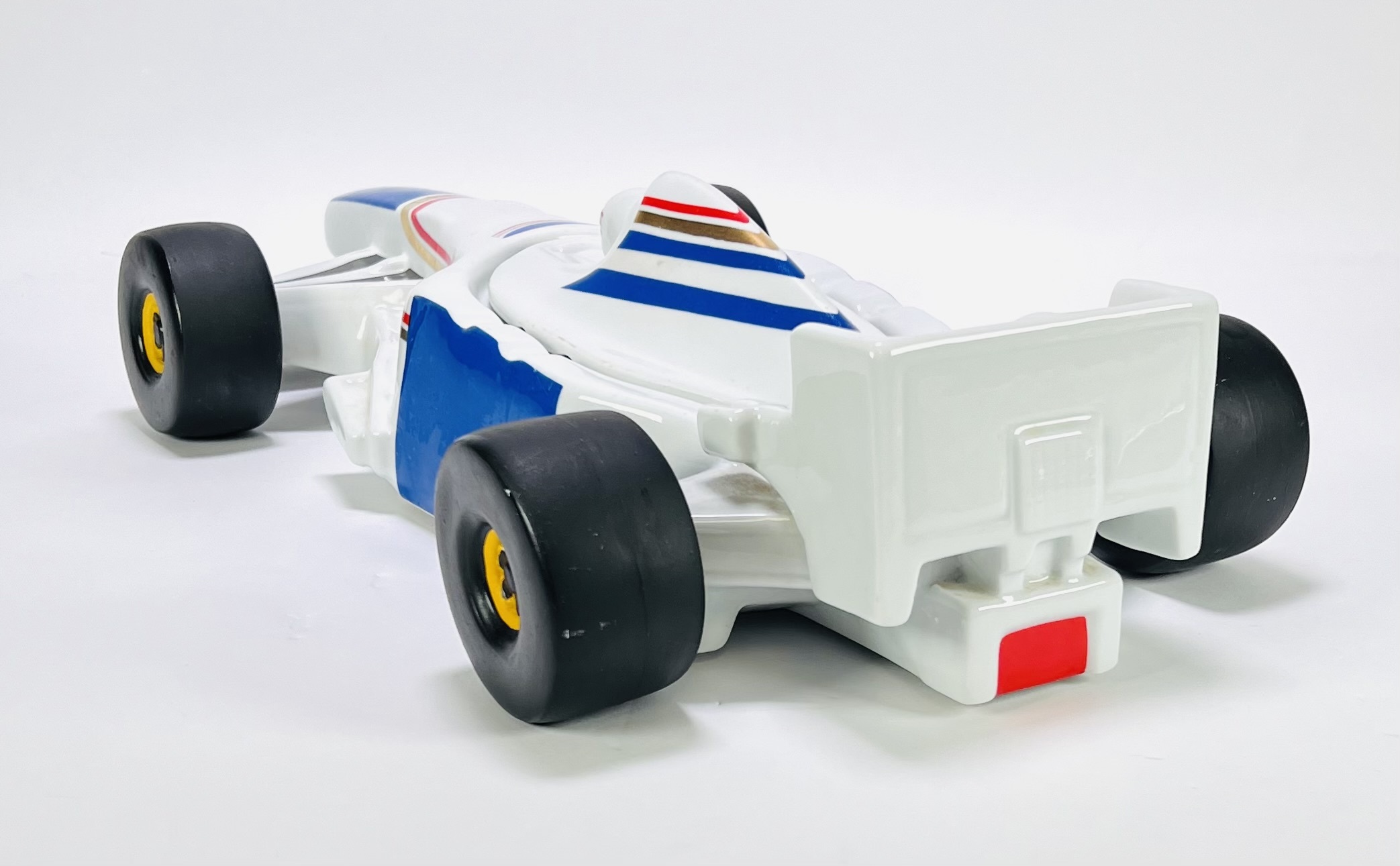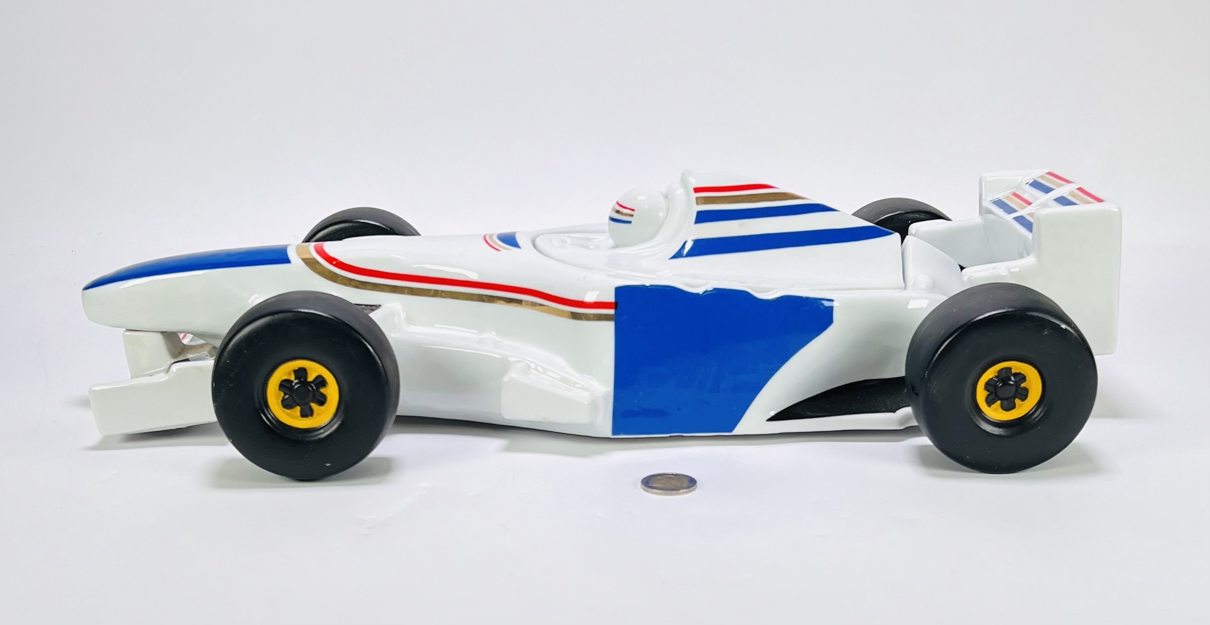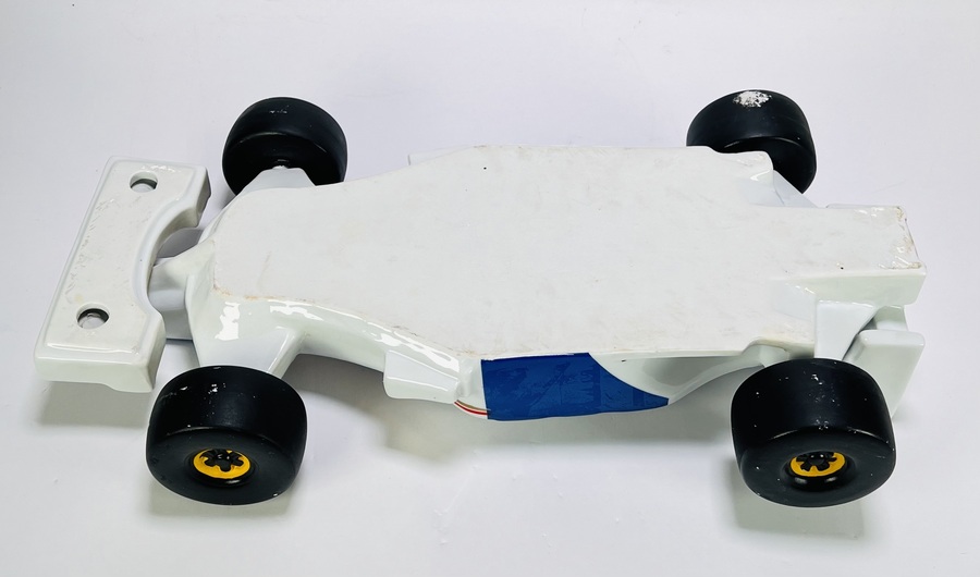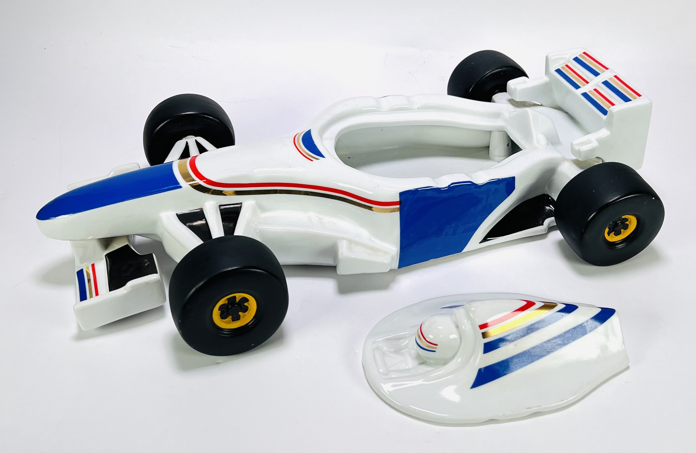 Asbak in de vorm van een Formule 1-auto - Williams F1 team 1996 - in postmoderne stijl, vervaardigd uit keramiek met een geglazuurde techniek. De Formule 1-auto toont een witte basis met blauwe en rode belijning en is voorzien van een afneembaar cockpitdeksel. De asbak dateert uit de jaren '90 en heeft een Europese herkomst. Wil je direct deelnemen? Plaats alvast een schriftelijk bod via onze website! |