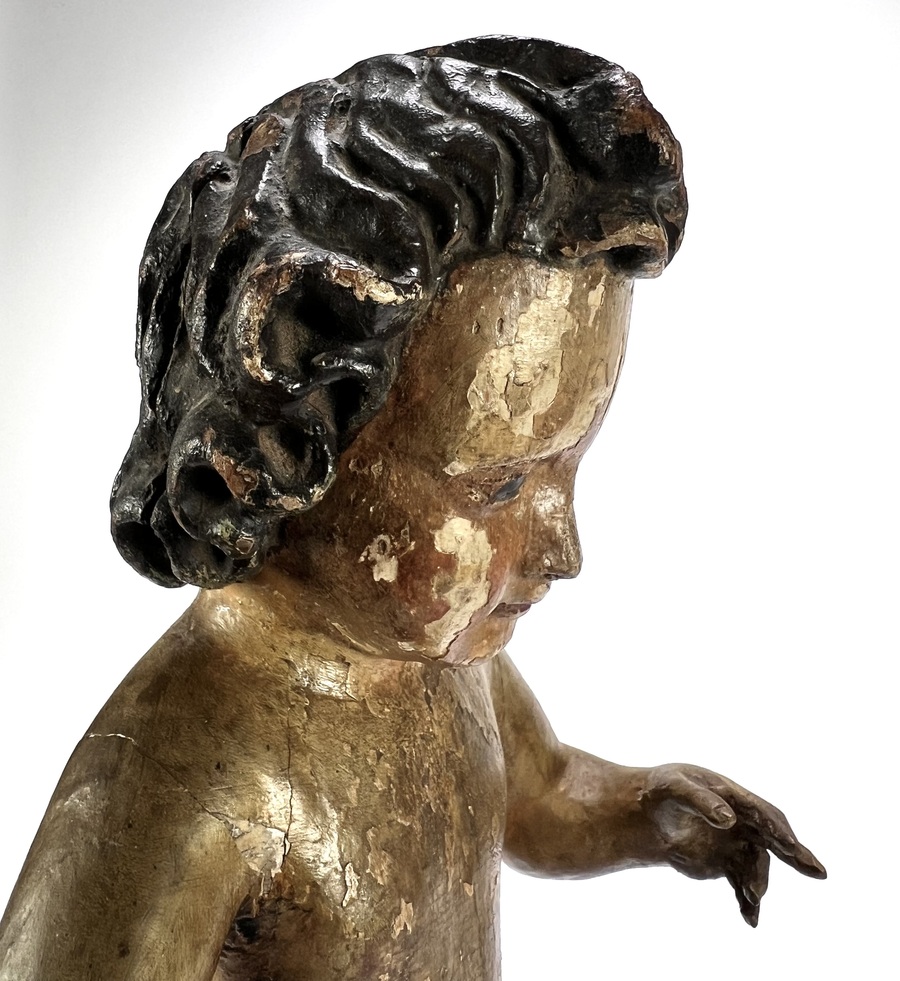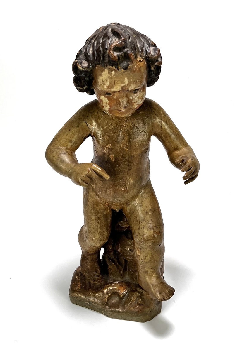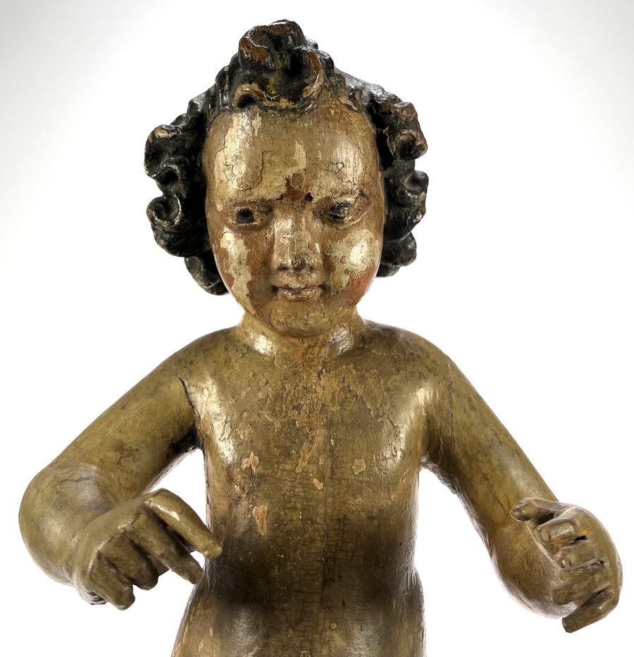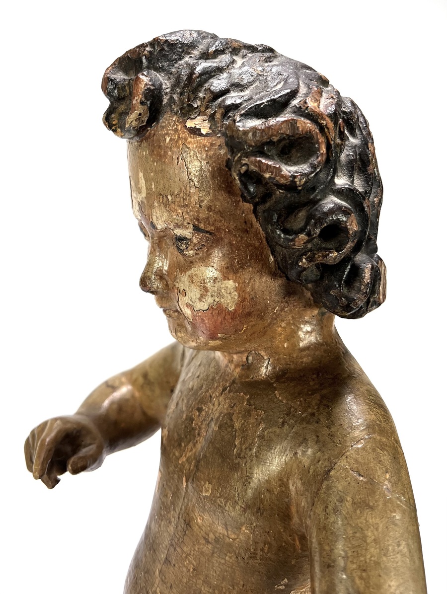 Houten beeld uit de barok periode, eerste helft 18e eeuw, vervaardigd uit hout met polychrome beschildering en vergulding. De staande putto toont karakteristieke diep gesneden krullen in donkere pigmentatie, contrasterend met het goudkleurig afgewerkte lichaam. Het beeld staat op een gepolychromeerde sokkel, herkomst Zuid-Duitsland. Voeg dit beeld toe aan je verzameling en doe een bod! |