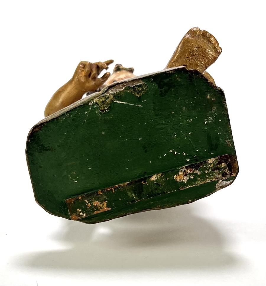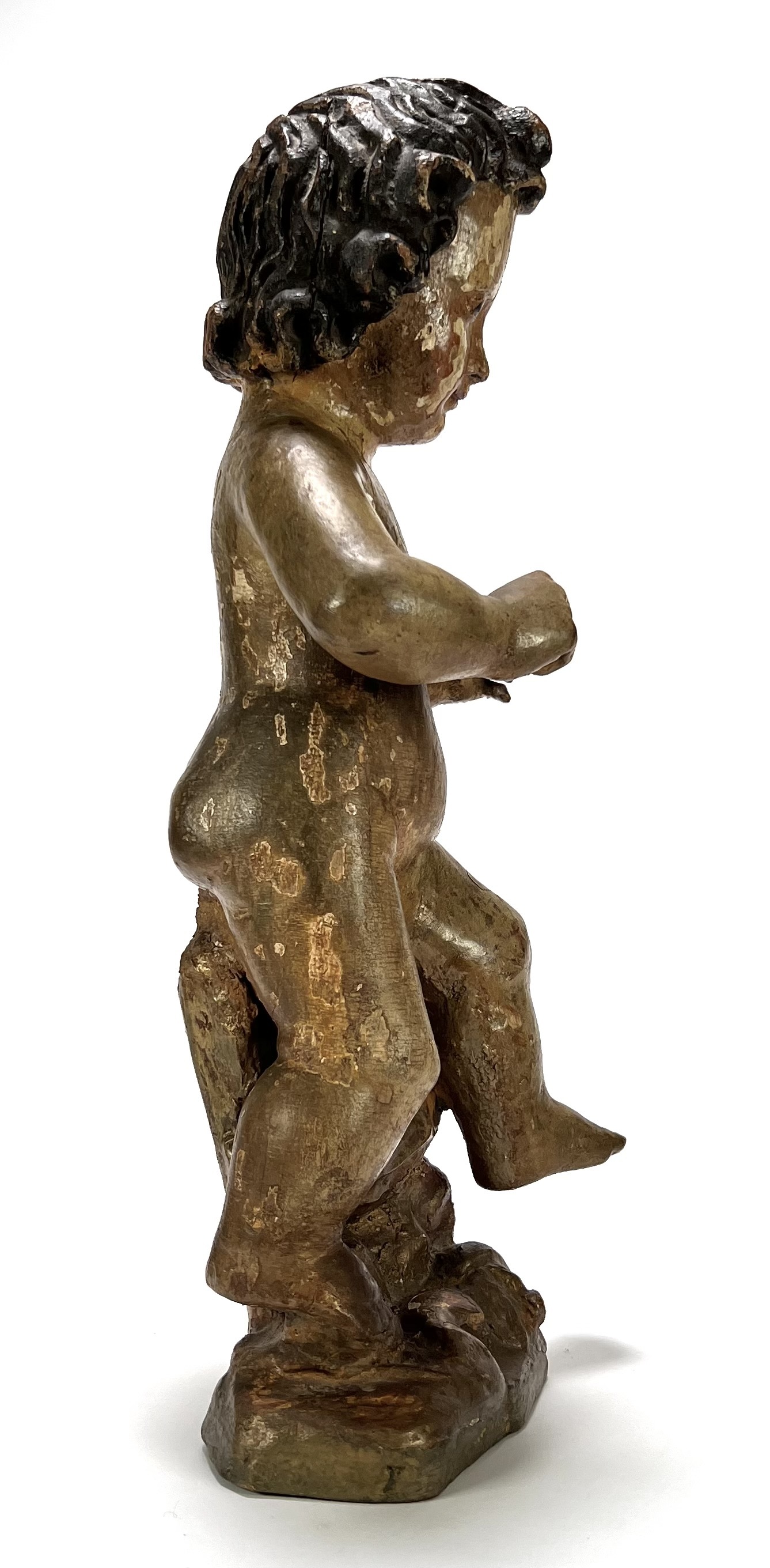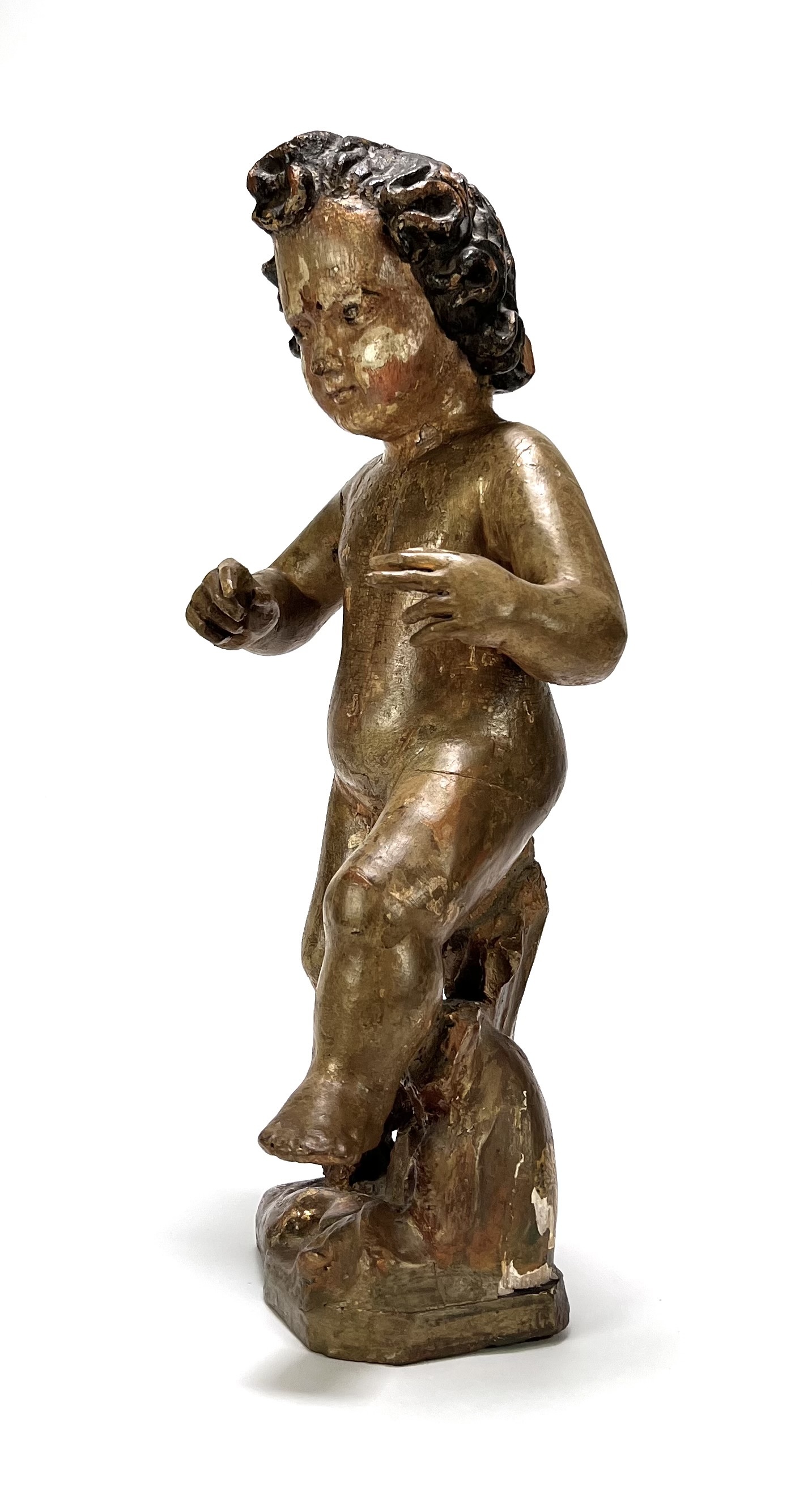 Houten beeld uit de barok periode, eerste helft 18e eeuw, vervaardigd uit hout met polychrome beschildering en vergulding. De staande putto toont karakteristieke diep gesneden krullen in donkere pigmentatie, contrasterend met het goudkleurig afgewerkte lichaam. Het beeld staat op een gepolychromeerde sokkel, herkomst Zuid-Duitsland. Voeg dit beeld toe aan je verzameling en doe een bod! |