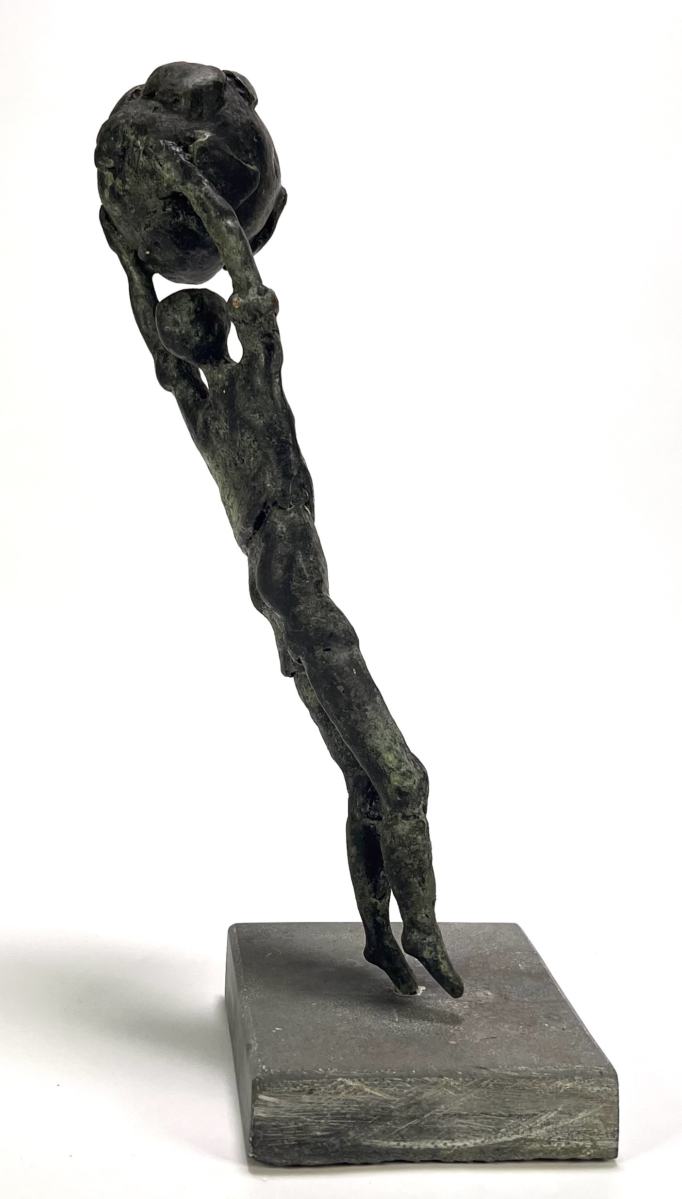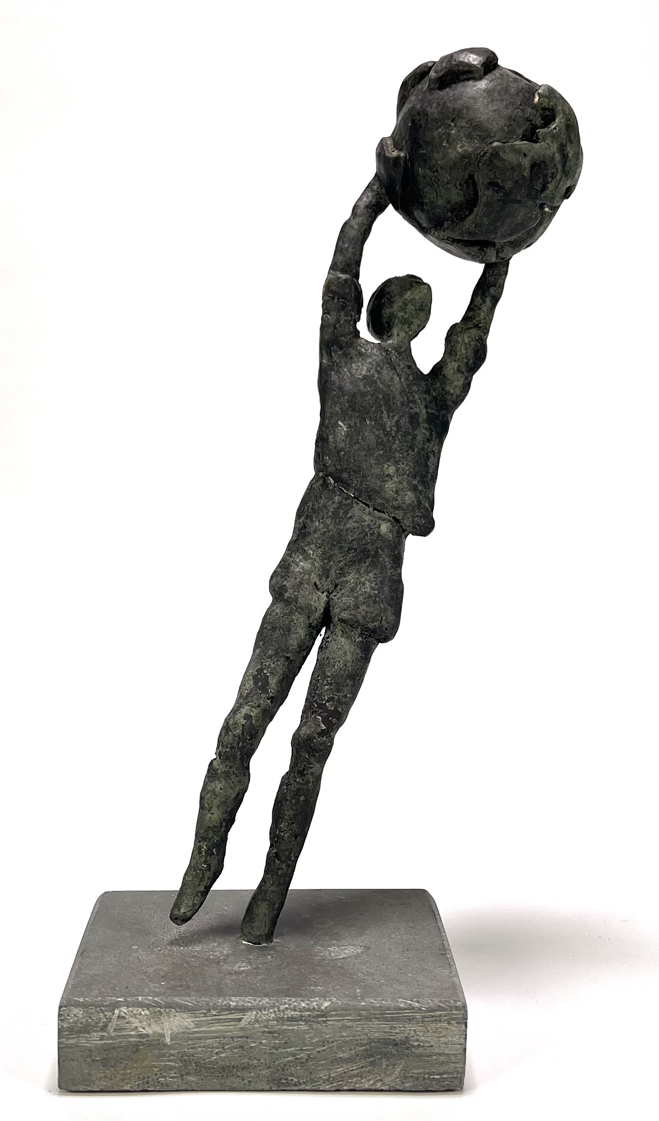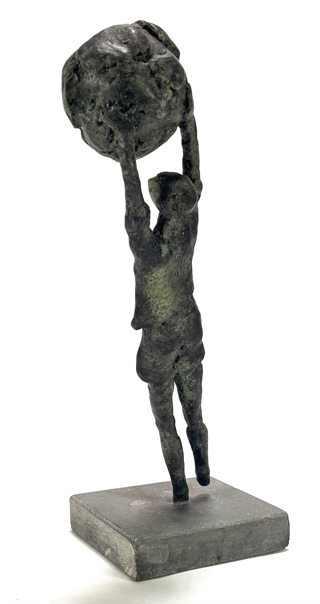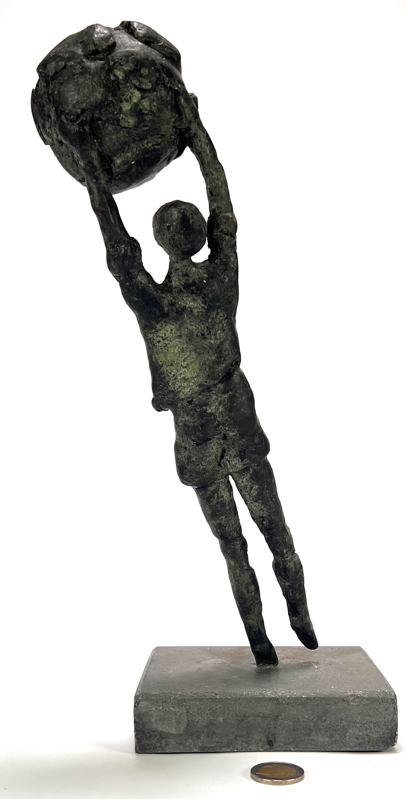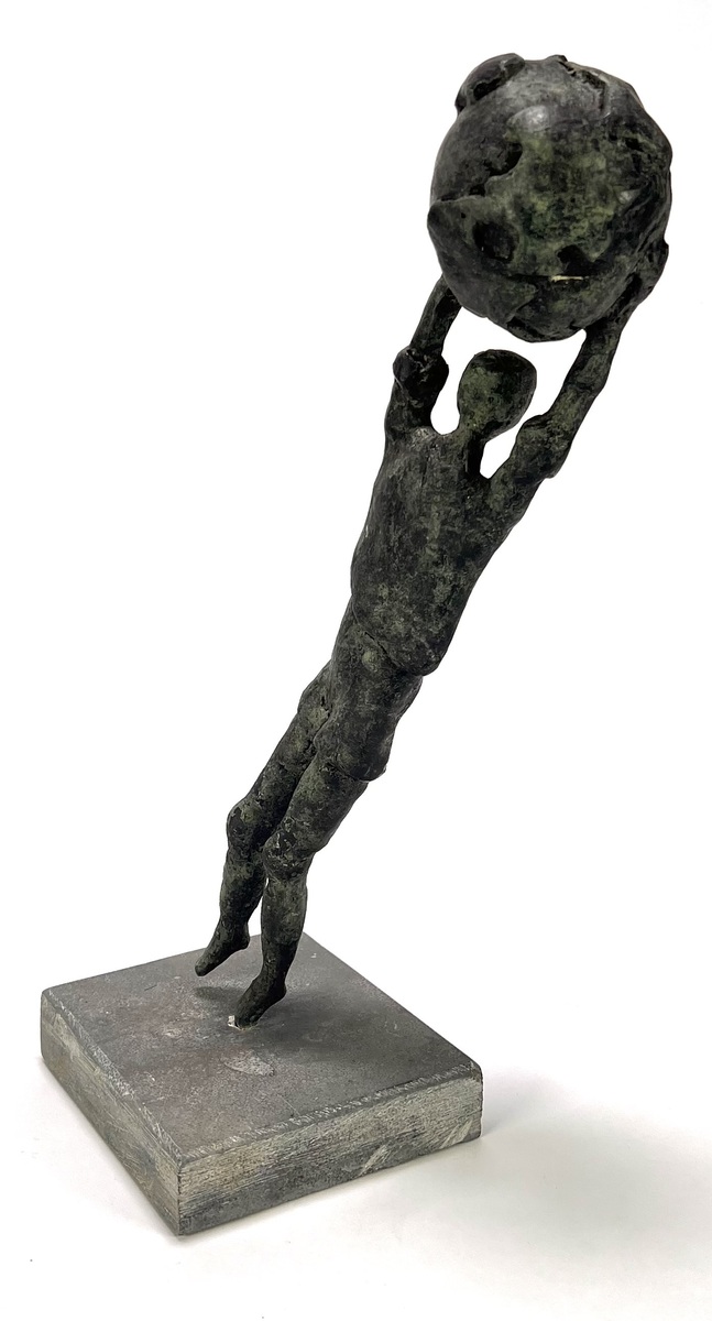 Beeld in figuratief-expressionistische stijl, vervaardigd uit brons op een natuurstenen sokkel met giettechniek. De beeld toont een gestileerde figuur in een dynamische opwaartse beweging die een globe/bal boven het hoofd heft. Het object dateert uit circa 1980 en heeft een West-Europese herkomst. Kom langs tijdens de kijkdagen (10 t/m 12 april) en ontdek dit beeld zelf! |