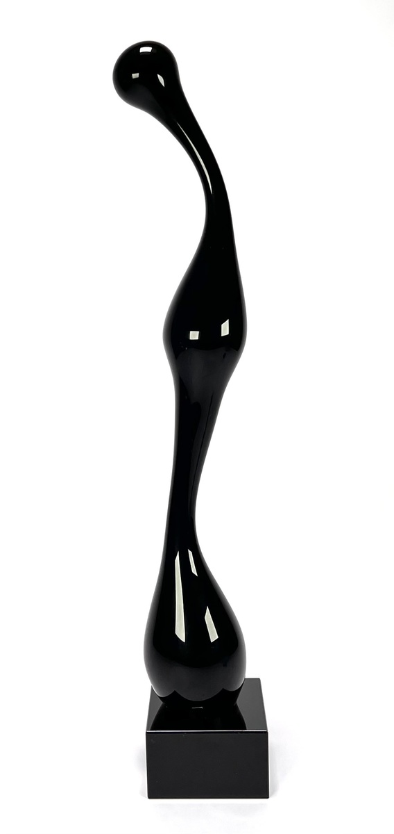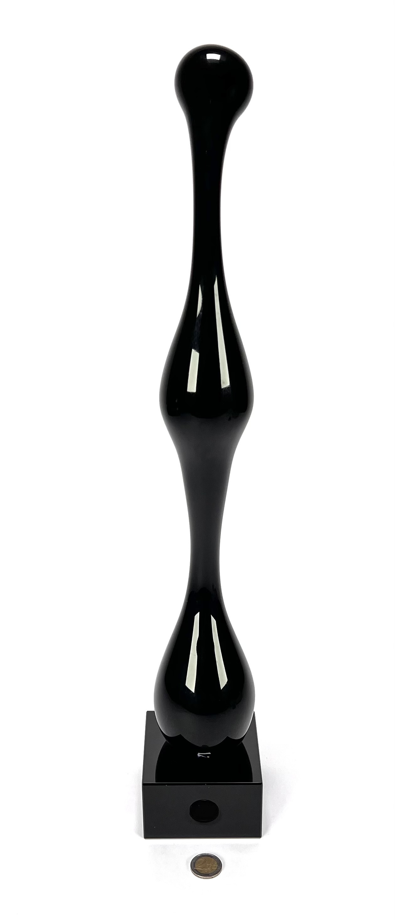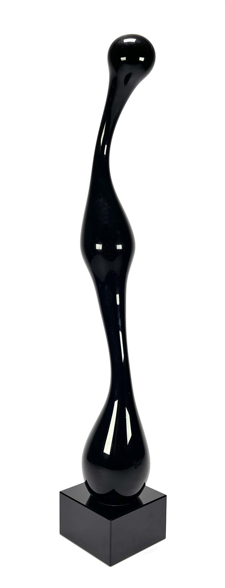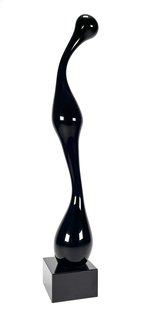 Beeld in postmoderne stijl, vervaardigd uit zwart glas met hoogglanzend gepolijst oppervlak op een stenen basement. De langgerekte sculpturale vorm bestaat uit een bolvormige hoofd, slanke hals, ingesnoerd midden en peervormige onder partij, waardoor een gestileerd menselijk silhouet ontstaat. Het beeld dateert uit circa 1980–1995. Klaar om te bieden? Registreer je nu en doe mee aan de veiling! |