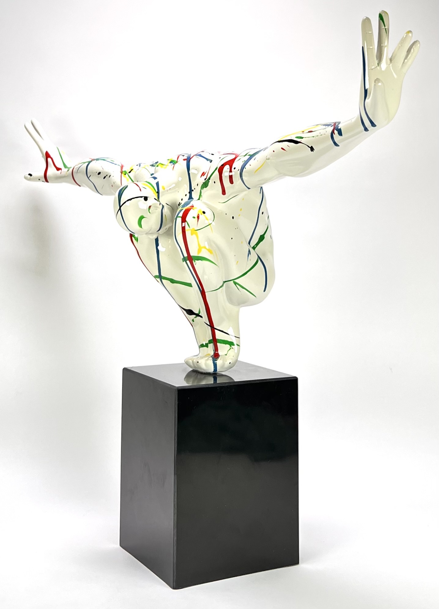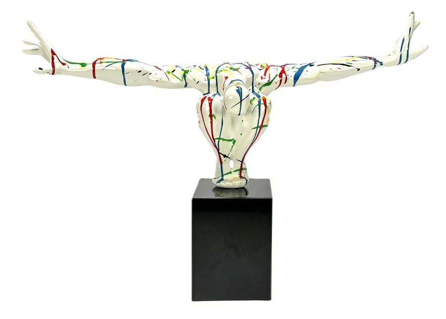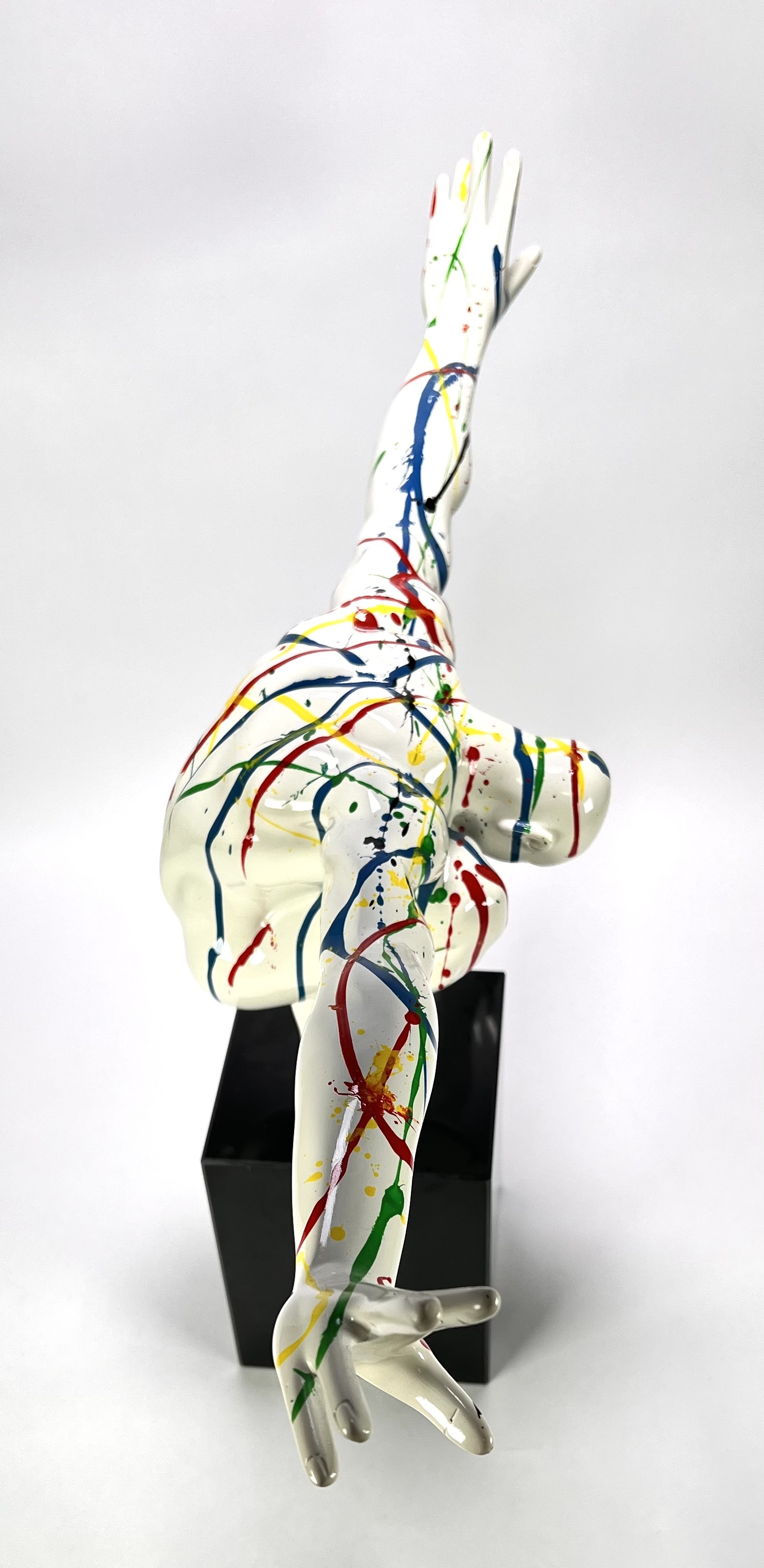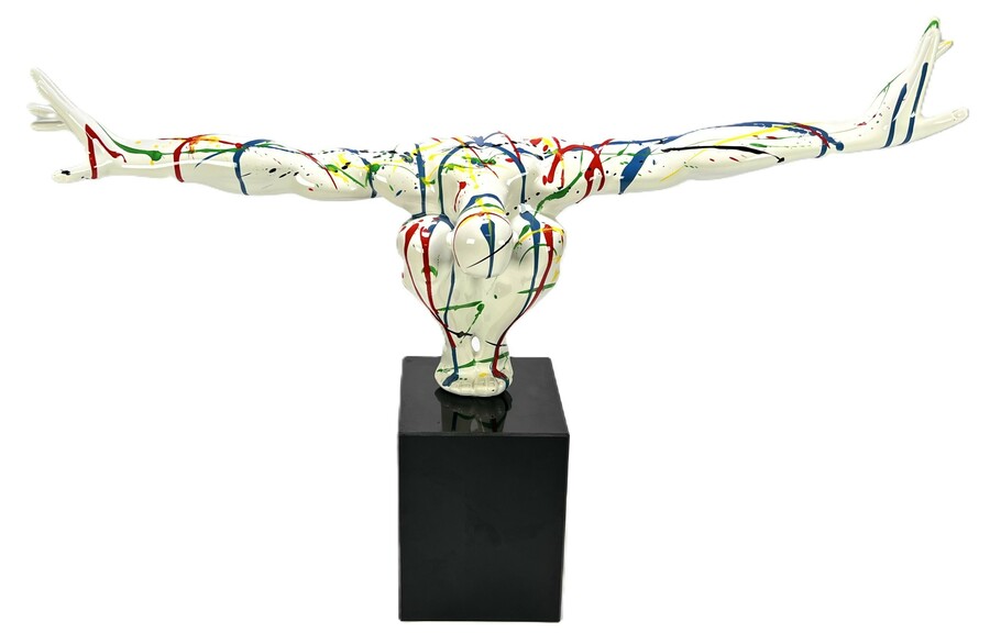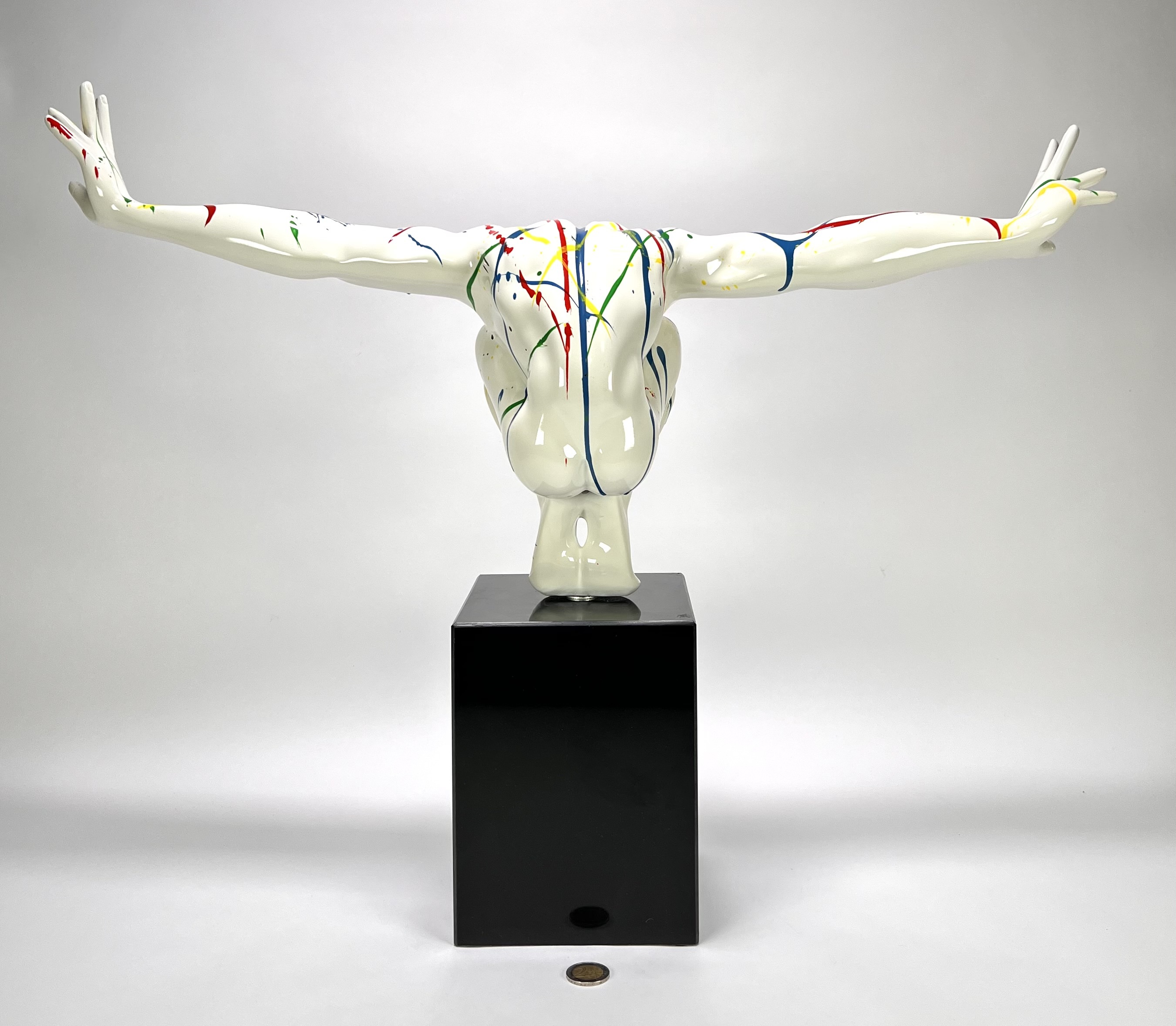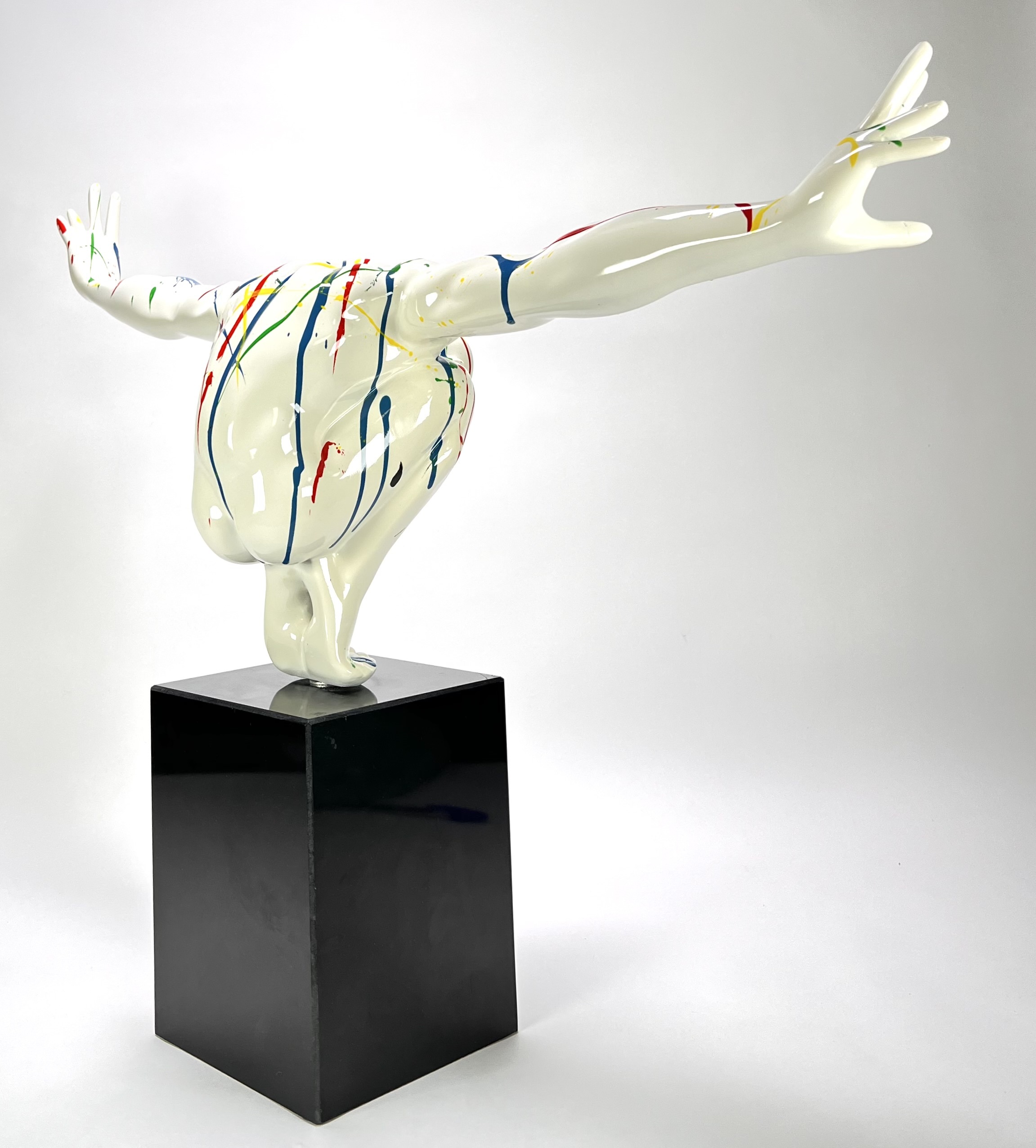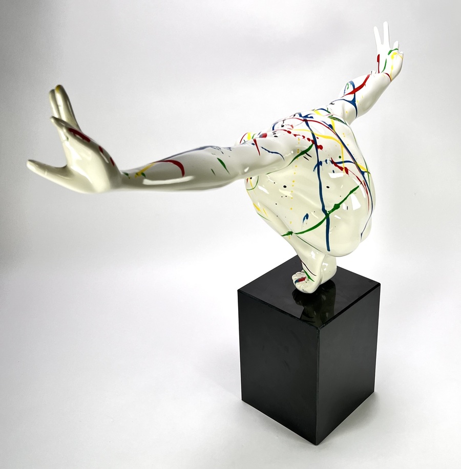 Beeld "Diving man" in de stijl van het postmodernisme, vervaardigd uit kunststof met een hoogglans polychrome afwerking. Het dynamische figuur toont een duikende man met wijd gespreide armen, gedecoreerd met primaire kleuren op een witte fond. Het beeld is gemonteerd op een zwarte kubusvormige stenen sokkel. Het beeld dateert uit de 21e eeuw en heeft een Europese herkomst. Klaar om te bieden? Registreer je nu en doe mee aan de veiling! |