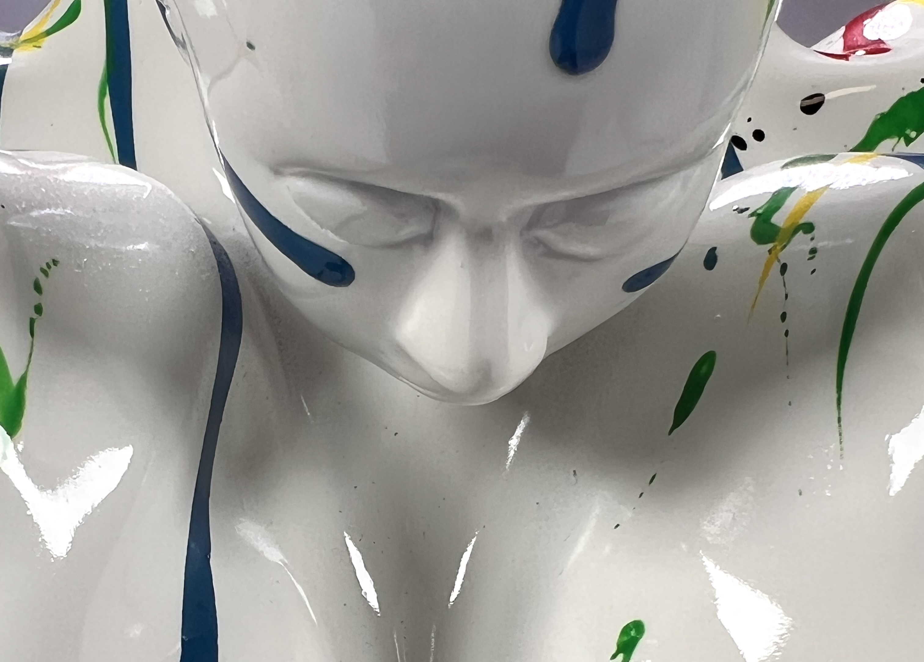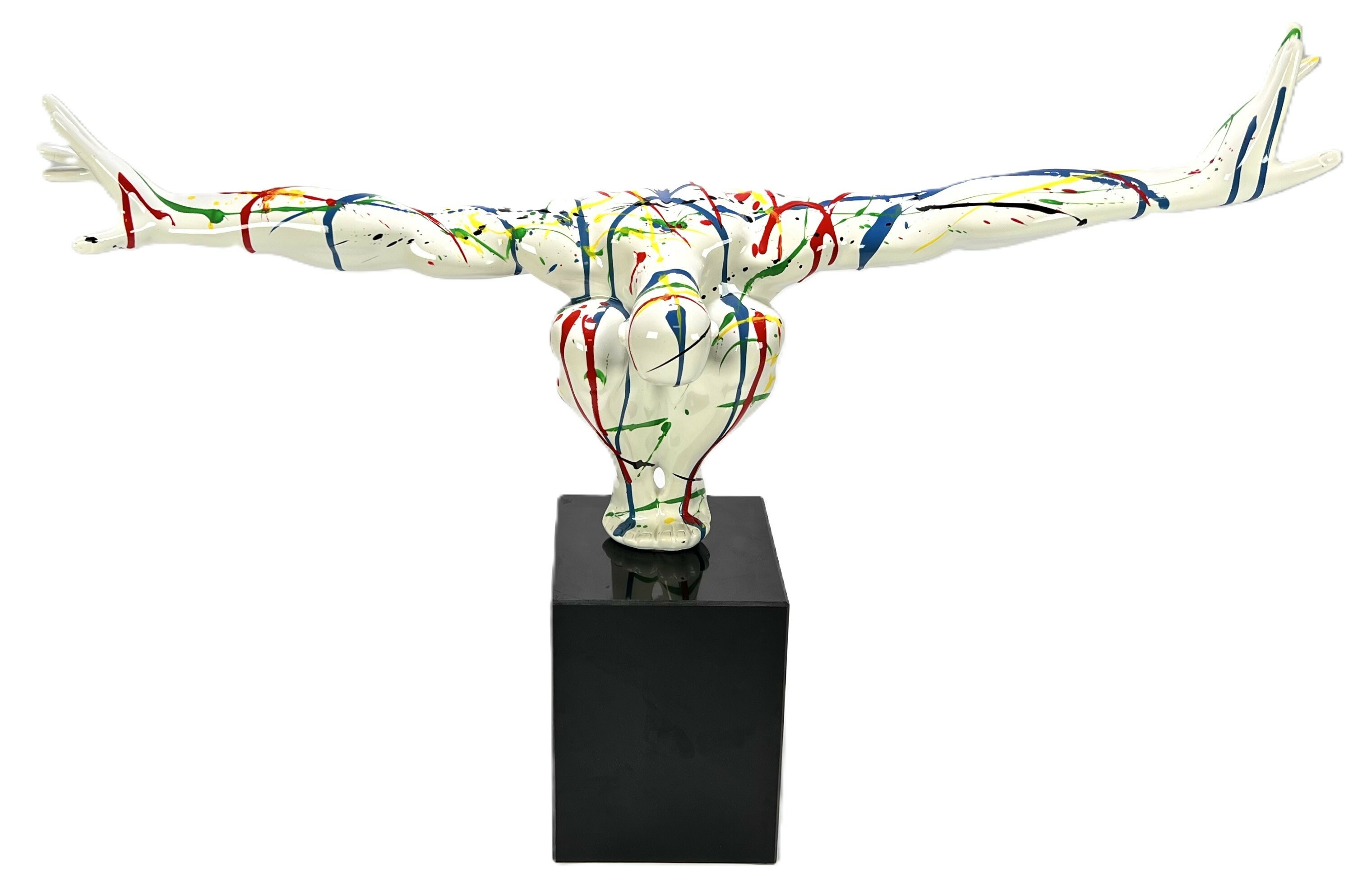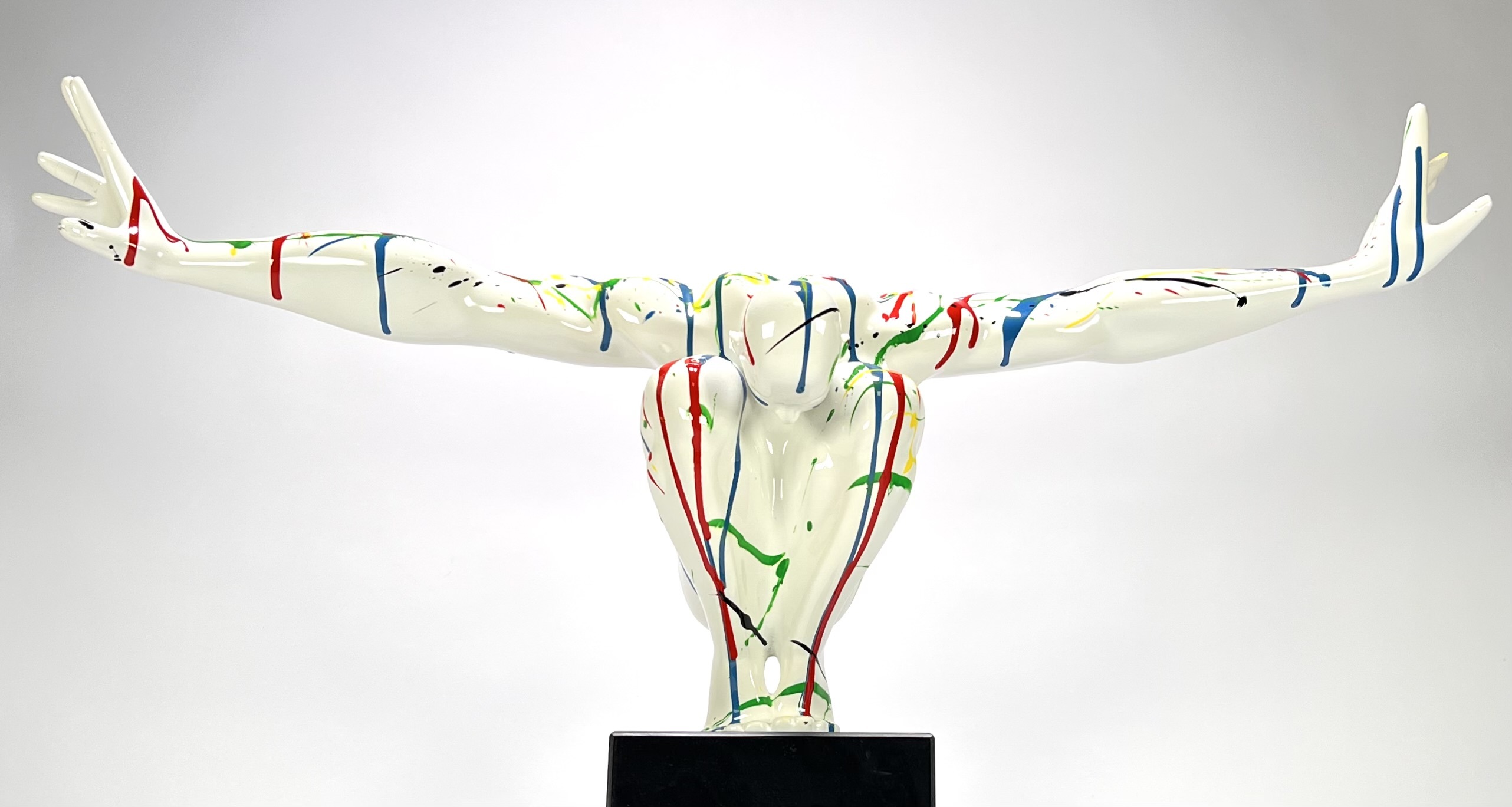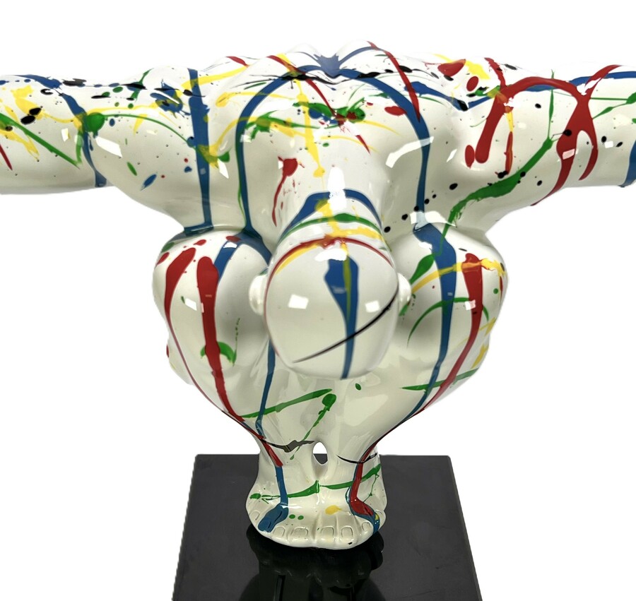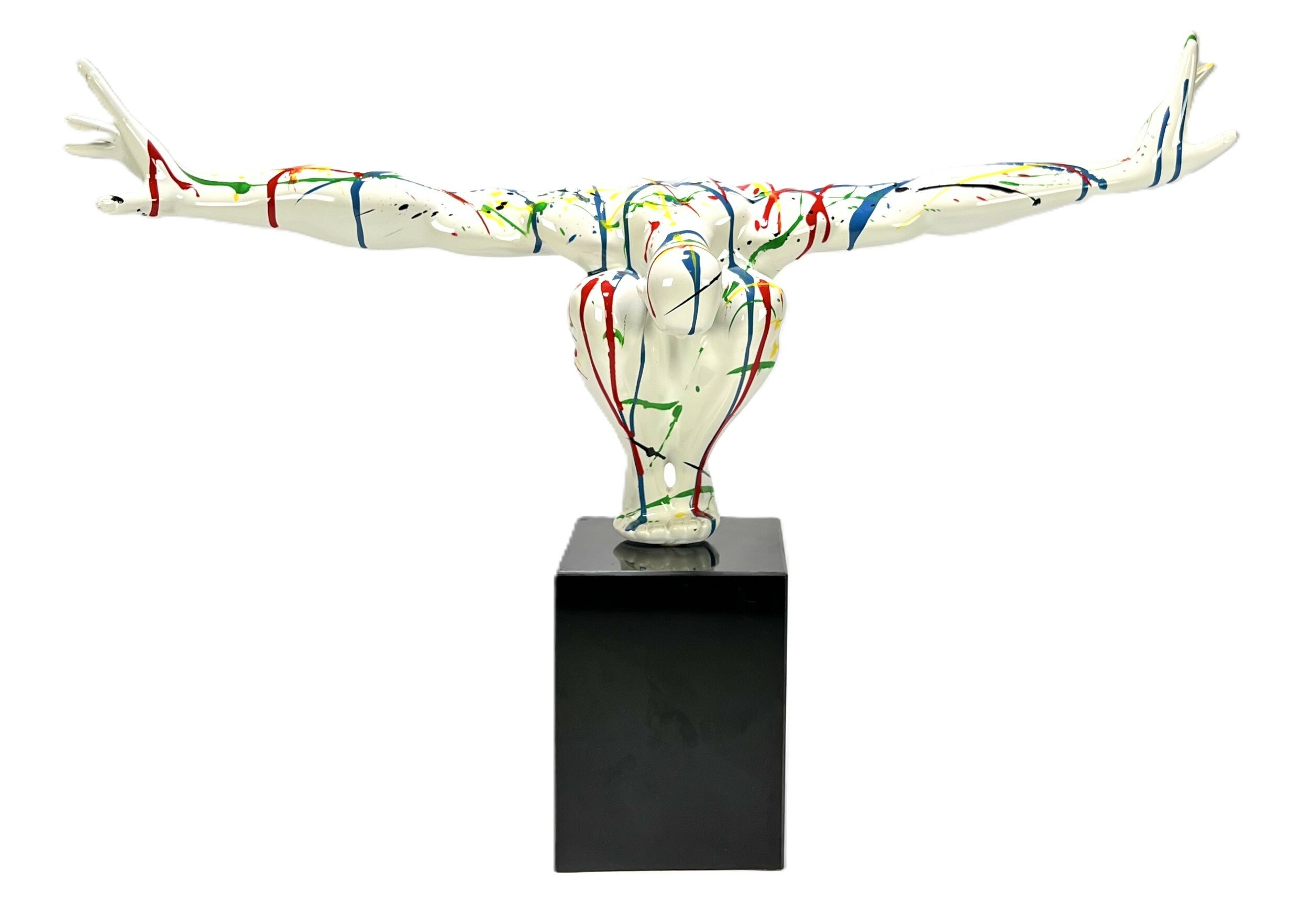 Beeld "Diving man" in de stijl van het postmodernisme, vervaardigd uit kunststof met een hoogglans polychrome afwerking. Het dynamische figuur toont een duikende man met wijd gespreide armen, gedecoreerd met primaire kleuren op een witte fond. Het beeld is gemonteerd op een zwarte kubusvormige stenen sokkel. Het beeld dateert uit de 21e eeuw en heeft een Europese herkomst. Klaar om te bieden? Registreer je nu en doe mee aan de veiling! |