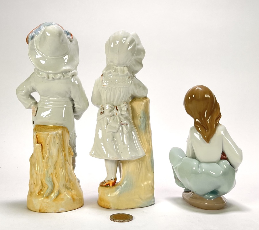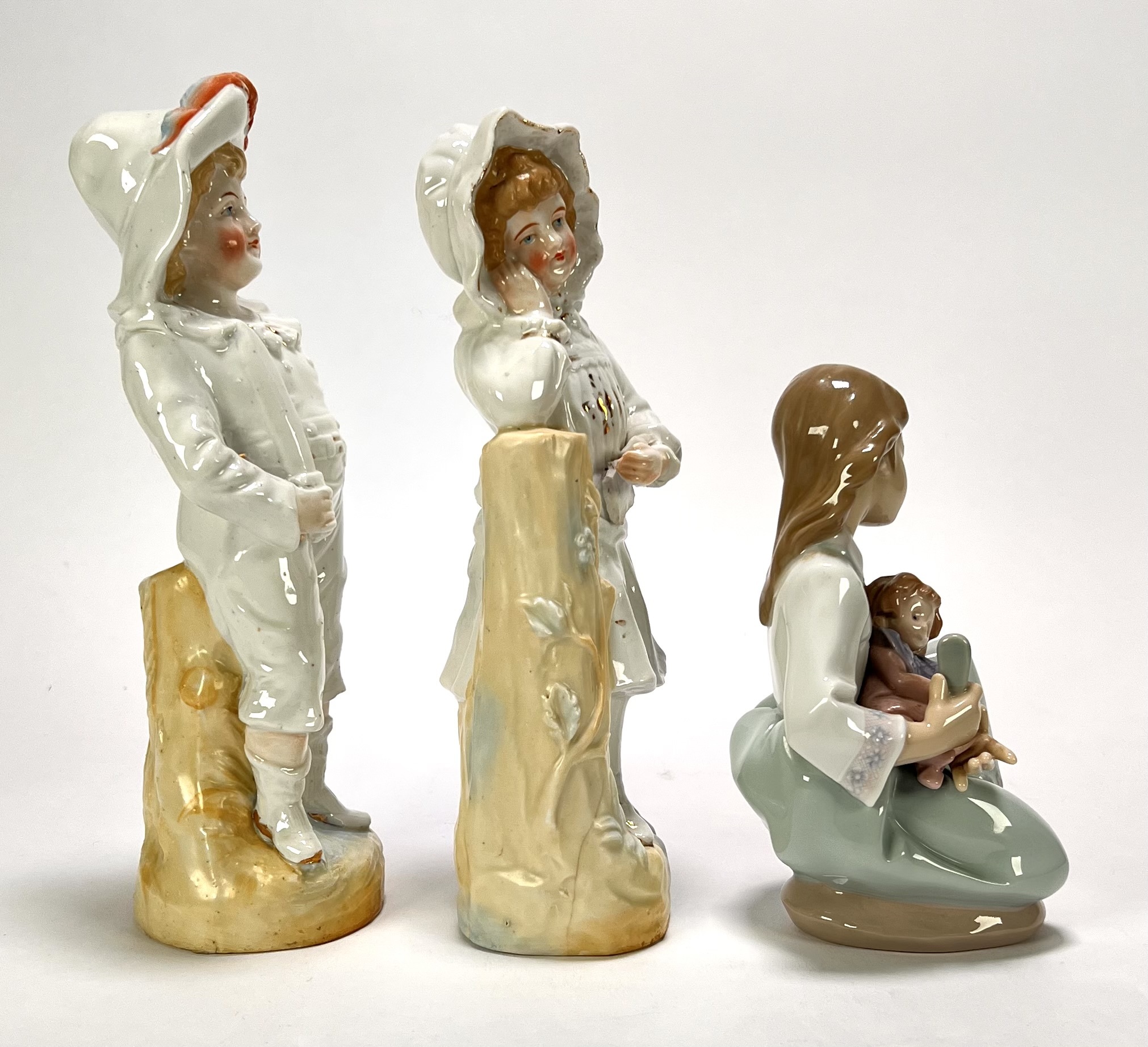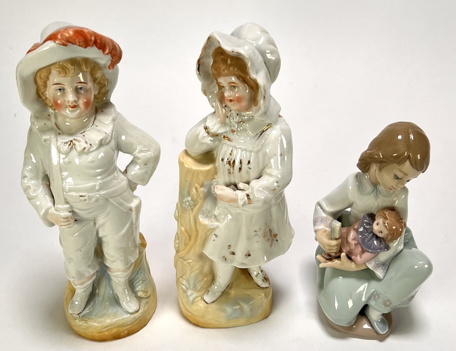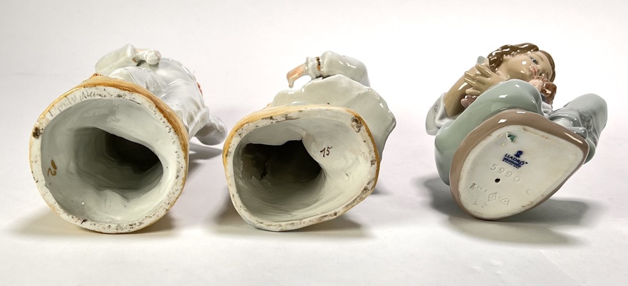 Drie beeldjes, een van Lladro Spanje en twee continentale makelij uit de late 19e en 20e eeuw, vervaardigd uit porselein met polychrome beschildering. De selectie bevat een gemerkt Lladro beeldje van een meisje met pop, modelnummer 5990 "Thoughtful Caress", uitgevoerd in karakteristieke pasteltinten. Daarbij beelden van een man en vrouw bij een boomstam met details in goudkleur. Dit stel beeldjes zelf beoordelen? Je bent welkom op onze kijkdagen op 10, 11 en 12 april! |