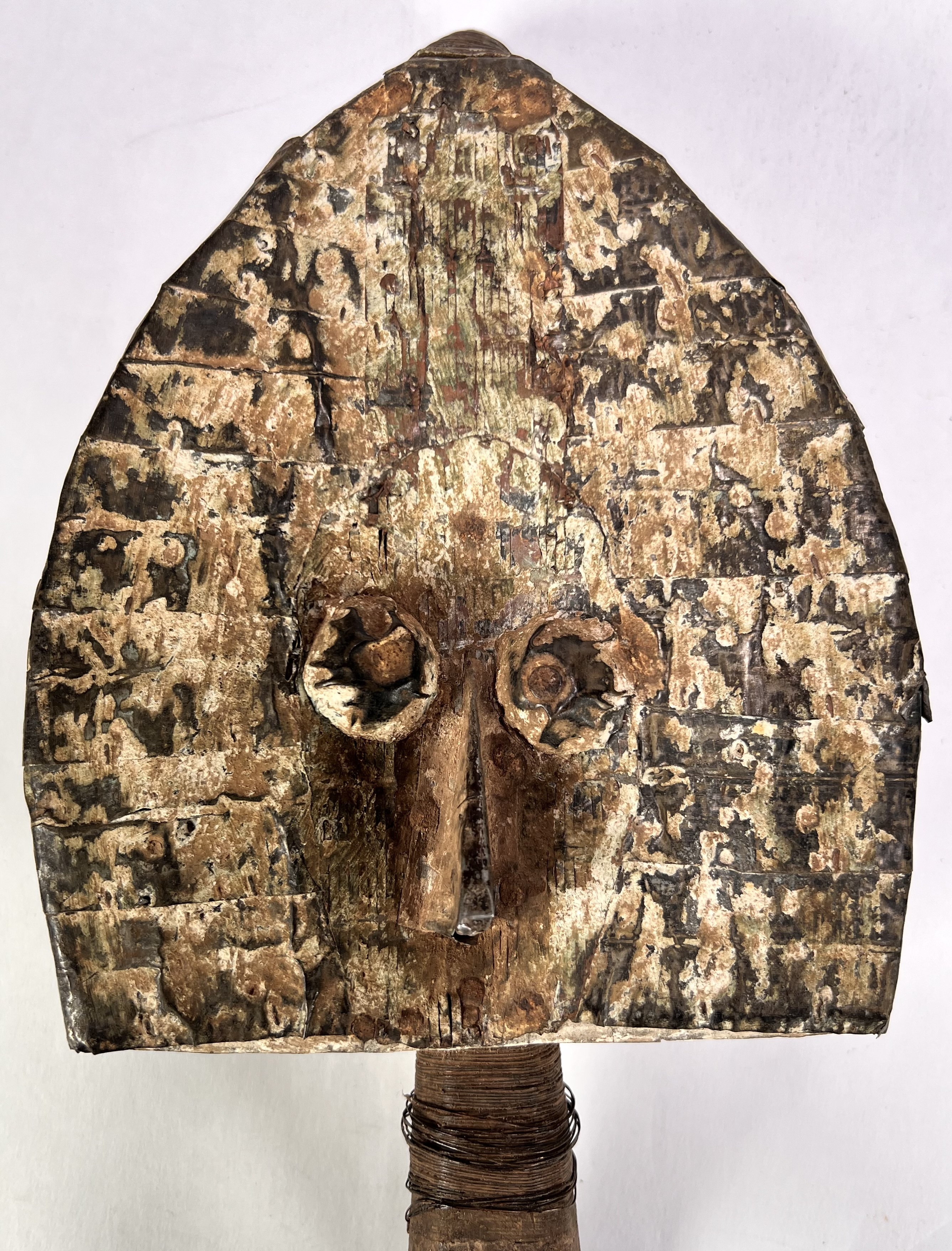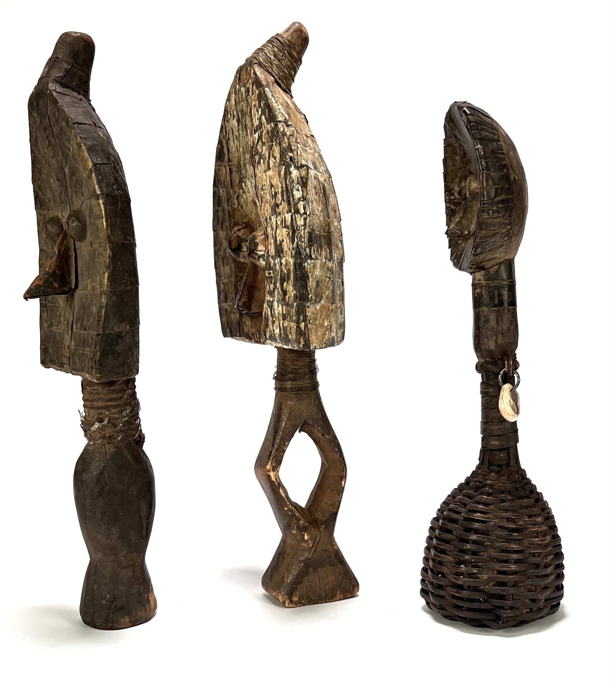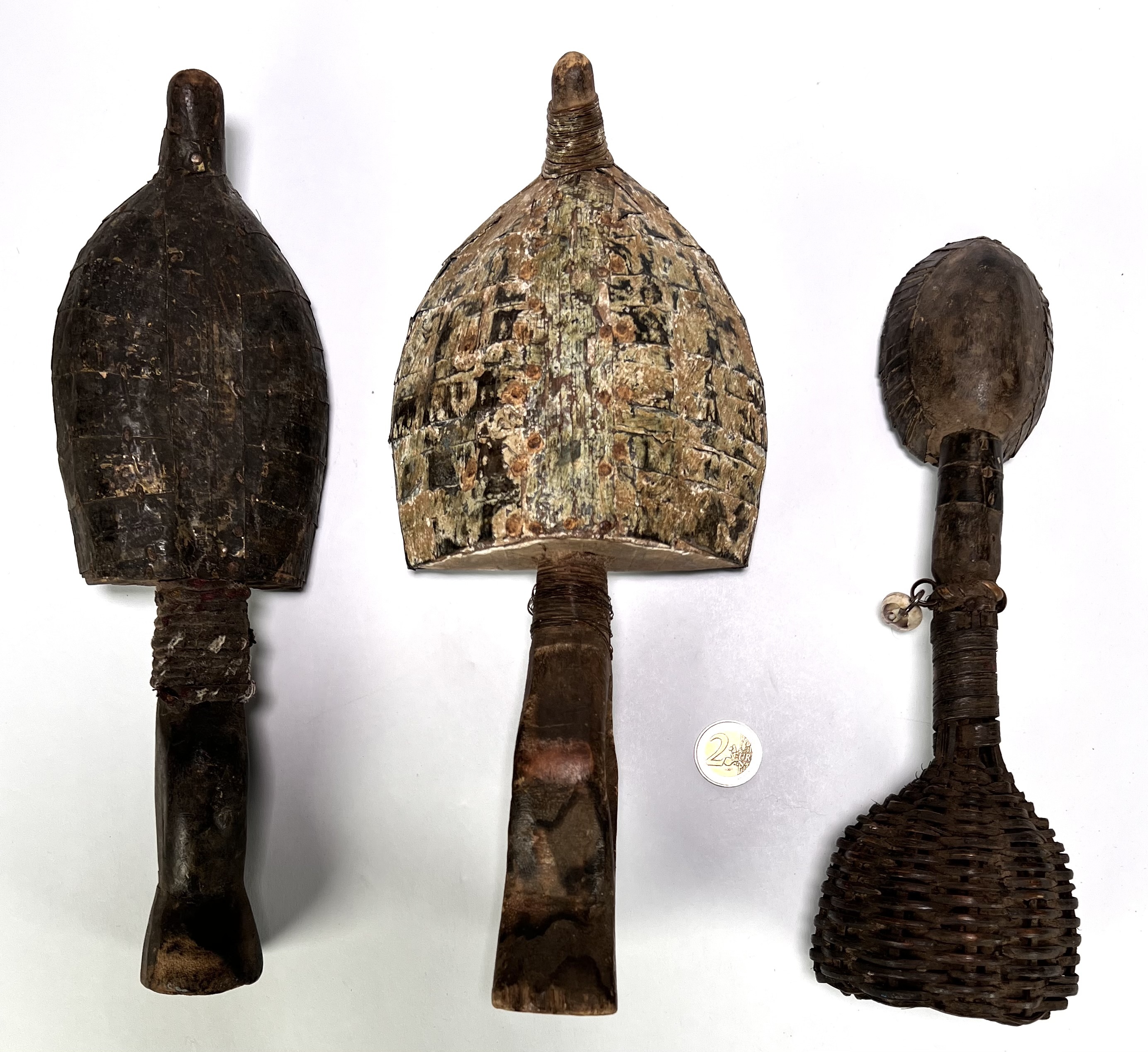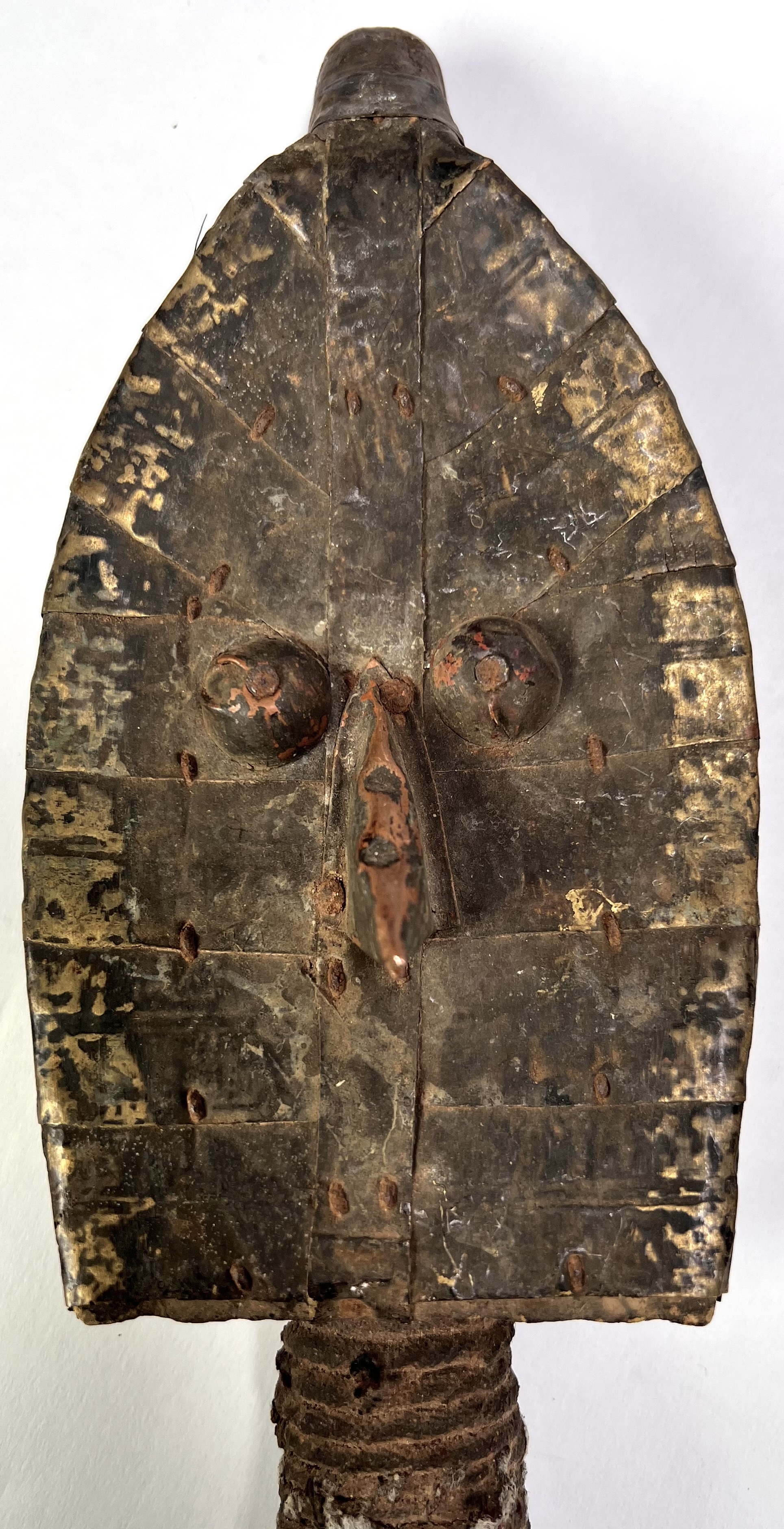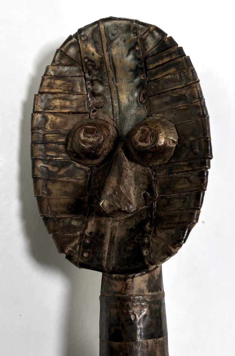 Mahongwe reliekhouders uit Gabon, midden 20e eeuw, vervaardigd uit hout bekleed met messing en koperen lamellen. Deze zogeheten boho-na-ulu figuren uit de Kota-traditie tonen concave gezichten met geprononceerde ogen en centrale neusrug en fungeerden als bewakers van voorouderlijke reliekmanden. Eén exemplaar heeft een basis in pitriet. Klaar om te bieden? Registreer je nu en doe mee aan de veiling! |