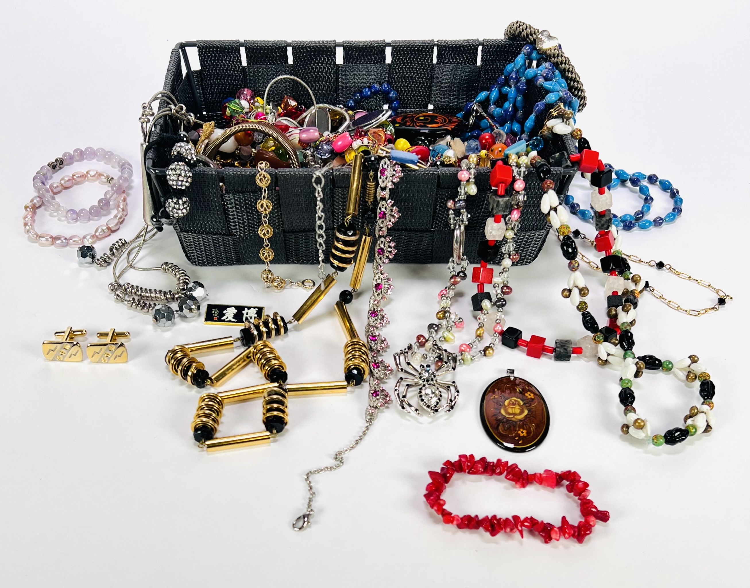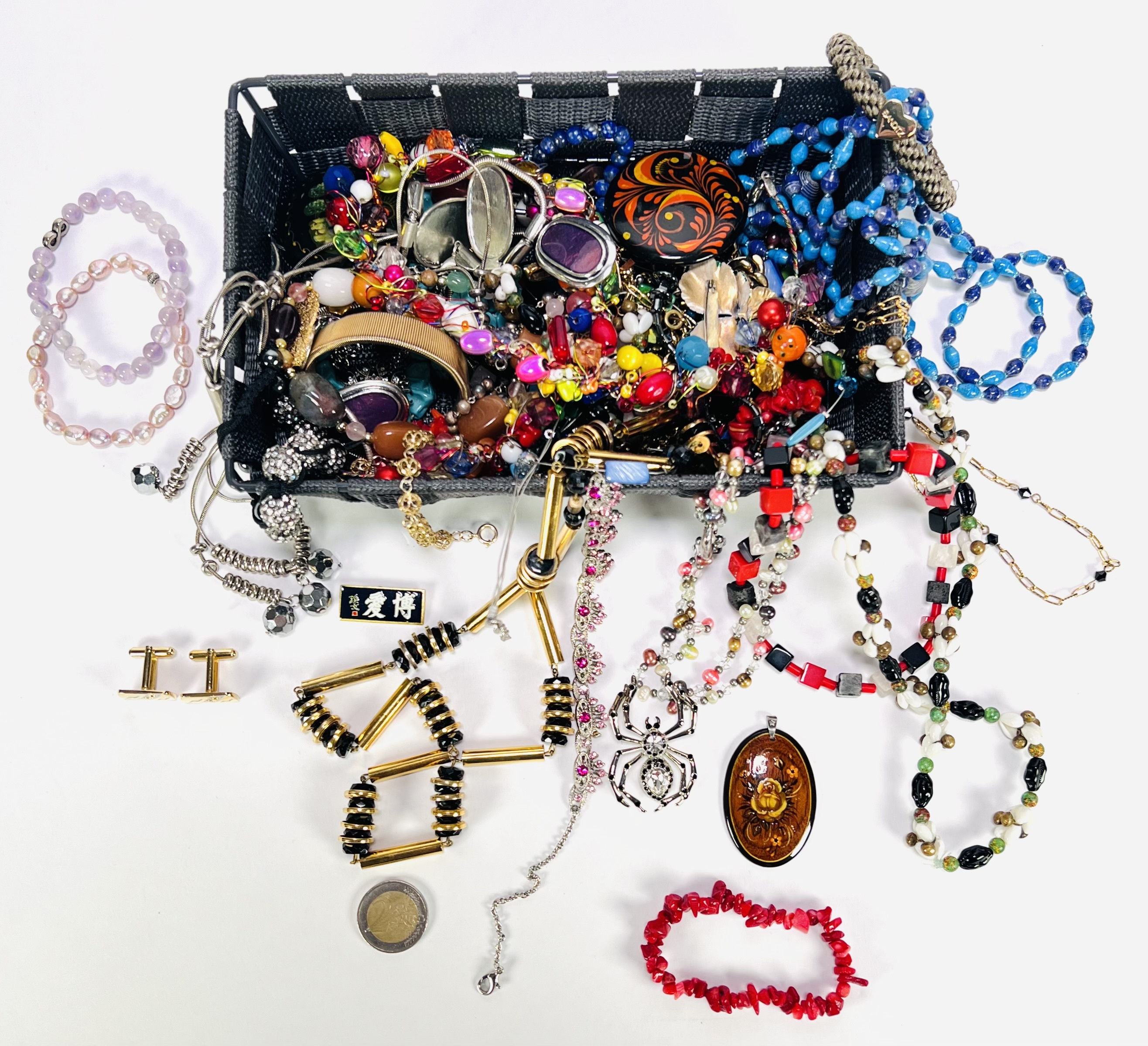 Bijouterie in eclectische stijl, bestaande uit een gevarieerde partij kettingen, armbanden, broches en manchetknopen, vervaardigd uit metaal, glas, kunststof en halfedelstenen met rijg- en schakeltechnieken. De samenstelling toont uiteenlopende kleurcombinaties, vormen en materialen, waaronder kralen, cabochons en decoratieve hangers. De partij dateert uit de tweede helft van de 20e eeuw. Wil je direct deelnemen? Plaats vanaf 3 april alvast een schriftelijk bod via onze website! |