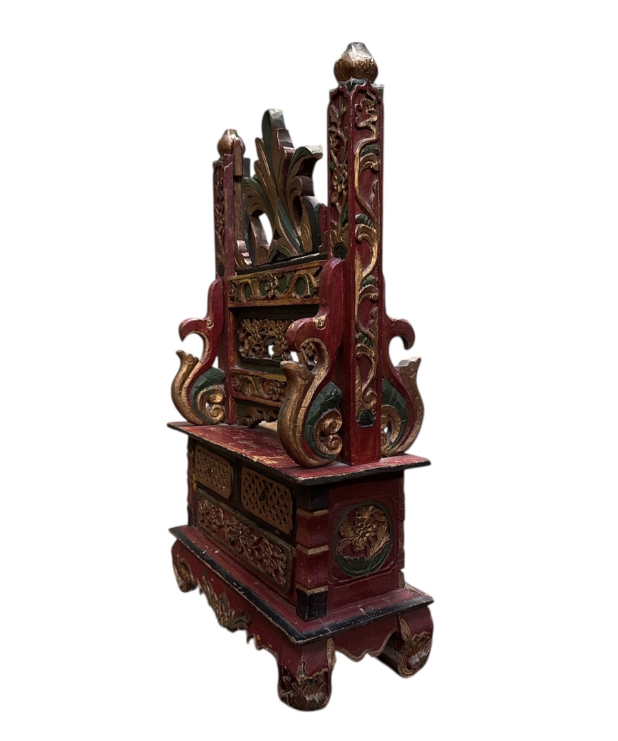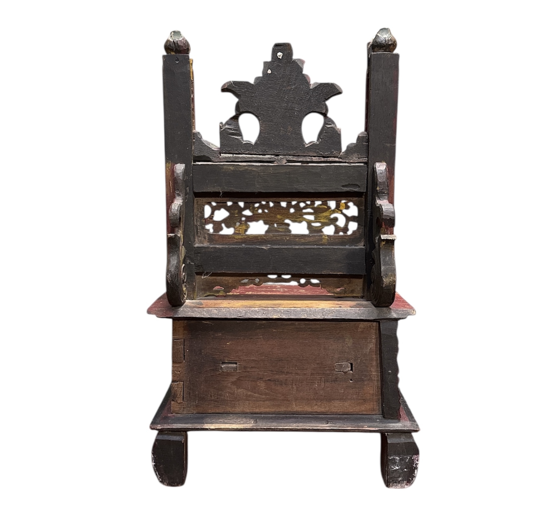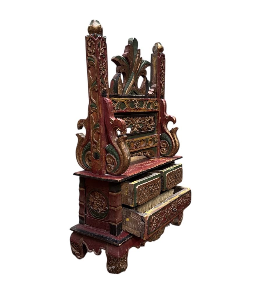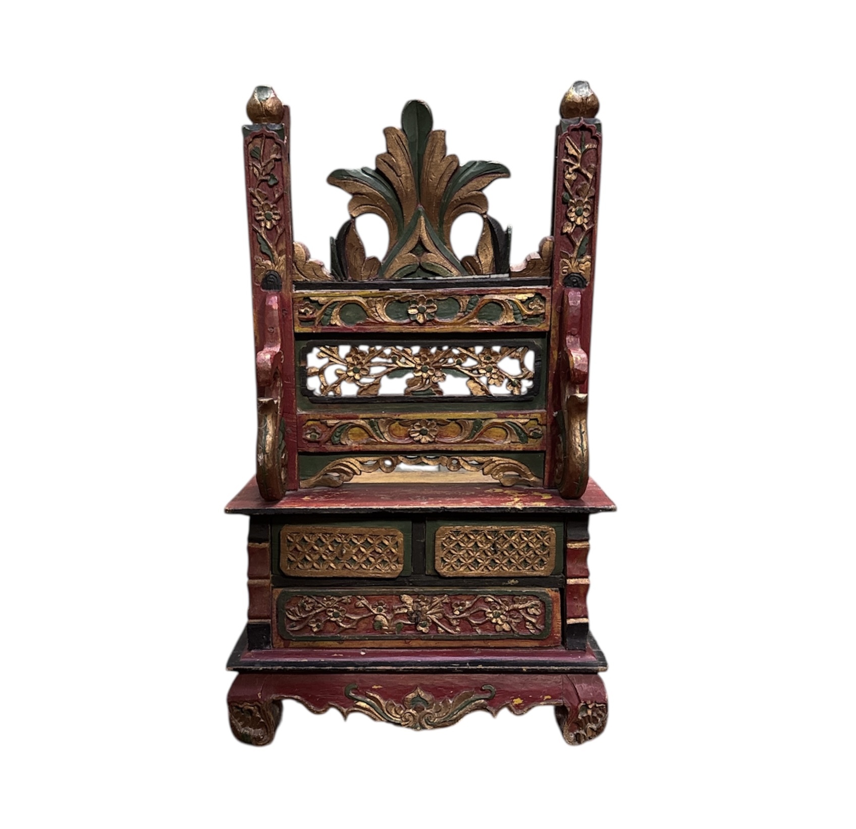 Javaanse botekan in koloniaal barokke stijl, vervaardigd uit handgestoken teakhout met polychrome beschildering en goudkleurige details. Het toiletmeubel toont gedetailleerd ajourwerk met florale motieven en is voorzien van drie laden met geometrische patronen, bekroond door een omvangrijk gedecoreerd topstuk. Het dateert uit het einde van de 19e eeuw en is afkomstig uit Centraal-Java. Wil je direct deelnemen? Plaats vanaf 3 april alvast een schriftelijk bod via onze website! |