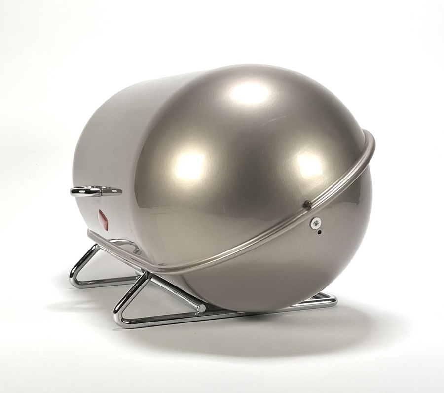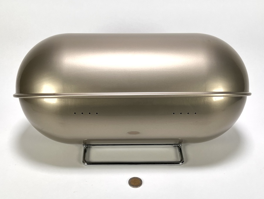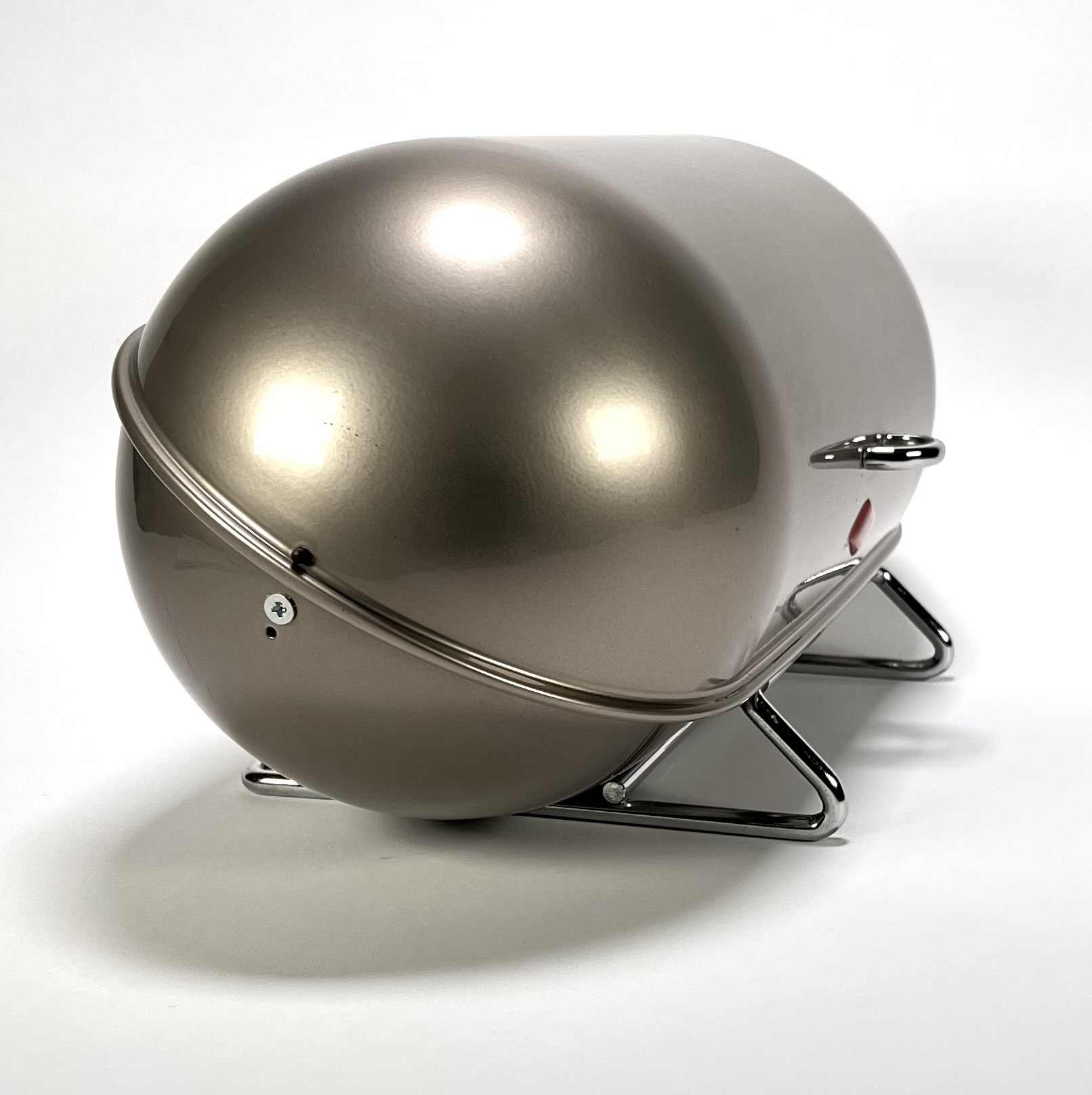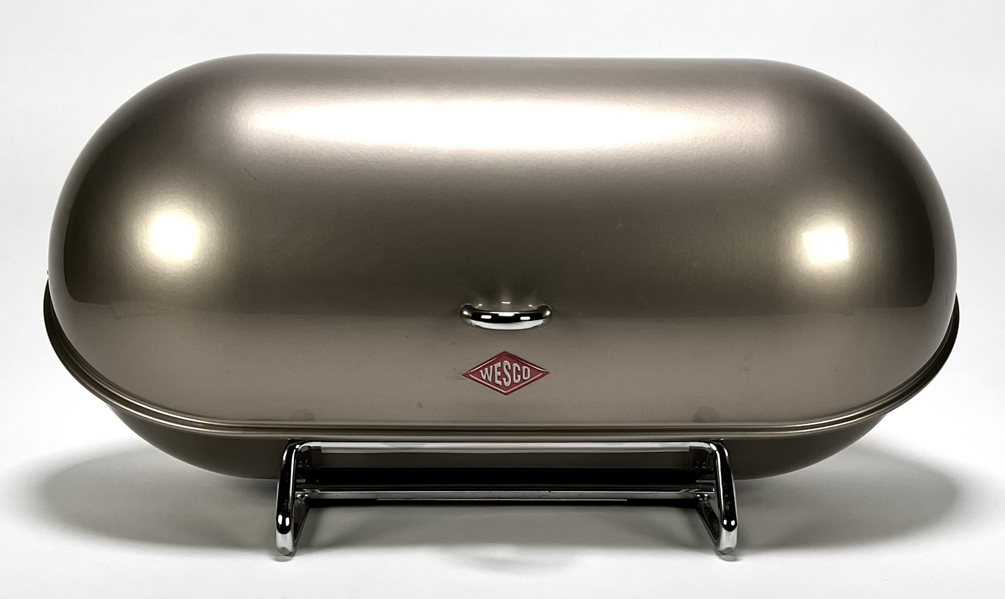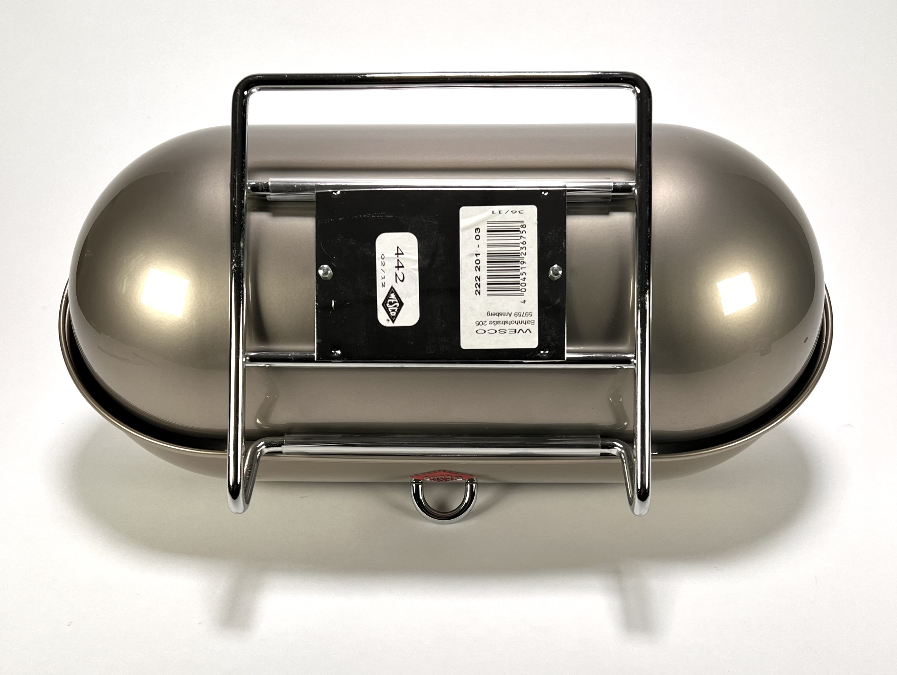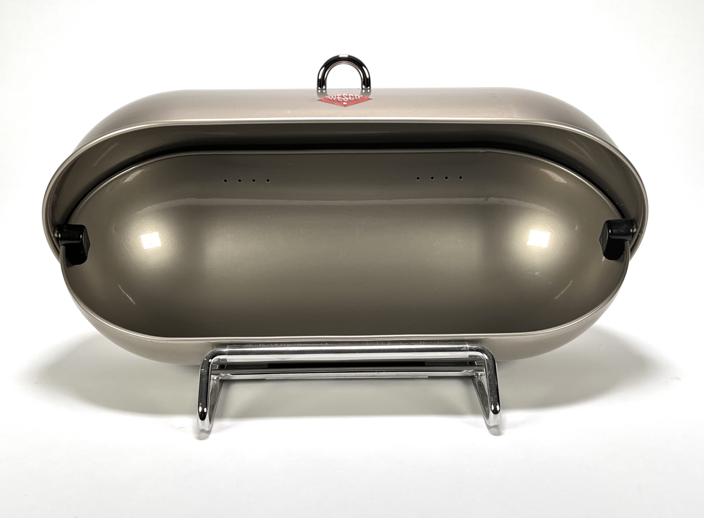 Broodtrommel van Wesco in Space Age stijl, vervaardigd uit hoogwaardig gepoedercoat plaatstaal met een champagnekleurige metallic finish. Het capsulevormige ontwerp, model Breadboy, rust op een verchroomd metalen draadonderstel en is voorzien van ventilatieopeningen aan de achterzijde. Gemerkt met het rode Wesco-embleem. De broodtrommel dateert van circa 2010 en heeft een herkomst in Duitsland. Wil je de broodtrommel in het echt bekijken? Kom naar de kijkdagen op 10, 11 3n 12 april! |