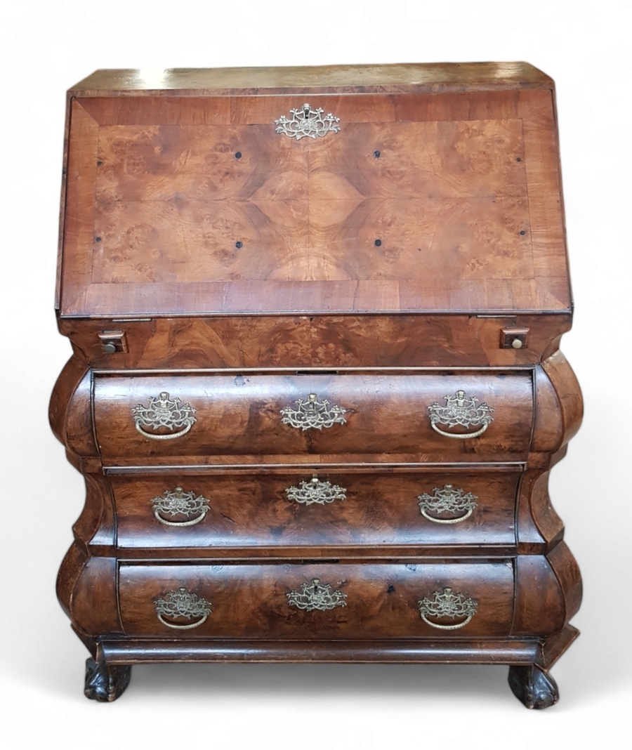 Wortelnoten bureau in Louis XV stijl, vervaardigd uit notenhout met messing beslag. Het meubel heeft een gebogen buikvorm met drie laden en een klep die een gedetailleerd interieur onthult. Het meubel van Nederlandse herkomst stamt uit circa 1920. Jouw collectie verdient dit bureau. Schrijf je in! |