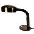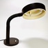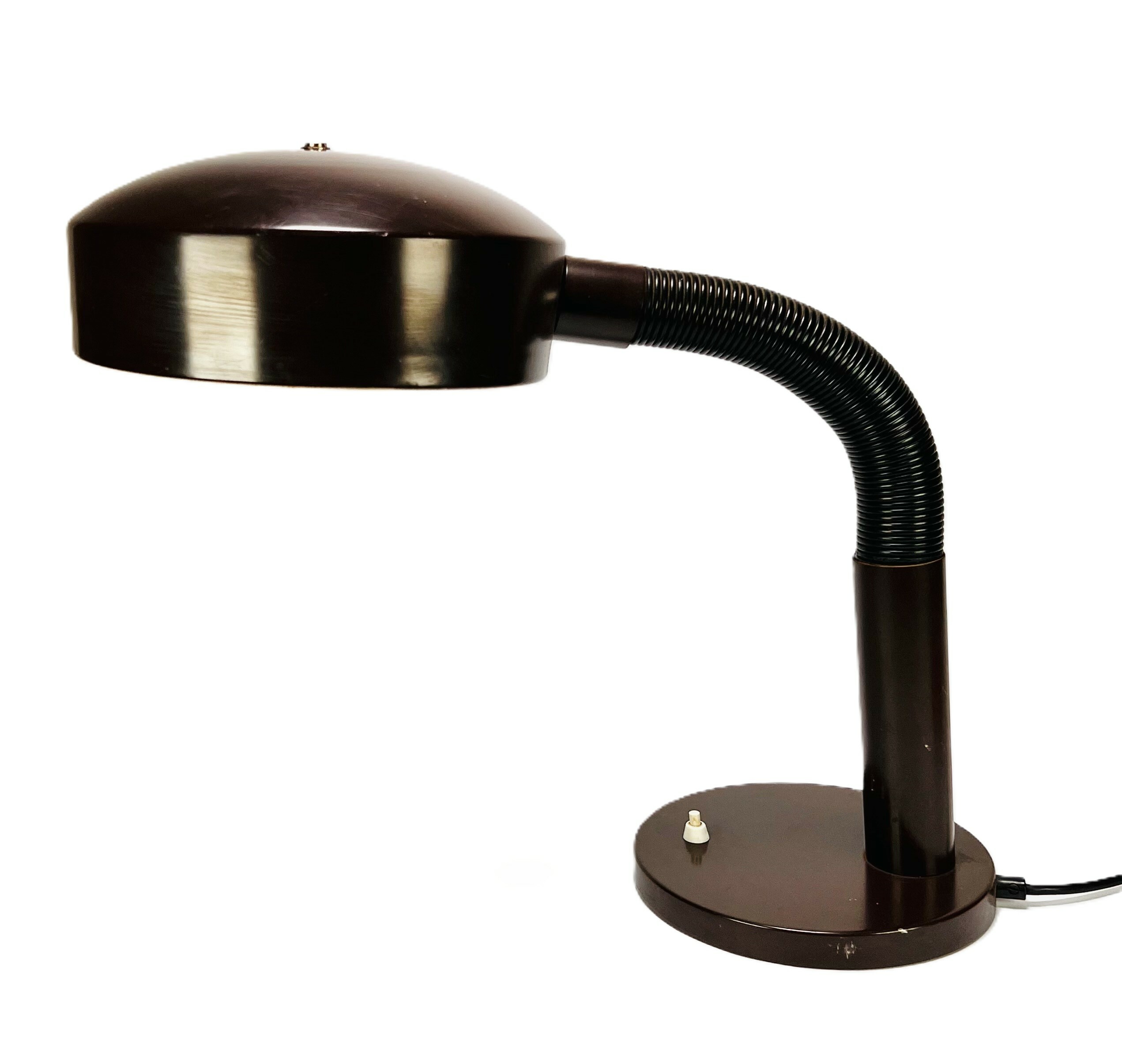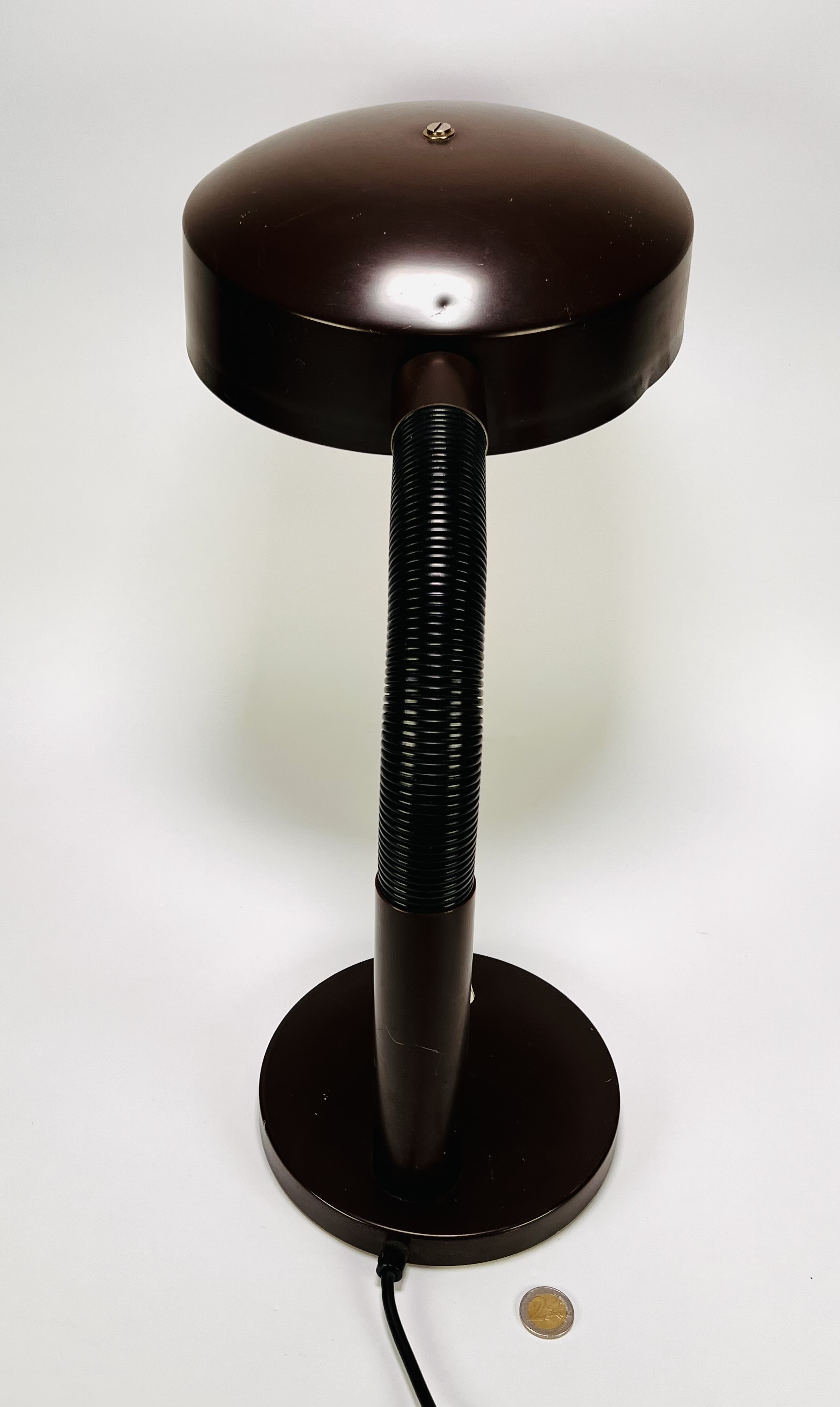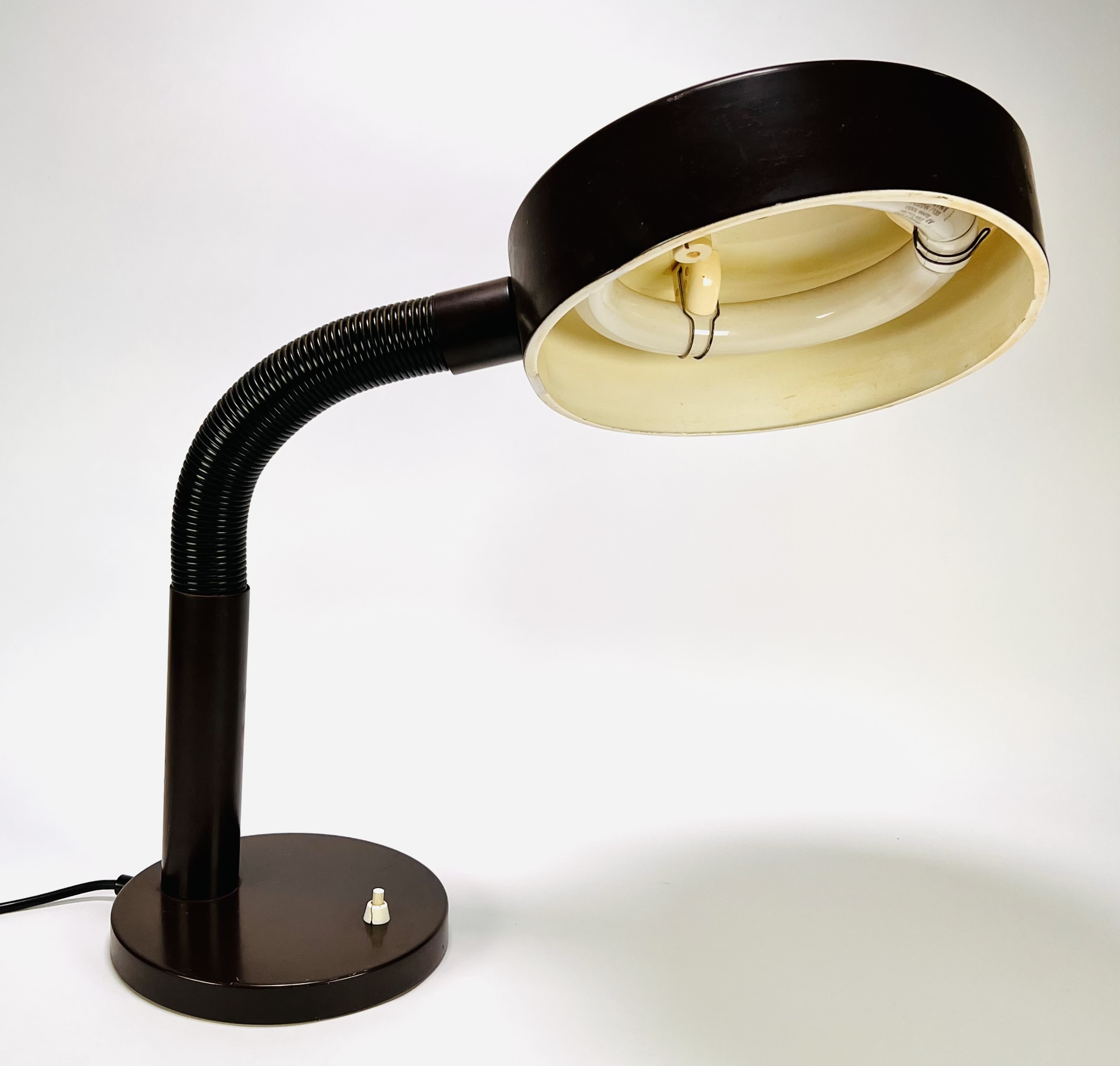 Bureaulamp in Mid-century modern stijl, vervaardigd uit bruin gelakt metaal met een flexibele arm. De halfronde kap bevat een karakteristieke cirkelvormige tl-buis die zorgt voor diffuus werklicht. De bureaulamp heeft een Nederlandse herkomst, circa 1970. De bureaulamp zelf beoordelen? Je bent welkom op onze kijkdagen op 10, 11 en 12 april. |