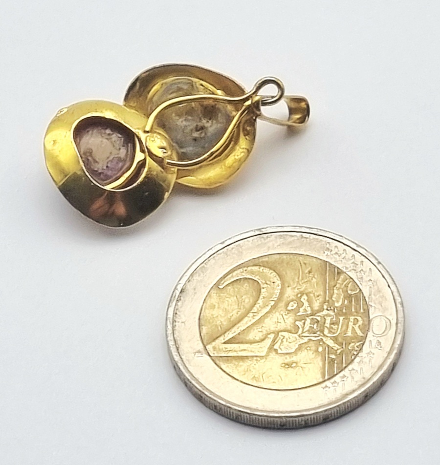 Hanger in Mid-century modern vormgeving vervaardigd uit 14 karaat geelgoud met klauw gezette cabochons van blauwgrijze stersaffier en paarsrode sterrobijn. Kenmerkend zijn de overlappende bolle schijfvormen en het fijn geribde waaiervormige accent achter de onderste steen. Gemerkt 585, de hanger dateert uit circa 1970. Klaar om te bieden? Registreer je nu en doe mee aan de veiling! |