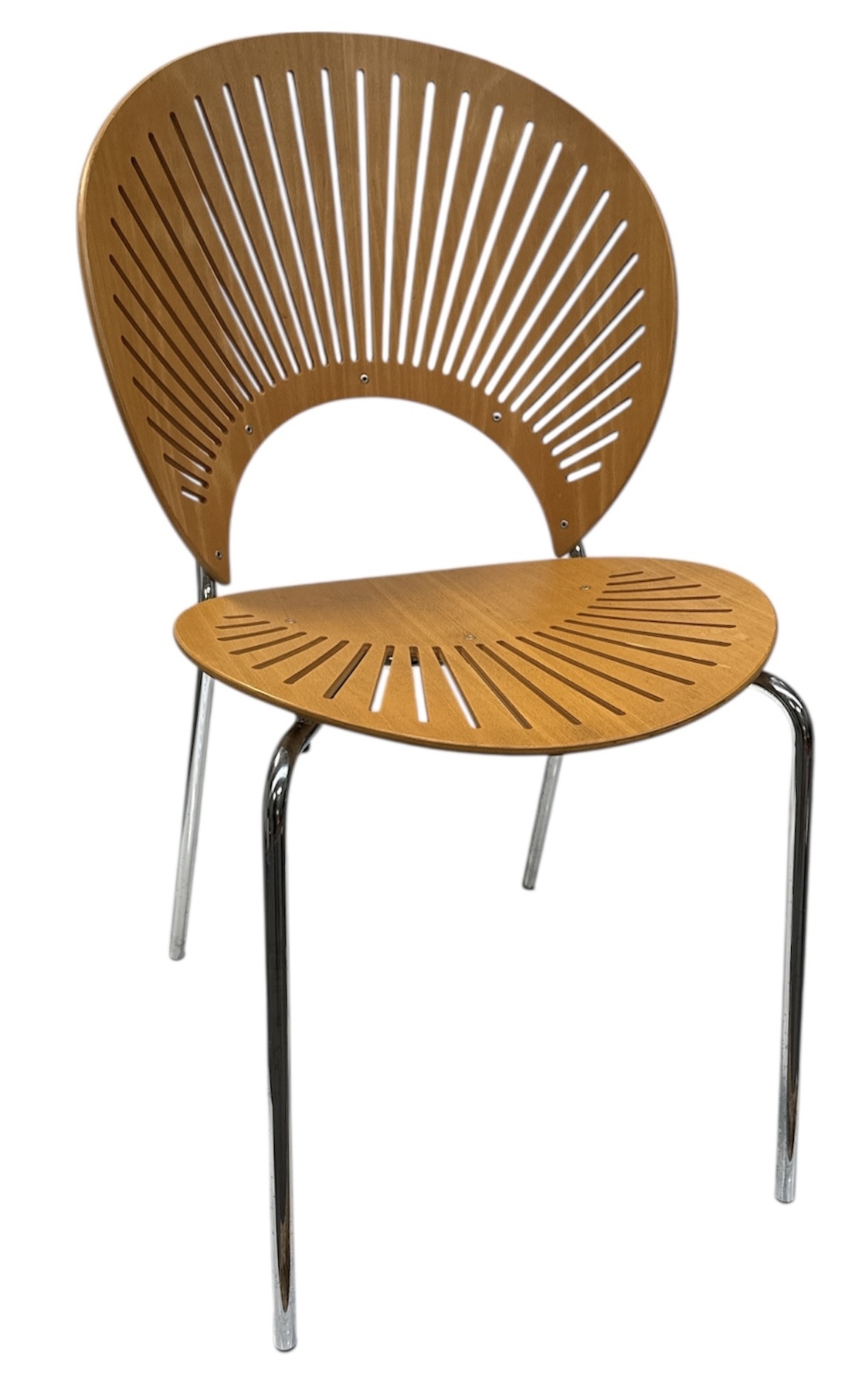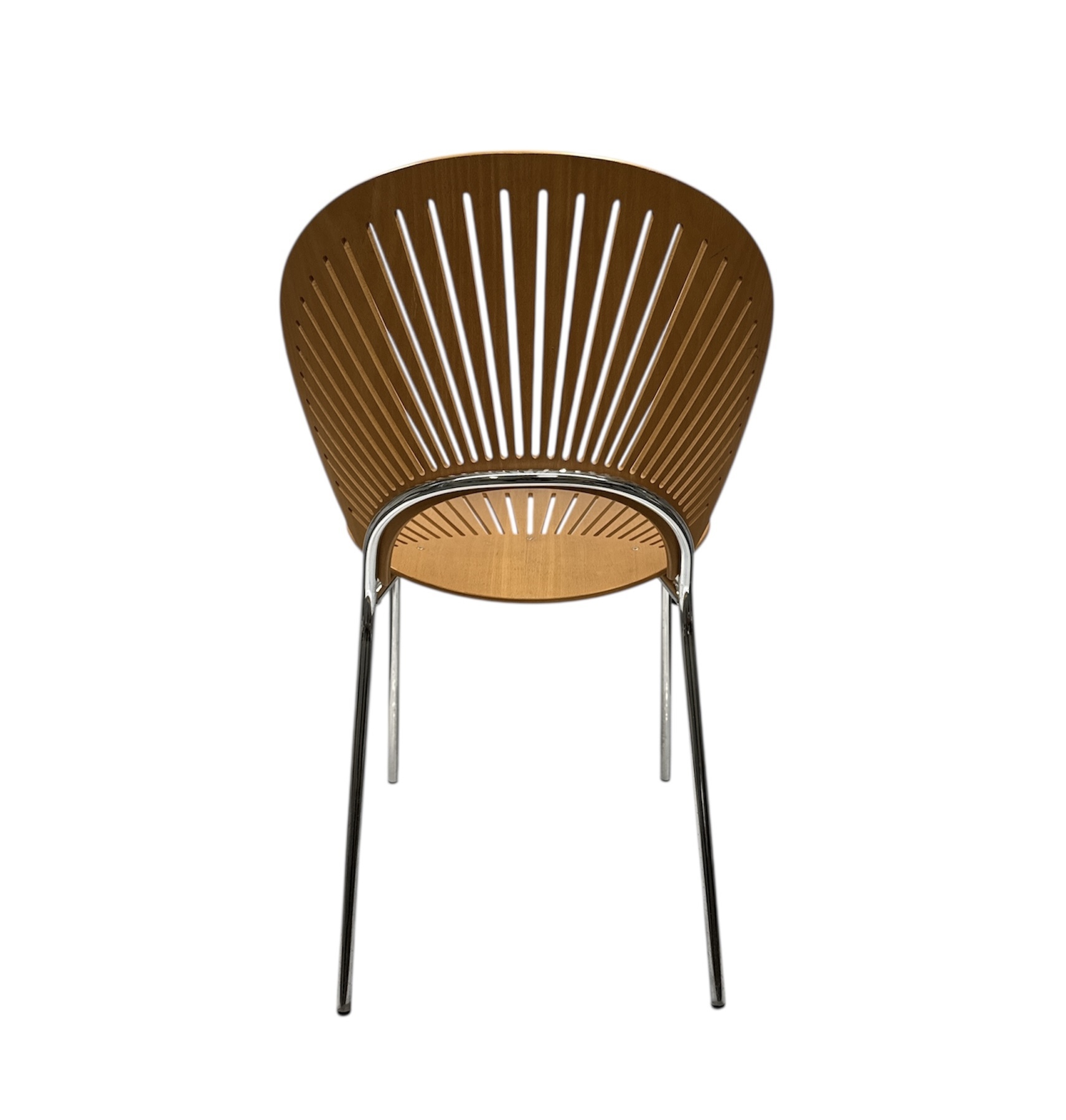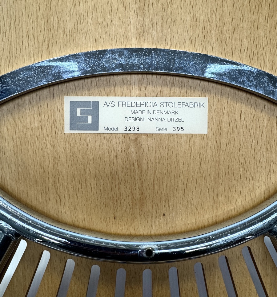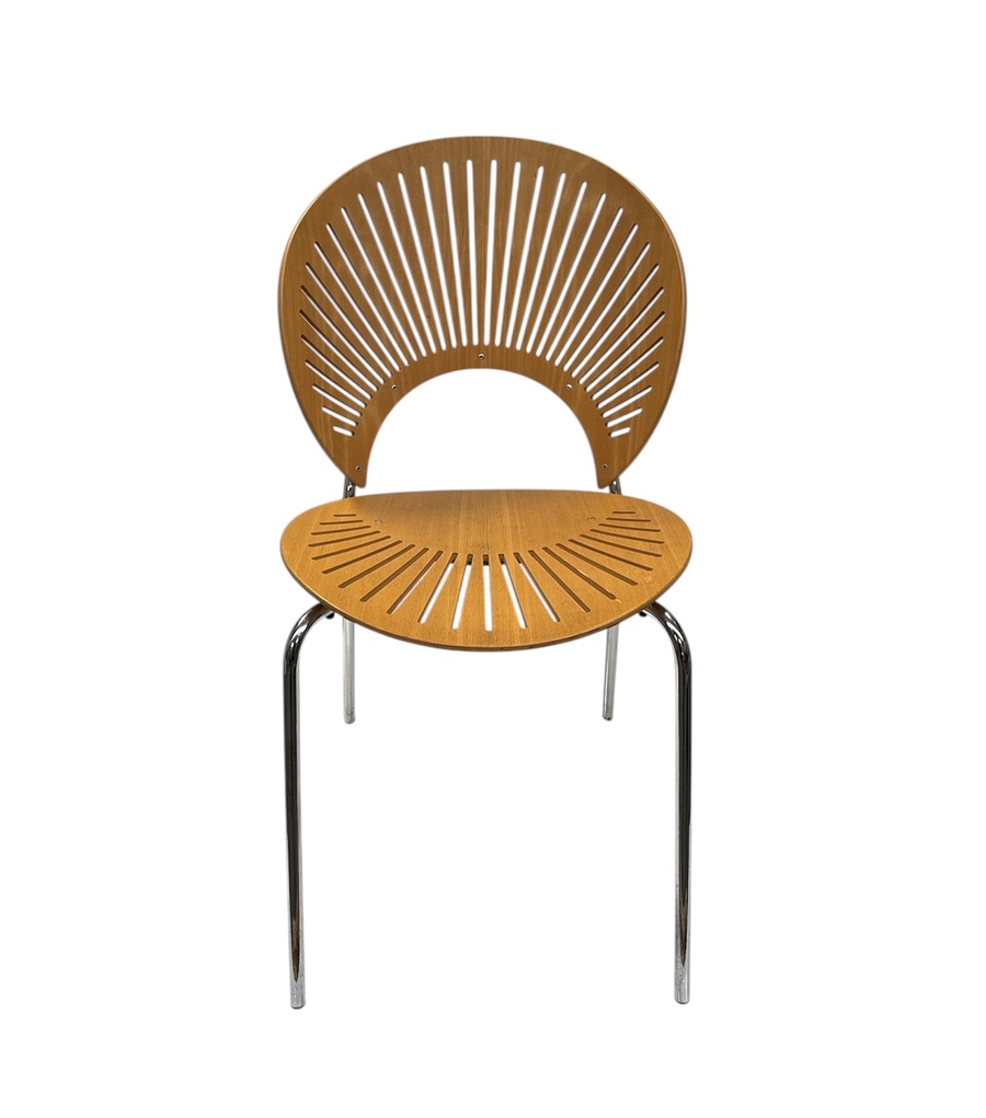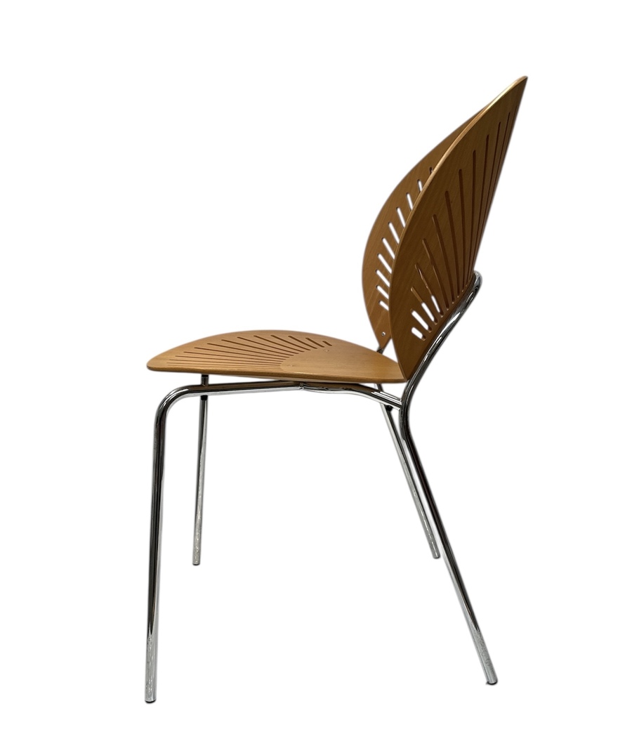 Houten stoel van Nanna Ditzel, model Trinidad 3298, in Deense design, uitgevoerd door producent Fredericia Furniture. Kenmerkend zijn de waaiervormige uitsparingen in de rugleuning en zitting. Het ontwerp combineert organische vormen met een lichte visuele uitstraling door de karakteristieke lichtinval en het verchroomde onderstel. De stoel dateert uit de late twintigste eeuw en heeft een Deense herkomst. Nanna Ditzel designstoel toevoegen aan je interieur? Bied nu! |