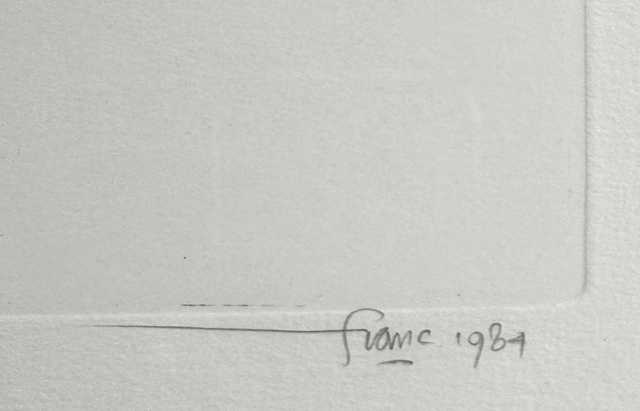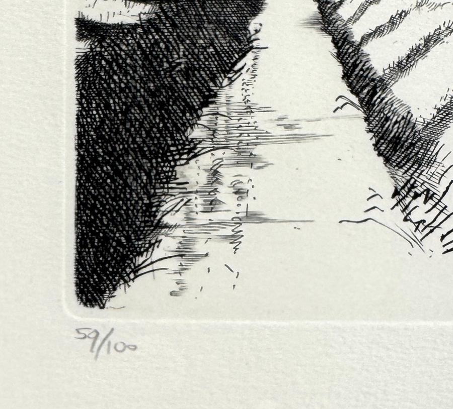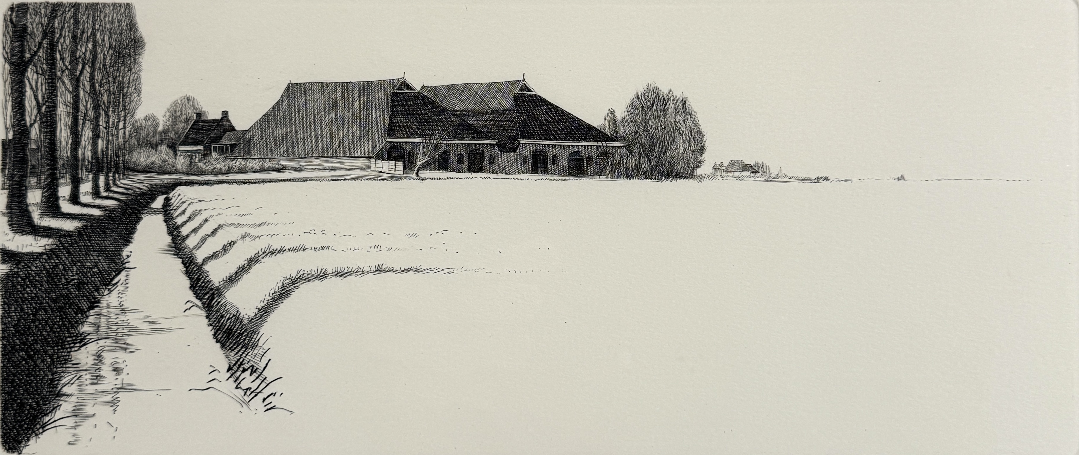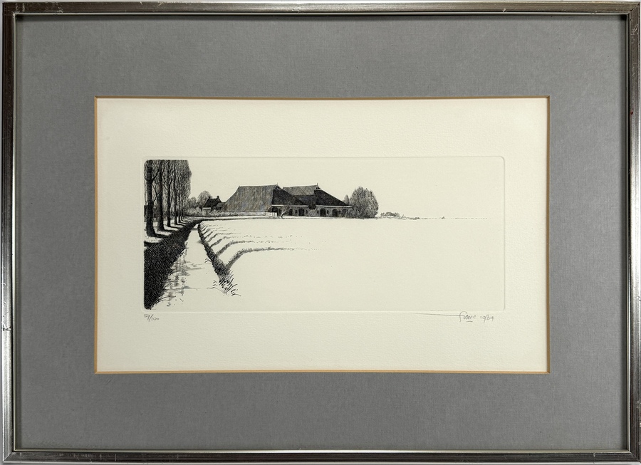 Ets door Franc van Oort (1953) toont een uitgestrekt polderlandschap met boerderij en bomenrij in figuratieve realistische stijl, uitgevoerd in ets op papier. Linksonder genummerd 59/100, rechtsonder gesigneerd en gedateerd 1984. Geïnteresseerd? Bezoek onze kijkdagen op 10, 11 en 12 april van 11:00 tot 17:00 uur! |