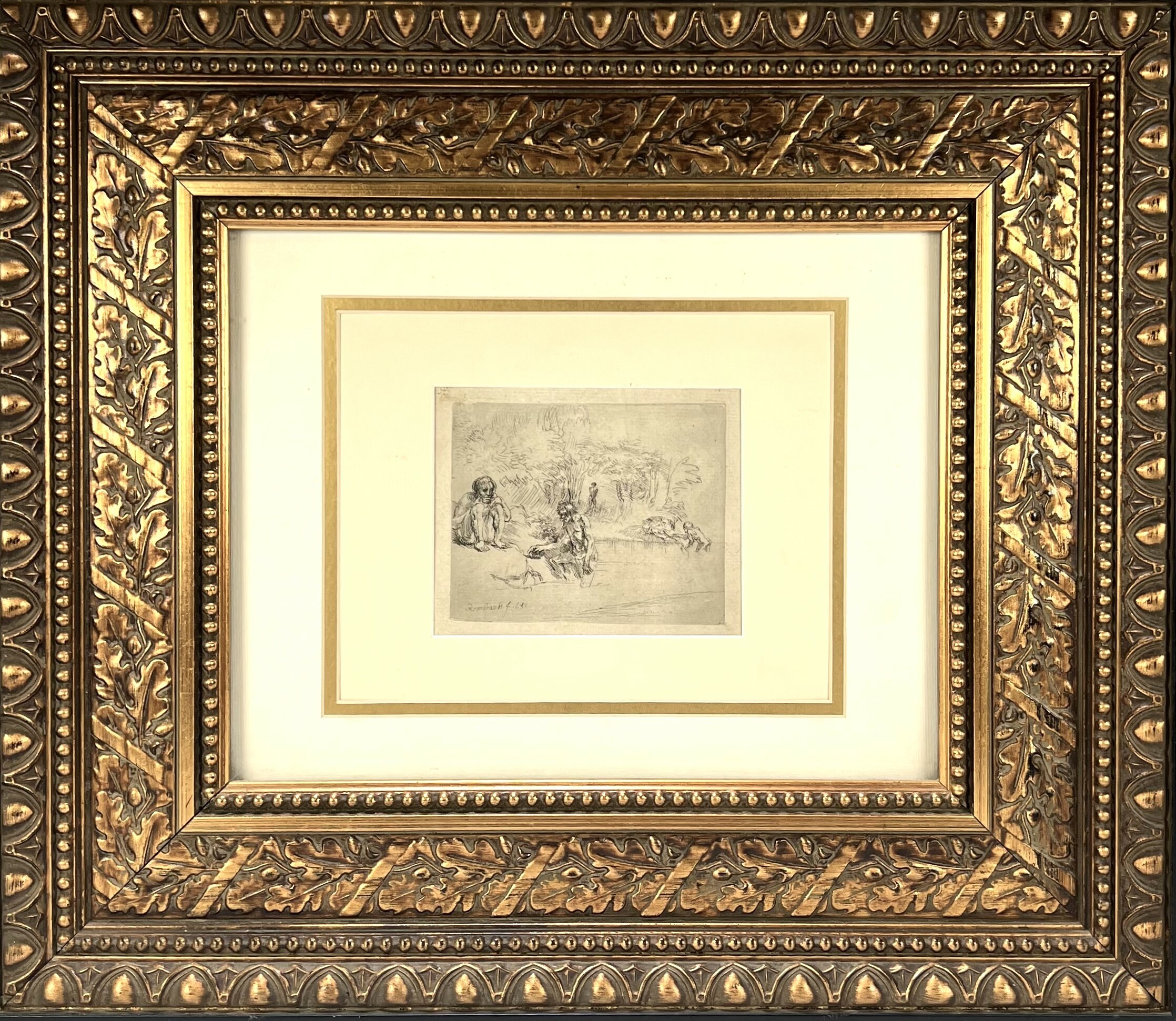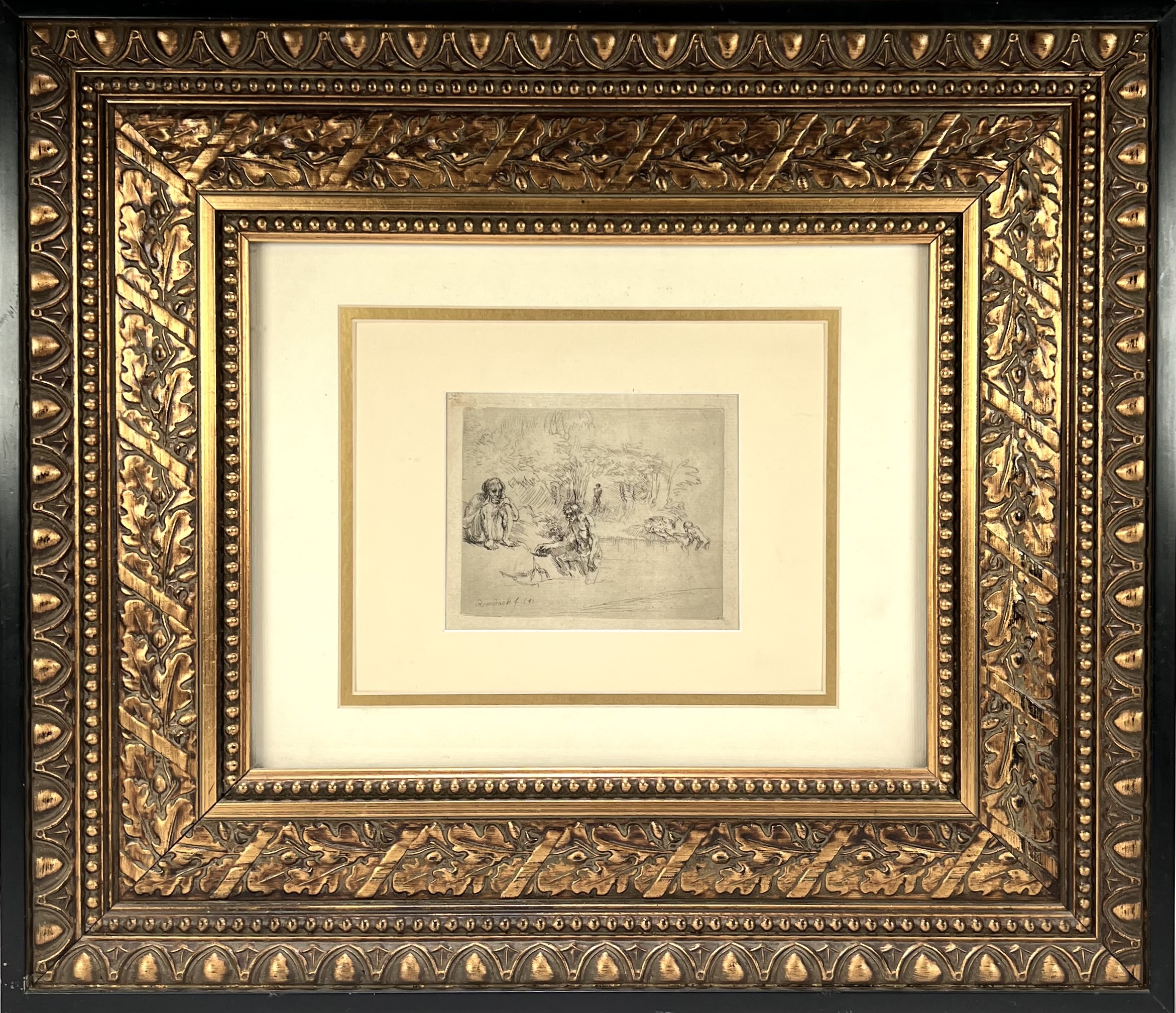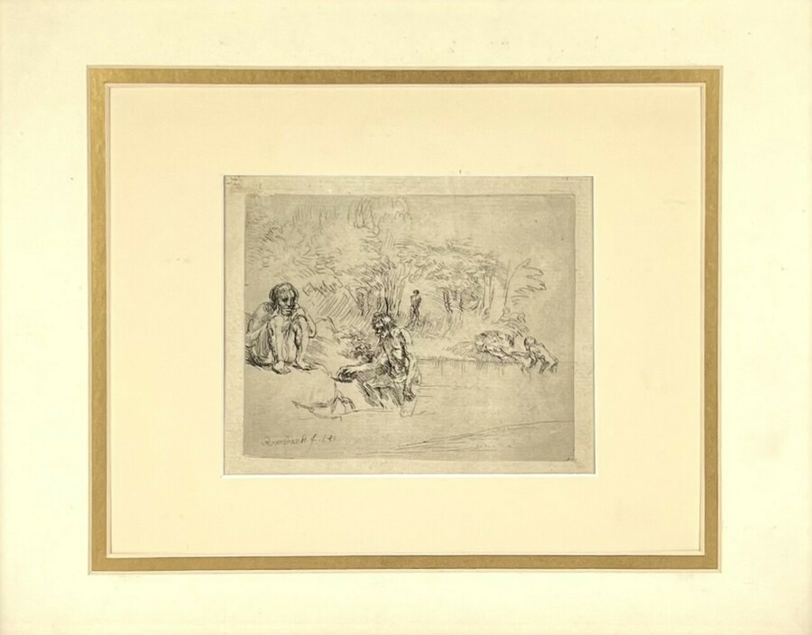 Ets door Rembrandt Harmenszoon van Rijn (1606–1669) toont de voorstelling "De Baders" in barokstijl, uitgevoerd als postume druk op papier. Het tafereel kenmerkt zich door losse arceringen en een weergave van naakte figuren in een bosrijk rivierlandschap. Linksonder gesigneerd en gedateerd 1631 in de plaat. De ets dateert uit de 18e/19e eeuw en bevindt zich in een goudkleurige lijst. Geïnteresseerd? Bezoek onze kijkdagen op 10, 11 en 12 april van 11:00 tot 17:00 uur! |