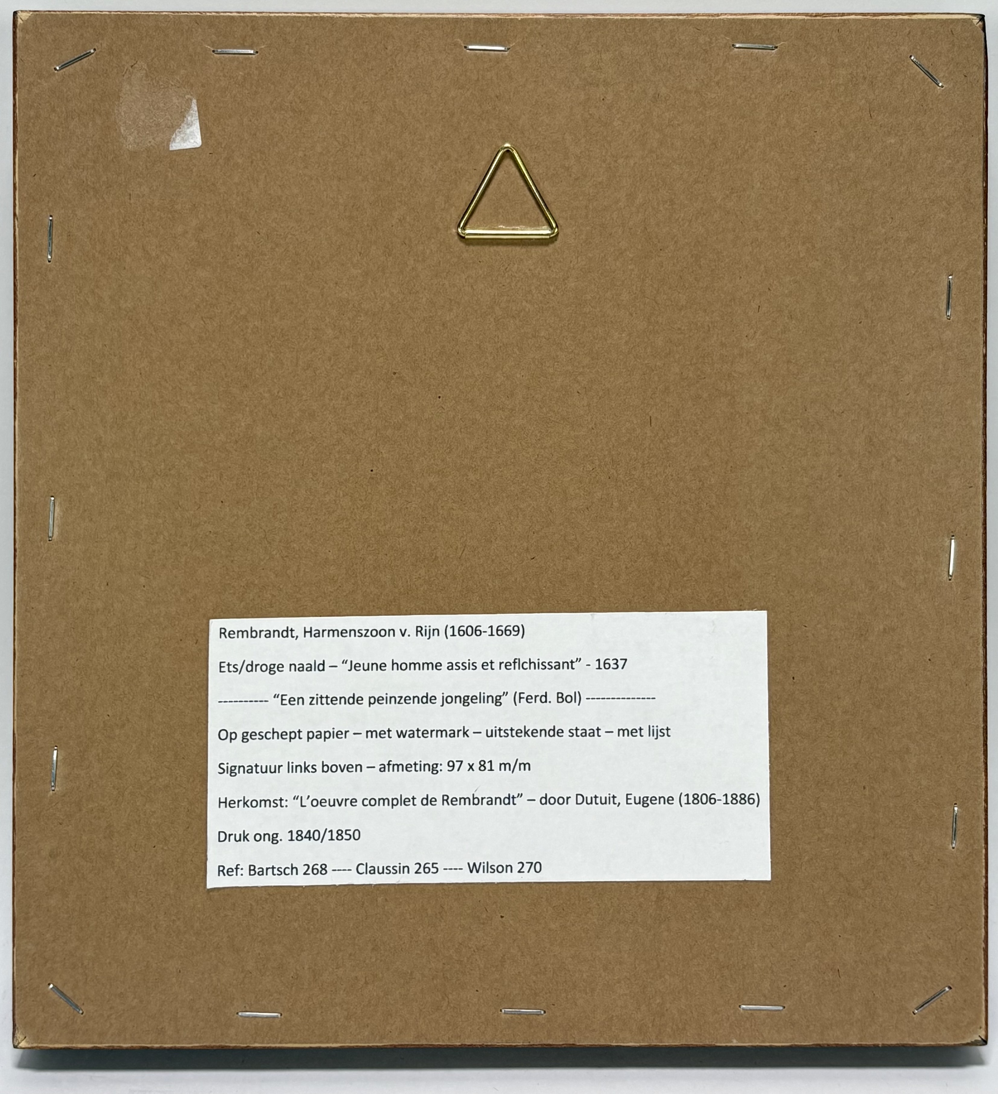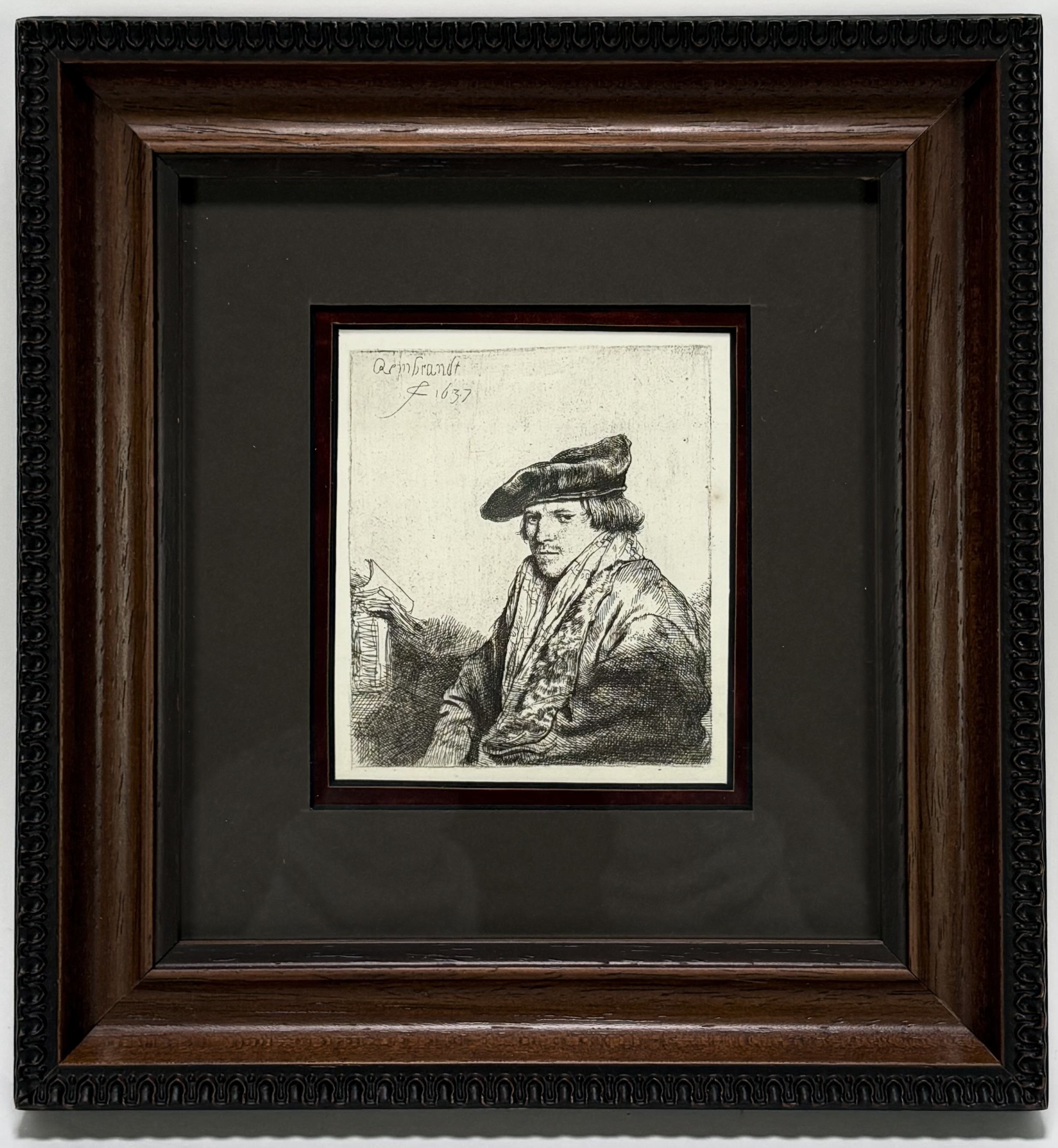 Ets door Rembrandt Harmenszoon van Rijn (1606–1669) toont een zittende peinzende jongeling in barokstijl getiteld "Jonge man met fluwelen baret". Uitgevoerd in ets en droge naald op geschept papier met watermerk. De datering van deze druk ligt omstreeks 1840/1850. Linksboven in de plaat gesigneerd en gedateerd 1637. Herkomst “L’oeuvre complet de Rembrandt” – door Dutuit, Eugene (1806–1886). In een donkere houten lijst met goudkleurige binnenrand. Geïnteresseerd? Bezoek onze kijkdagen op 10, 11 en 12 april van 11:00 tot 17:00 uur! |