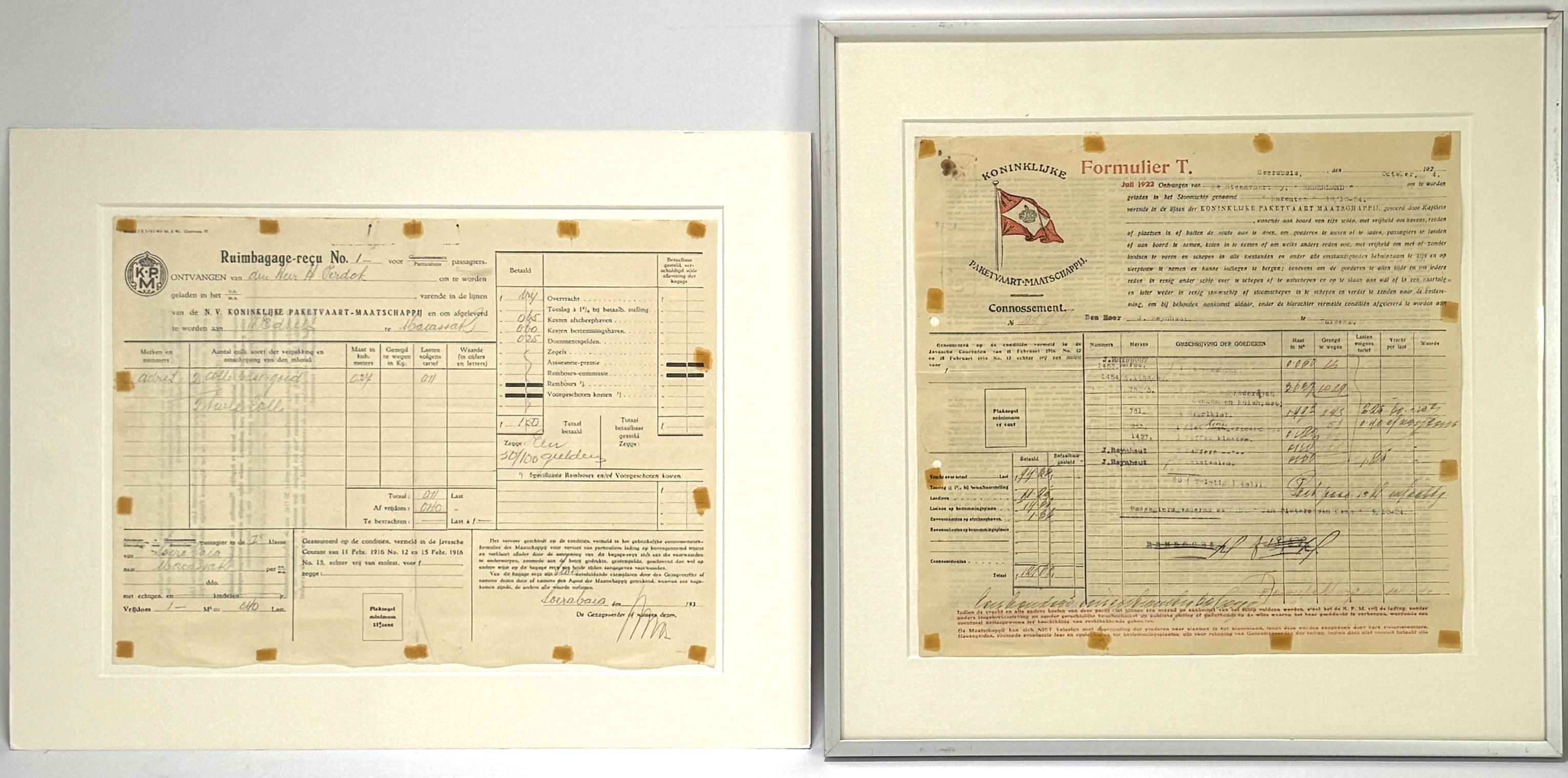 Formulieren van Koninklijke Pakketvaart Maatschappij vervaardigd uit bedrukt papier met handgeschreven invullingen. Bestaand uit een connossement en een ruimbagage-reçu met tabelindeling, rood-zwarte typografie en KPM-embleem met vlag. De documenten dateren uit de jaren 1920, gebruikt voor transport tussen Soerabaja en Makassar. De herkomst ligt in Nederlands-Indië. Kom langs tijdens de kijkdagen (10 t/m 12 april) en ontdek deze formulieren zelf! |