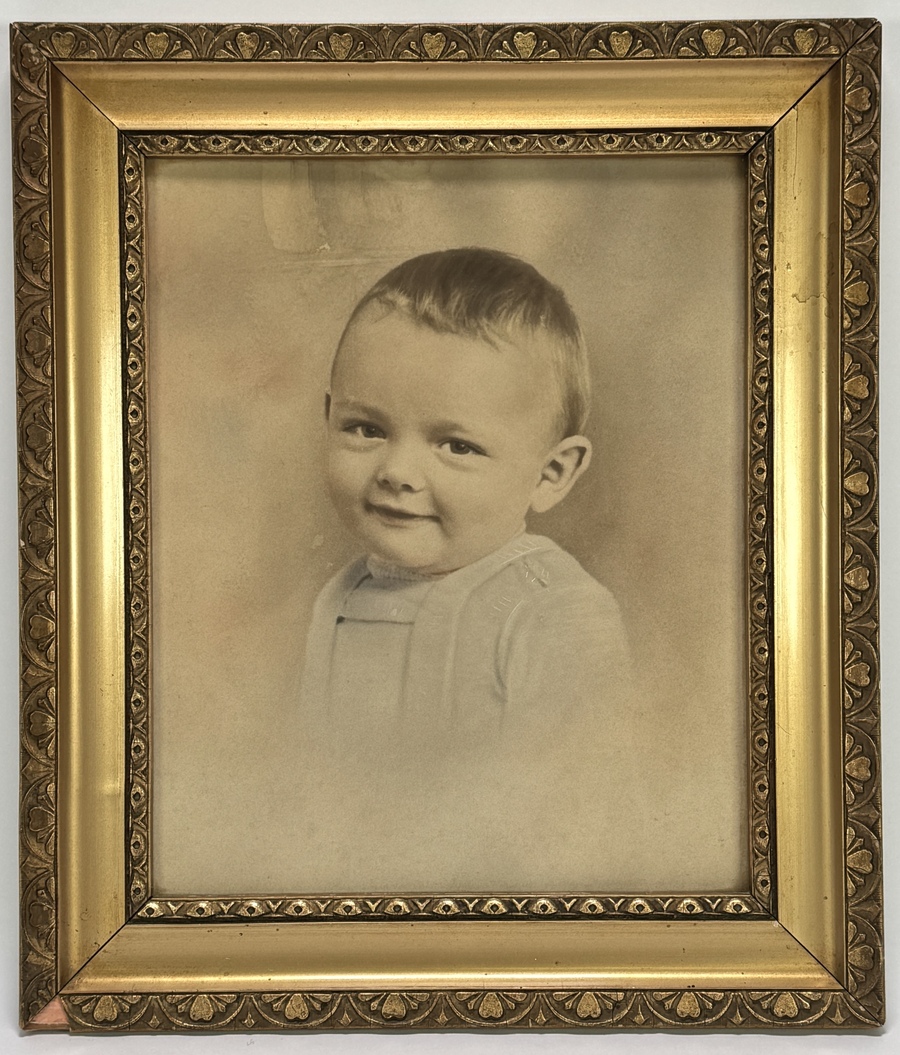 Portret van een jong kind in academisch realisme, uitgevoerd als bijgepunte foto op papier. De voorstelling toont een jongen met zachtmoedige blik in driekwartprofiel tegen een diffuse achtergrond. Subtiele nuances in kleurpotlood accentueren de gelaatstrekken en kleding. Het portret dateert uit ca. 1920 en heeft een Europese herkomst. Geplaatst in een goudkleurige lijst met repeterend hartvormig bladornament en verdiepte profielrand. Geïnteresseerd? Bezoek onze kijkdagen op 10, 11 en 12 april van 11:00 tot 17:00 uur! |