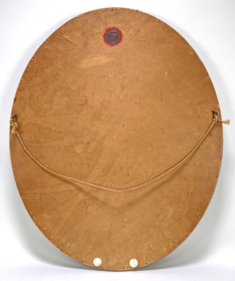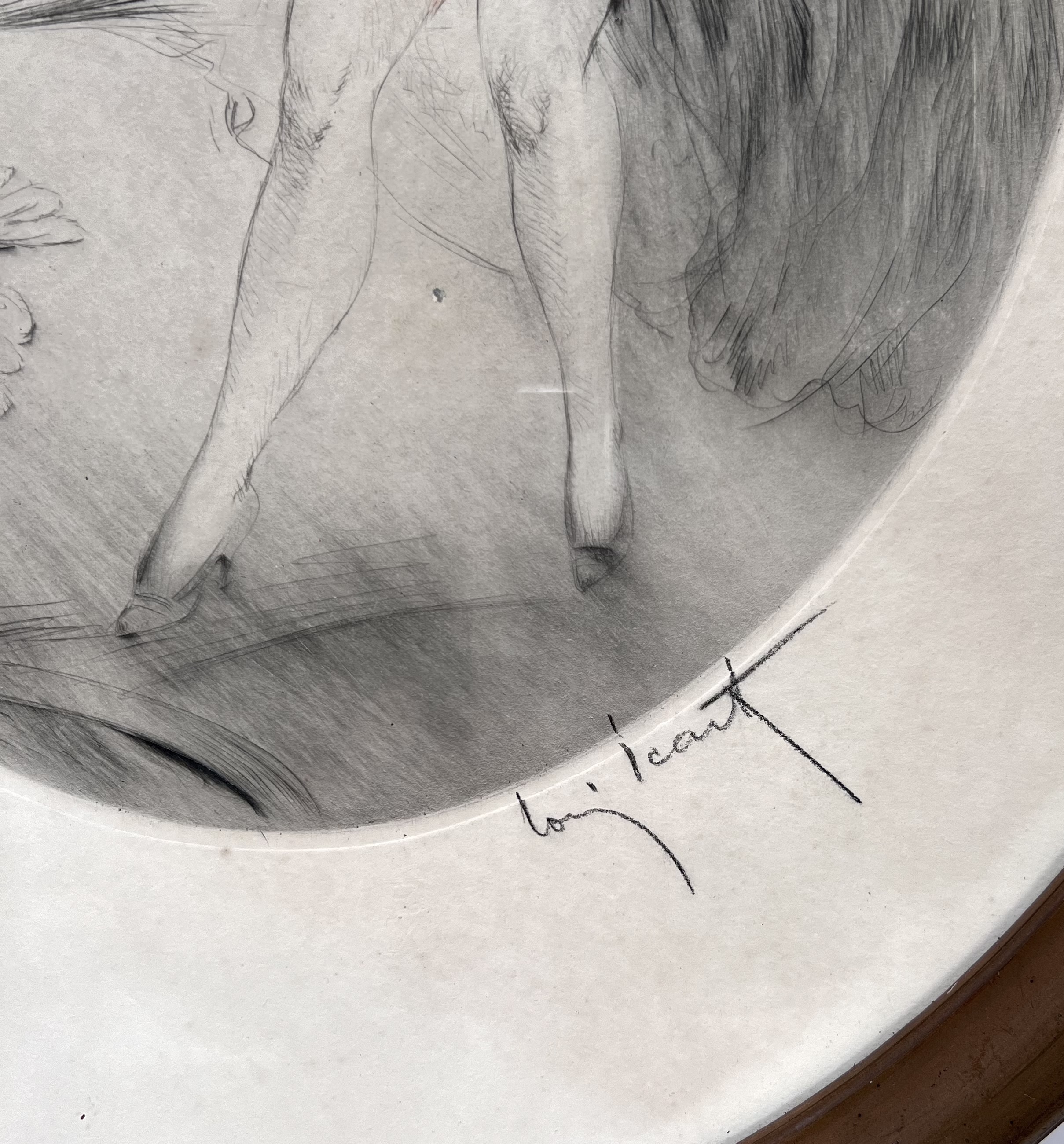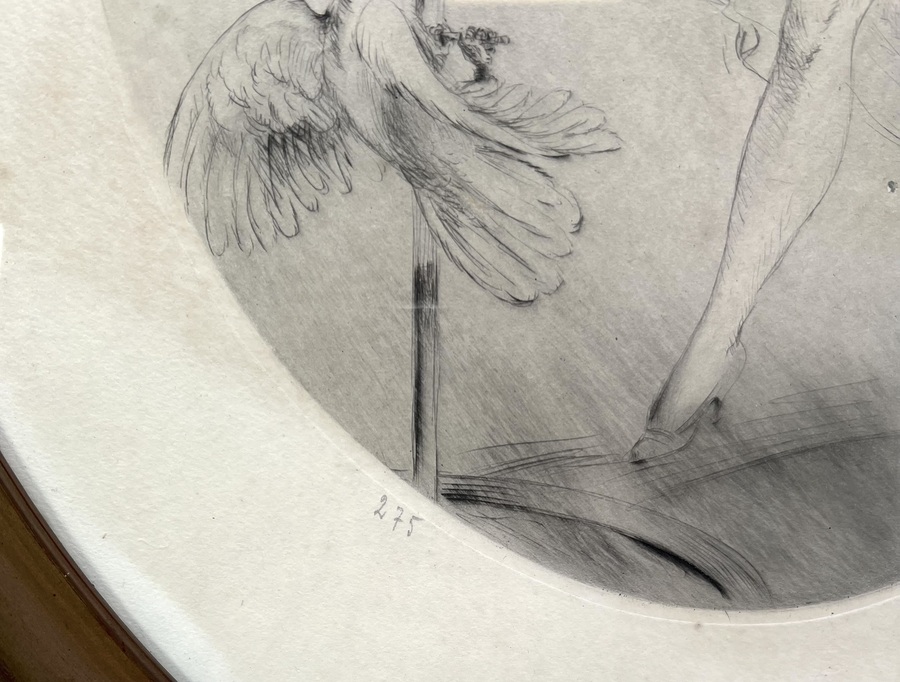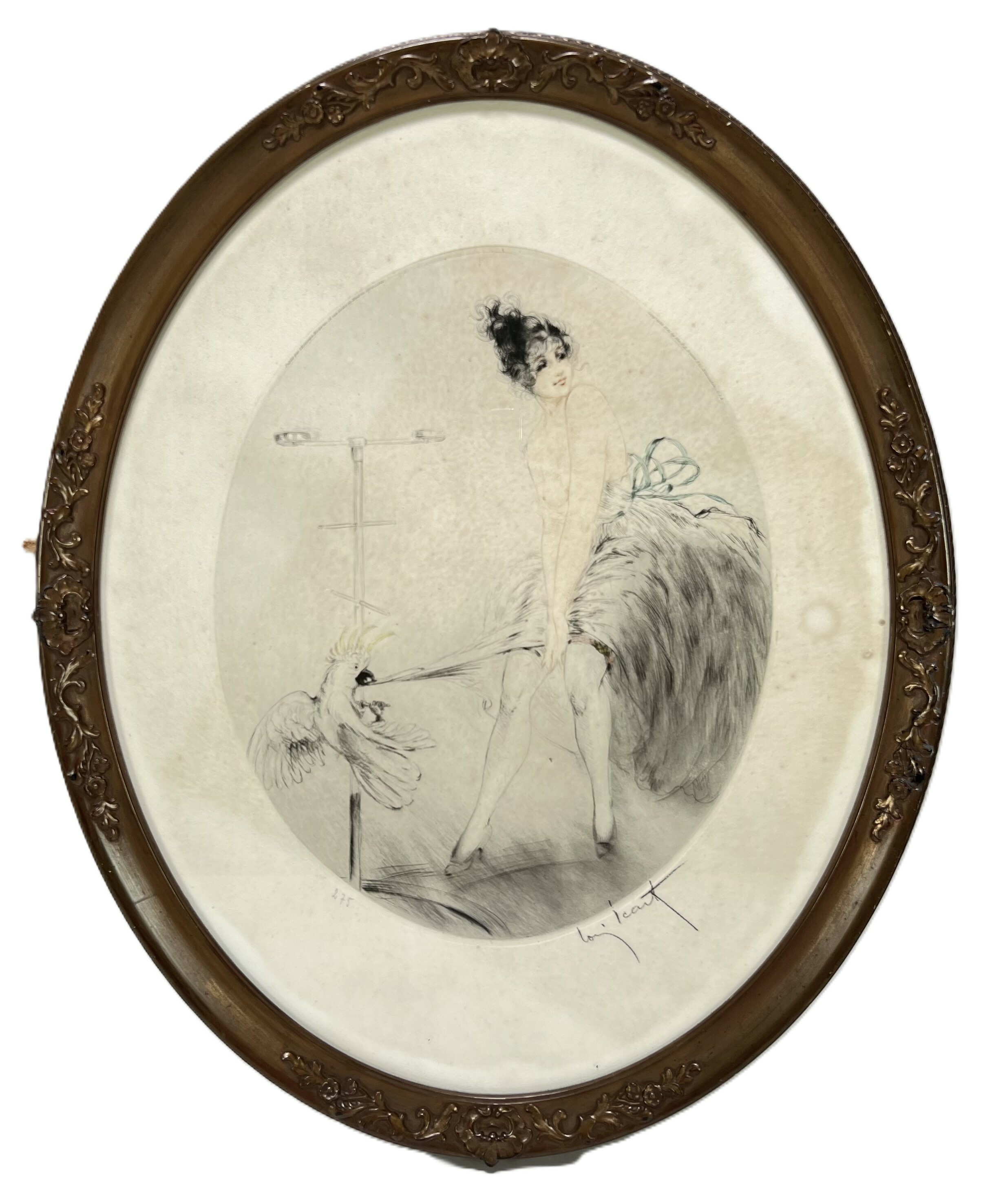 Kleurets door Louis Icart (1888–1950) uit de Art Deco periode, vervaardigd op papier met drogenaaldtechniek. Het werk toont een zittende vrouw die speelt met een geelkuifkaketoe op een standaard. Het werk is gesigneerd in potlood en genummerd tweehonderdvijfenzeventig, datering 1921. De ets zit in een rijk bewerkte ovale goudkleurige lijst achter glas. Wil je deze kleurenets in het echt bekijken? Kom naar de kijkdagen! |