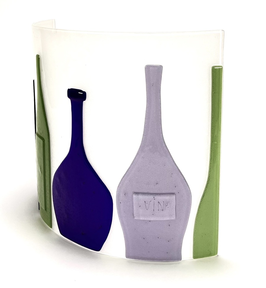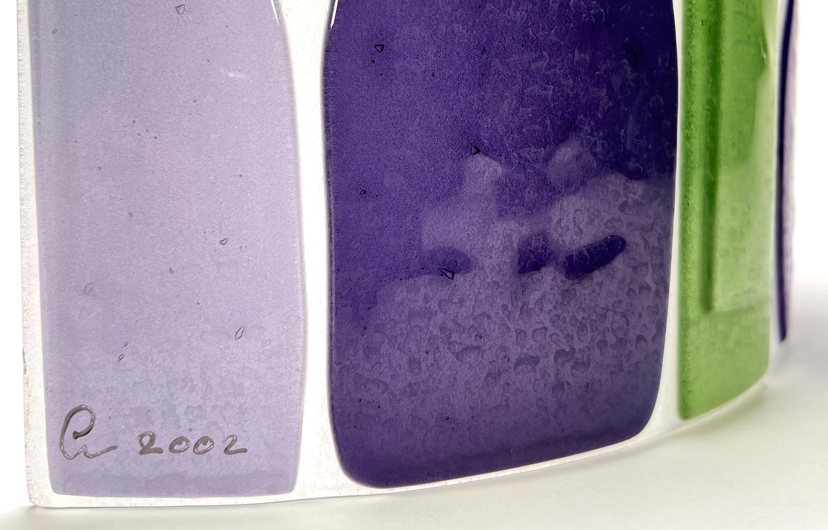Glasobject uit de moderne periode, gedateerd 2002. De voorstelling toont gestileerde flessen in diverse kleuren zoals groen, blauw en violet, deels voorzien van tekst labels. Het glasobject is rechtsonder gemonogrammeerd en gedateerd. Dit glasobject zelf beoordelen? Je bent welkom op onze kijkdagen op 10, 11 en 12 april! |