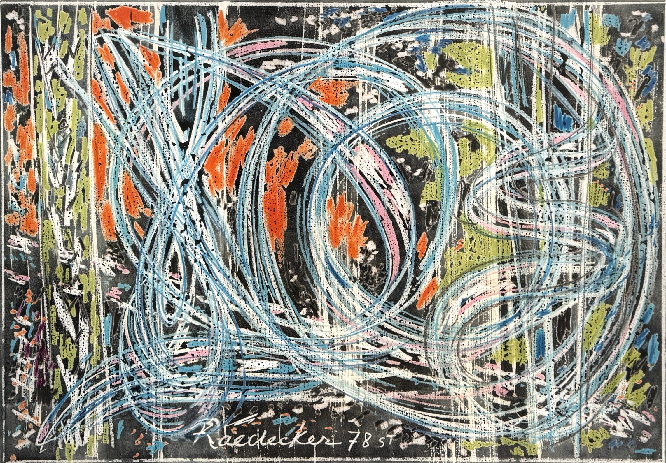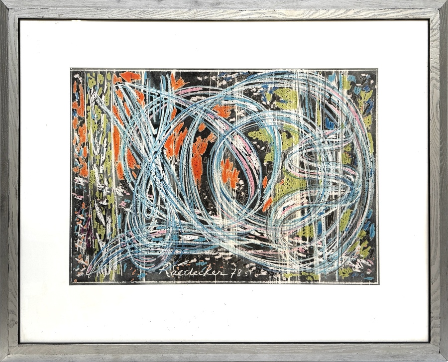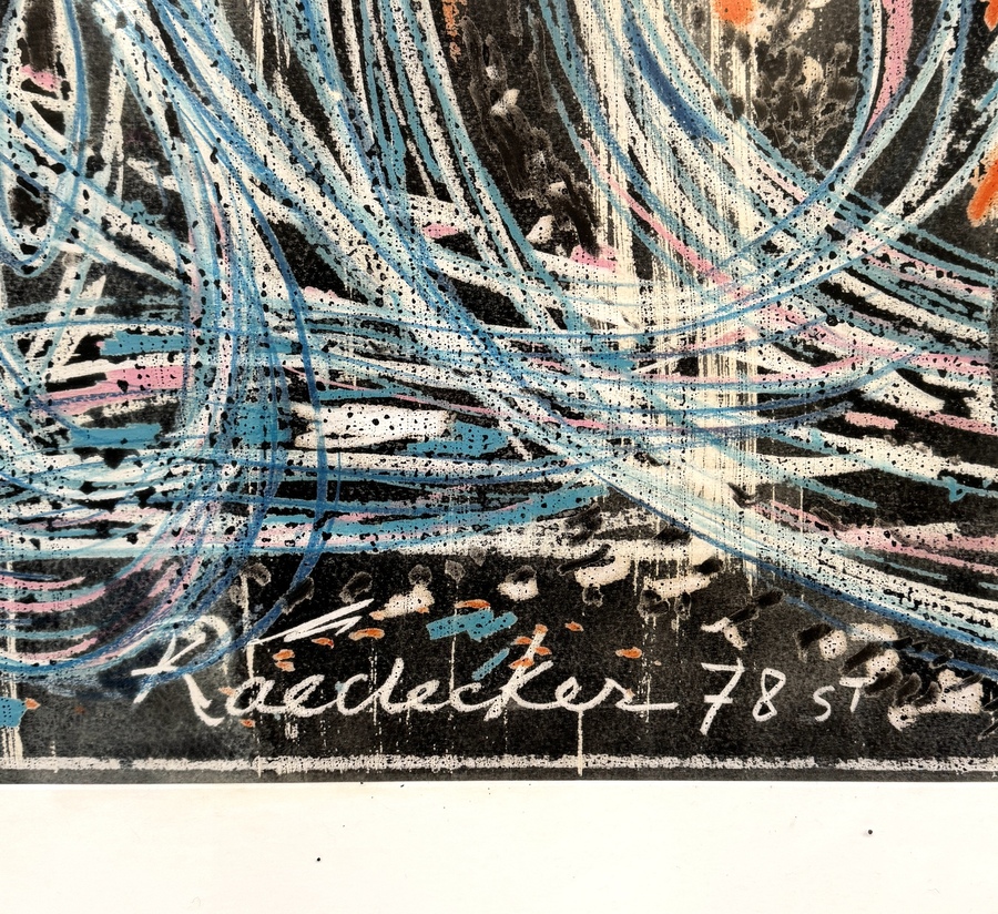 Gemengde techniek door Max Raedecker (1914–1987) toont een abstracte compositie met dynamische, ritmische lijnvoering in abstract-expressionistische stijl, uitgevoerd in krijt en gouache op papier. Het kleurgebruik is contrastrijk met helderblauwe en roze lineaire structuren tegen een donkere fond met oker en groene kleurvelden. Midden onder gesigneerd en gedateerd 1978. Geïnteresseerd? Bezoek onze kijkdagen op 10, 11 en 12 april van 11:00 tot 17:00 uur! |