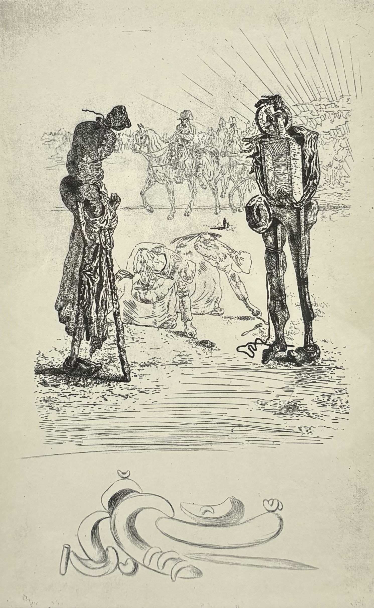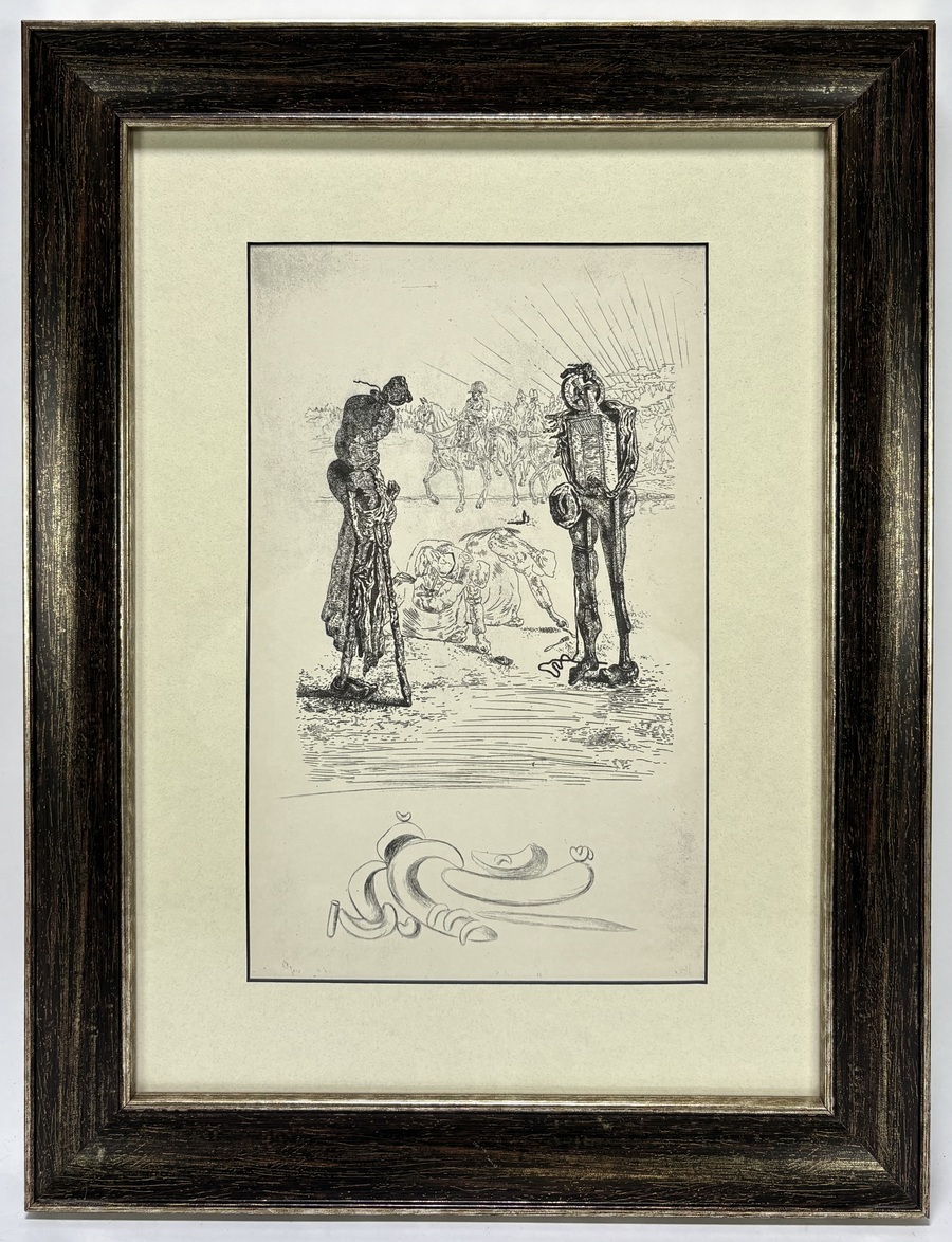 Gravure door Salvador Dalí (1904–1989) toont een surrealistische scène uit Les Chants de Maldoror door Comte de Lautréamont in surrealistische stijl, uitgevoerd in autotypie op papier. De voorstelling bevat karakteristieke hybride figuren en ruiters tegen een weidse horizon, gebaseerd op de illustraties voor Albert Skira uit 1934. Geplaatst in een donkere houten lijst met zilverkleurige binnenrand. Kom langs tijdens de kijkdagen (10 t/m 12 april) en ontdek deze gravure zelf! |