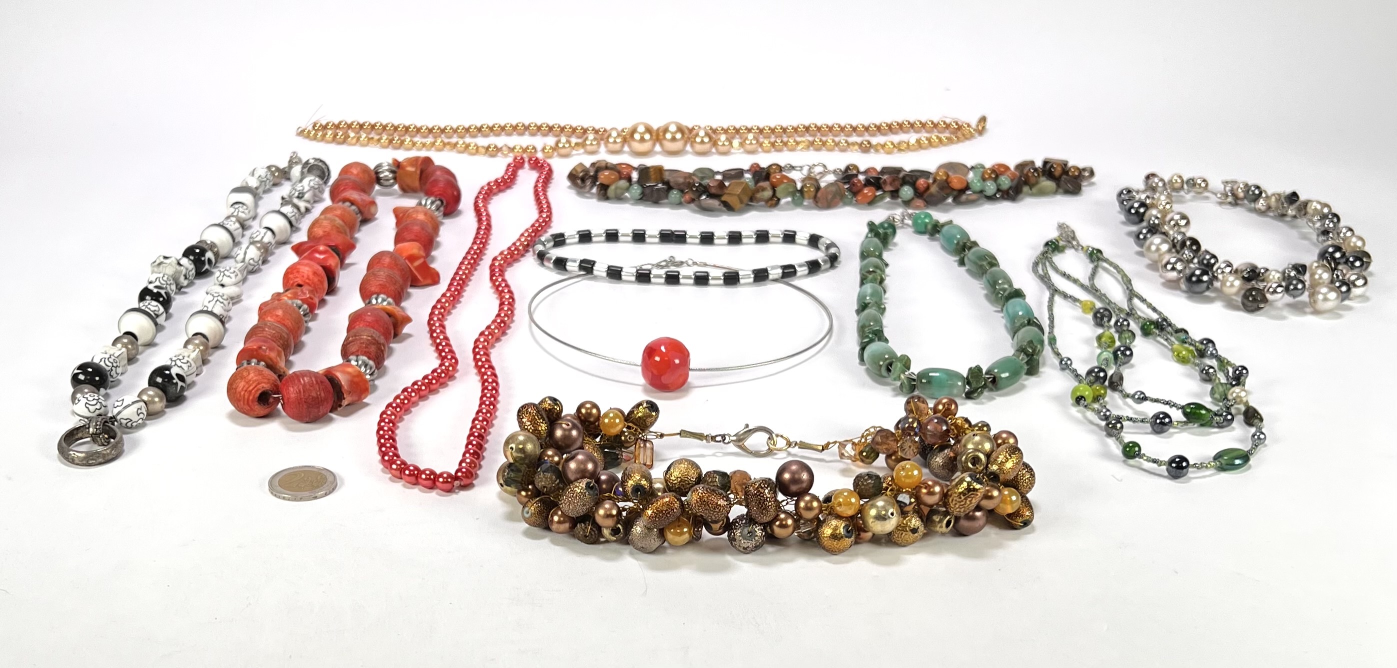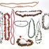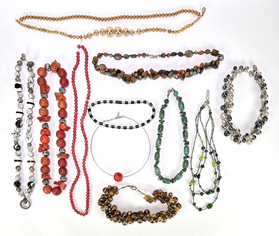 Halskettingen in diverse stijlen, vervaardigd uit glas, kunststof en halfedelsteen met metalen sluitingen. De verzameling bevat elf verschillende kettingen, waaronder etnische kralensnoeren en moderne colliers met organische vormen, daterend uit de late 20e eeuw en een Europese herkomst. Registreer nu en bied eenvoudig online mee op deze halskettingen! |