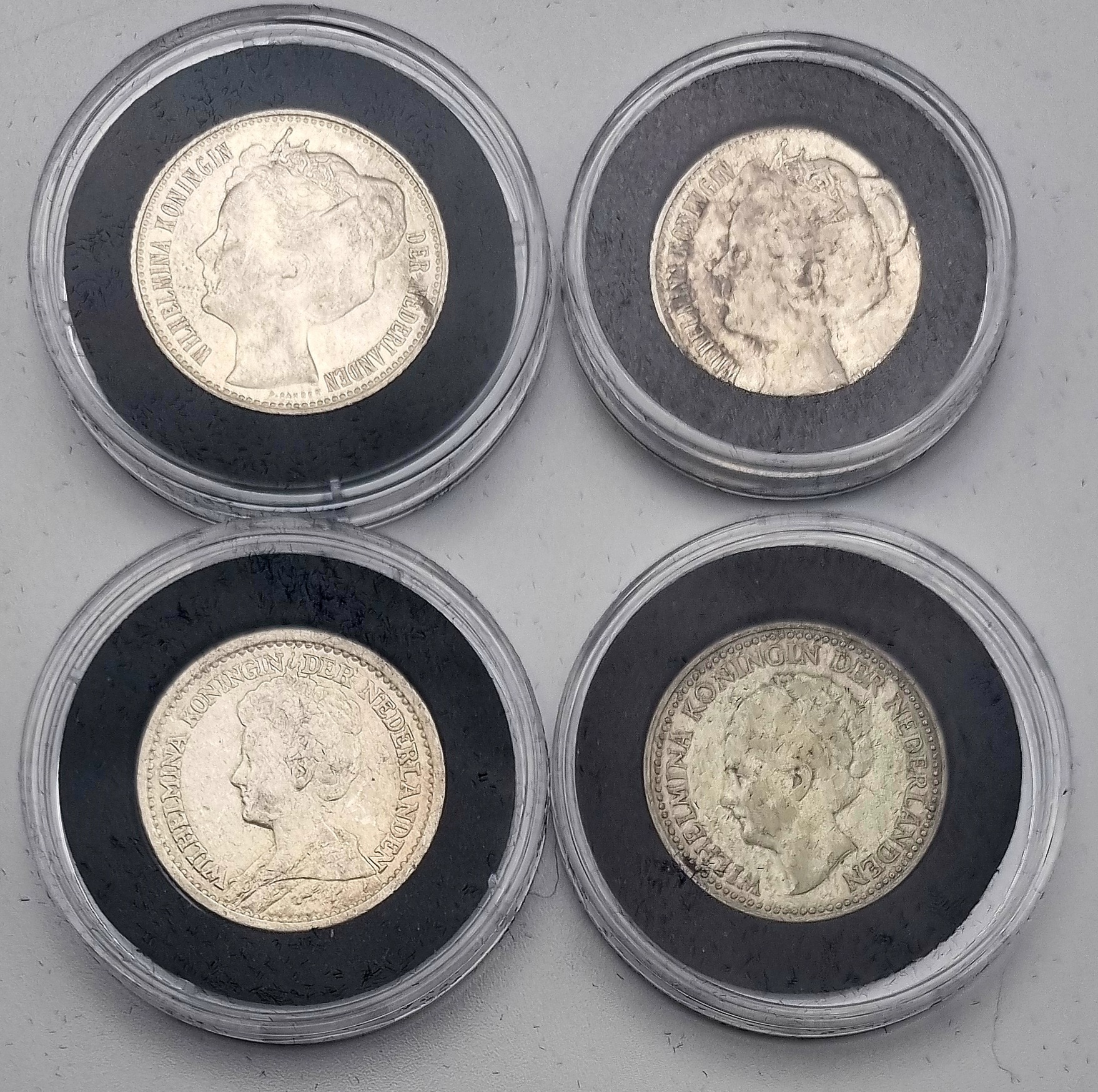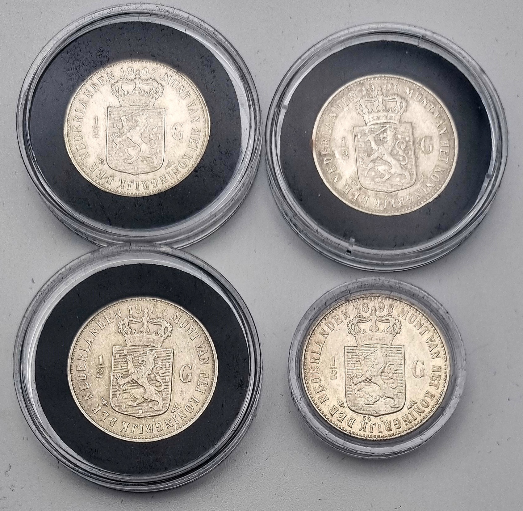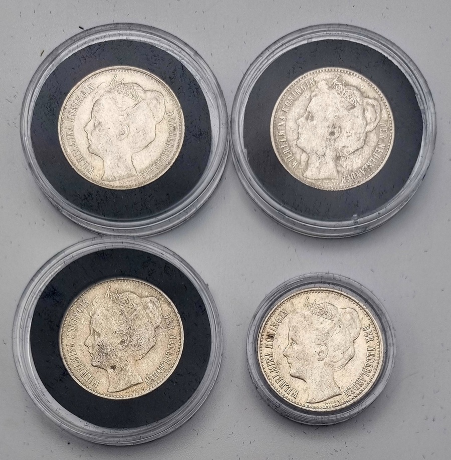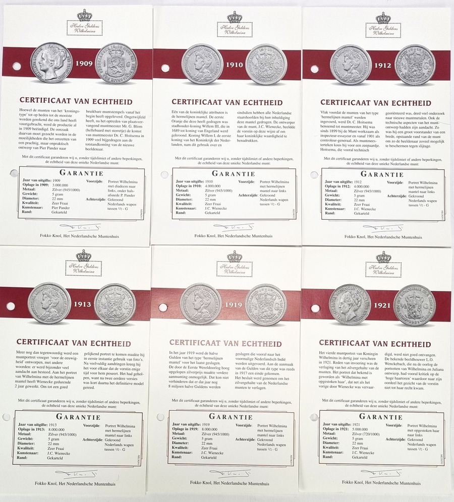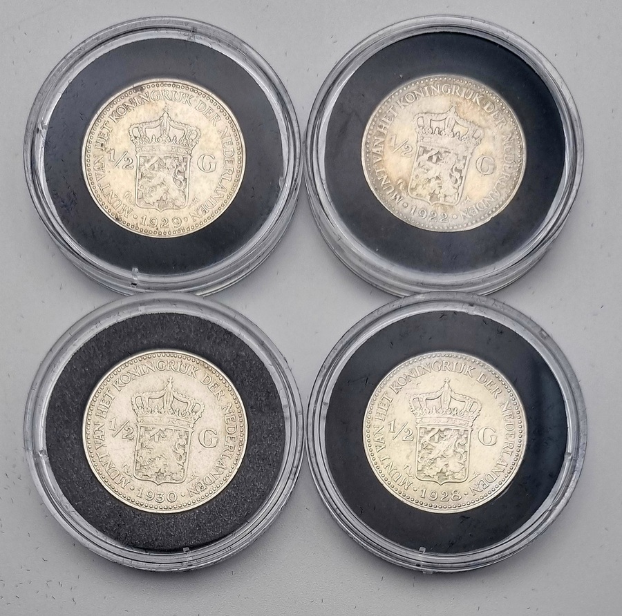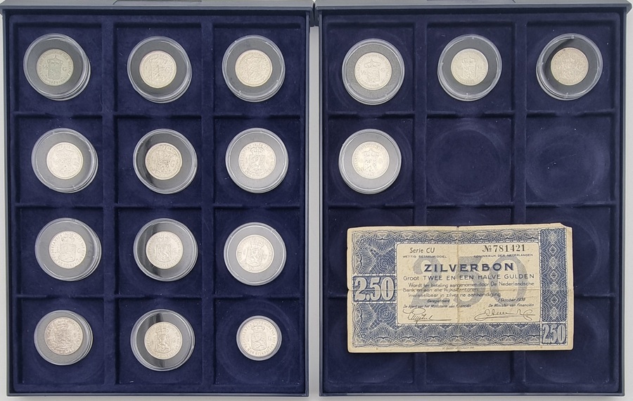 Halve guldens van Koningin Wilhelmina, geslagen in zilver en vergaard als incomplete jaargangen tussen 1898–1930. Deze verzameling omvat zestien Nederlandse circulatiemunten uit 1898, 1904 t/m 1910, 1912, 1913, 1919, 1921, 1922, 1928 t/m 1930, in capsulehouders. Te zien zijn drie portrettypen van Wilhelmina en het gekroonde rijkswapen. Inclusief certificaten van echtheid en een zilverbond, tezamen in blauwe presentatiedoosjes. Klaar om te bieden? Registreer je nu en doe mee aan de veiling! |