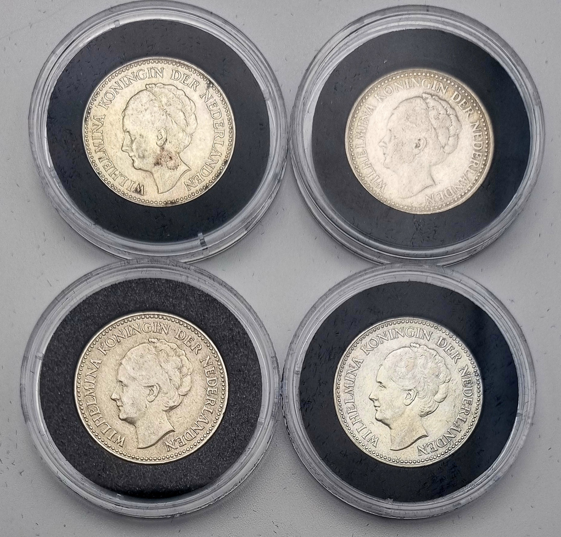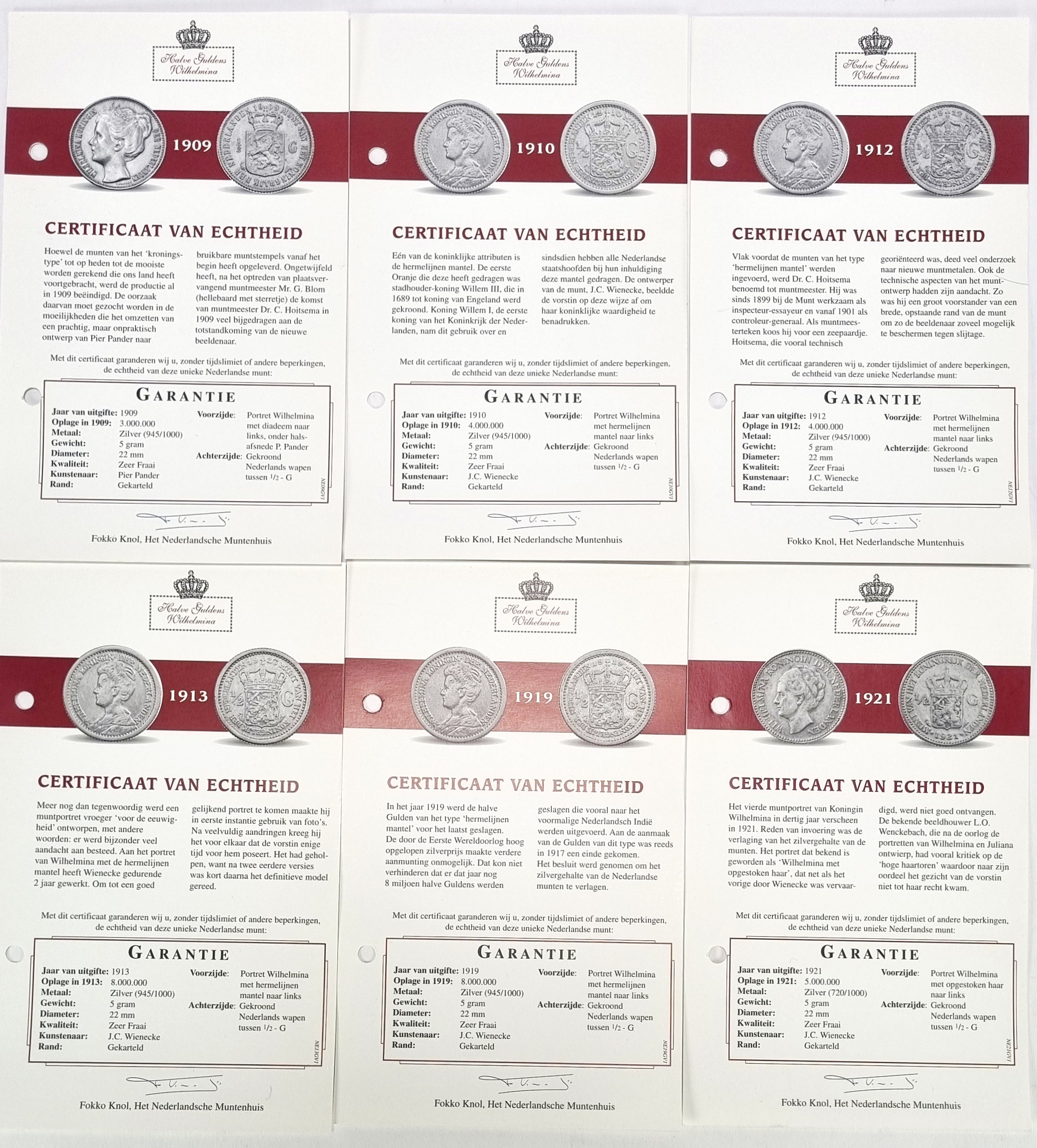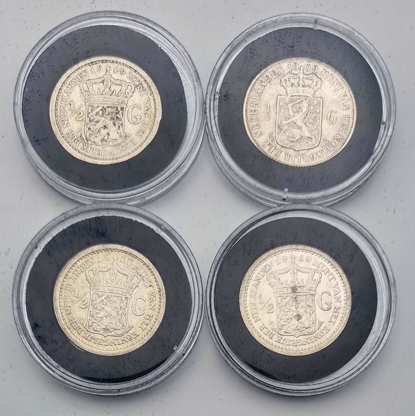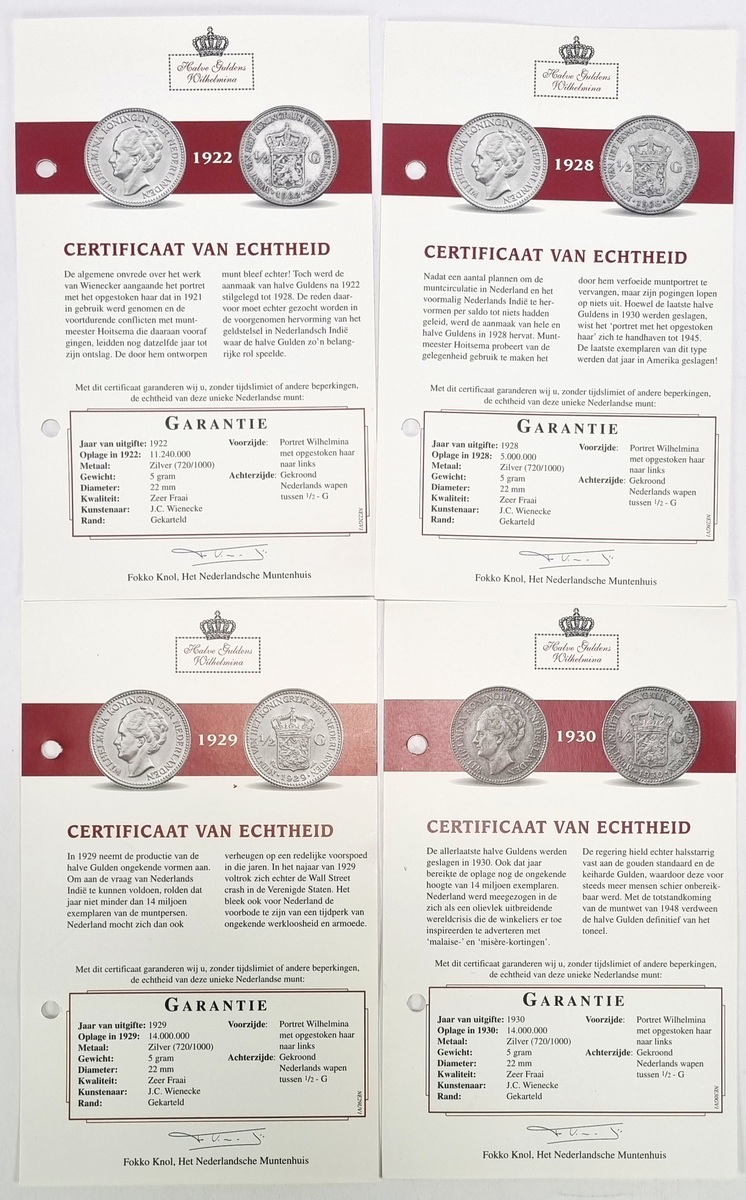 Halve guldens van Koningin Wilhelmina, geslagen in zilver en vergaard als incomplete jaargangen tussen 1898–1930. Deze verzameling omvat zestien Nederlandse circulatiemunten uit 1898, 1904 t/m 1910, 1912, 1913, 1919, 1921, 1922, 1928 t/m 1930, in capsulehouders. Te zien zijn drie portrettypen van Wilhelmina en het gekroonde rijkswapen. Inclusief certificaten van echtheid en een zilverbond, tezamen in blauwe presentatiedoosjes. Klaar om te bieden? Registreer je nu en doe mee aan de veiling! |