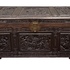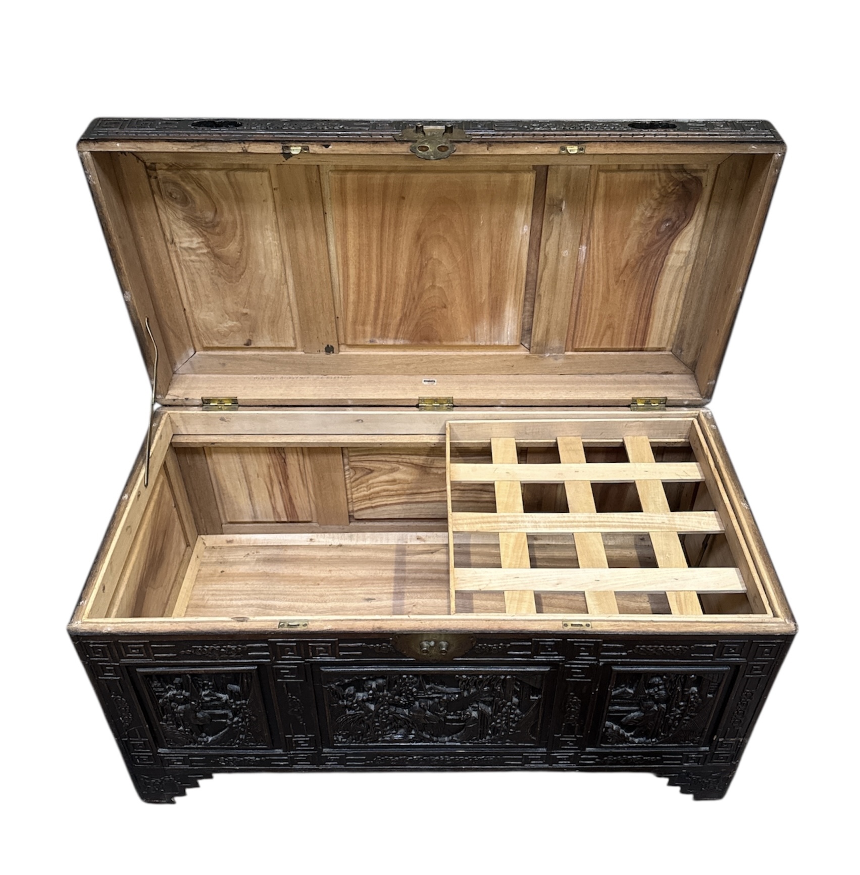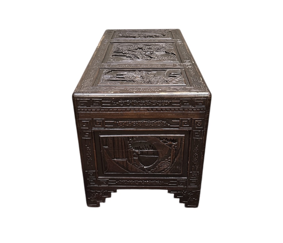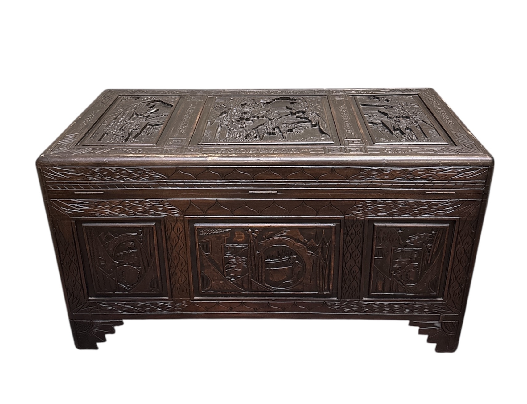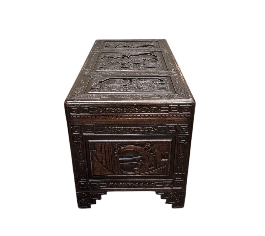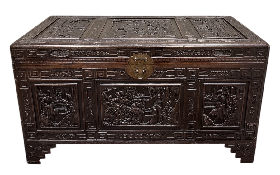 Kamferkist in Chinese exportstijl, vervaardigd uit massief hout met handgestoken decoraties in diep reliëf. De scènes tonen figuren in pagodelandschappen, omlijst door geometrische meander- en bandmotieven. De kist beschikt over een messing slotplaat en een uitneembare lade. De kist rust op karakteristieke trapvormige poten en dateert uit de eerste helft van de twintigste eeuw met een herkomst uit China. Wil je direct deelnemen? Plaats vanaf 3 april alvast een schriftelijk bod via onze website! |