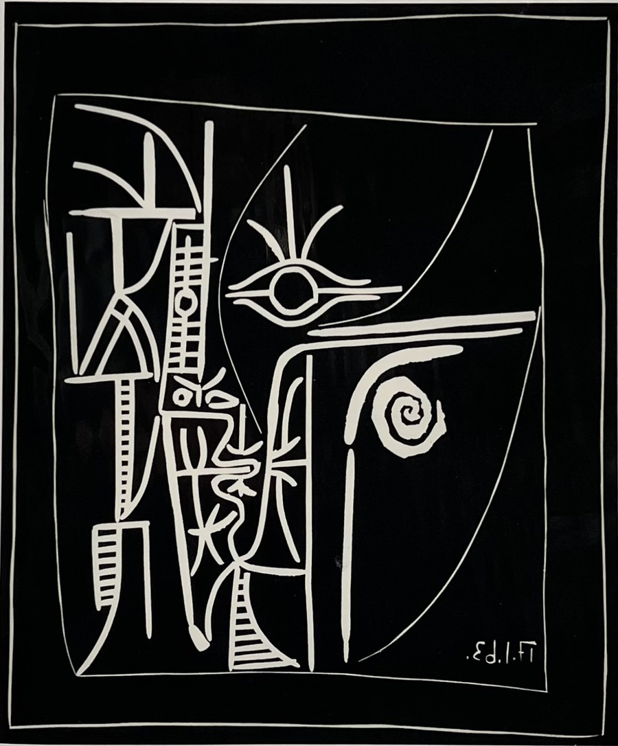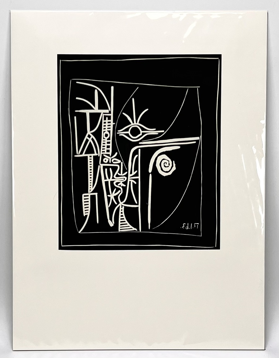 Heliogravure door Pablo Picasso (1881–1979) toont een gestileerd hoofd in surrealistische stijl, uitgevoerd in heliogravure op papier naar een linosnede uit 1963. In de plaat gesigneerd en getiteld “Tete”. De compositie combineert een diepzwart fond met witte lineaire contouren, een amandelvormig oog en spiraalvormig oor. Uitgegeven door S.P.A.D.E.M. en Cosmopress Genève in 1963. Klaar om te bieden? Registreer je nu en doe mee aan de veiling! |
