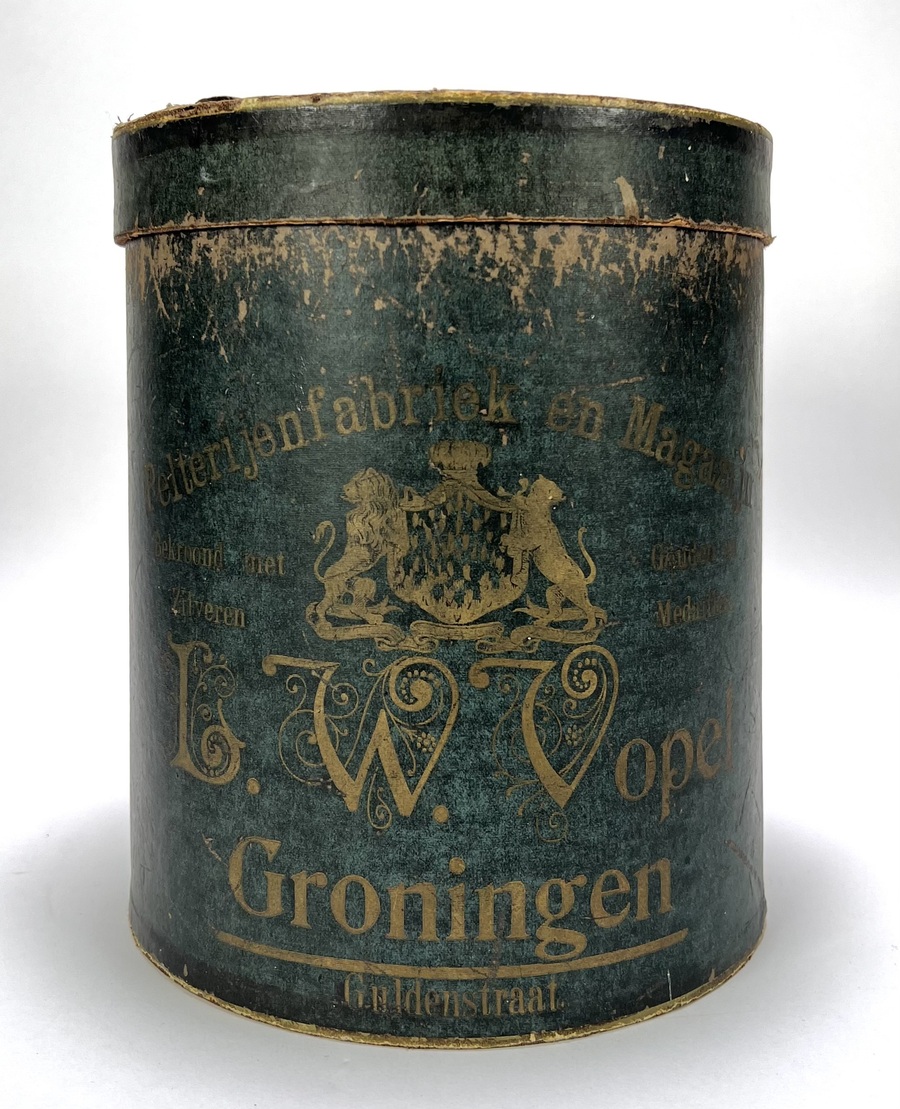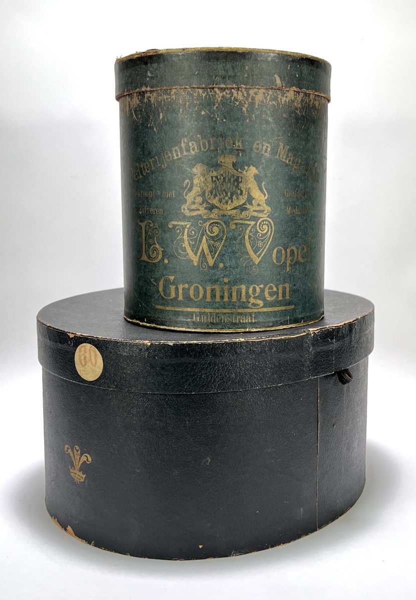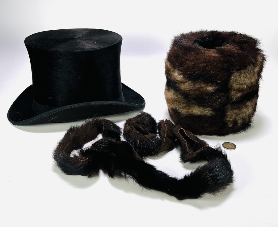 Hoge hoed en mof Pelterijenhuis Vopel Groningen, ca. 1910