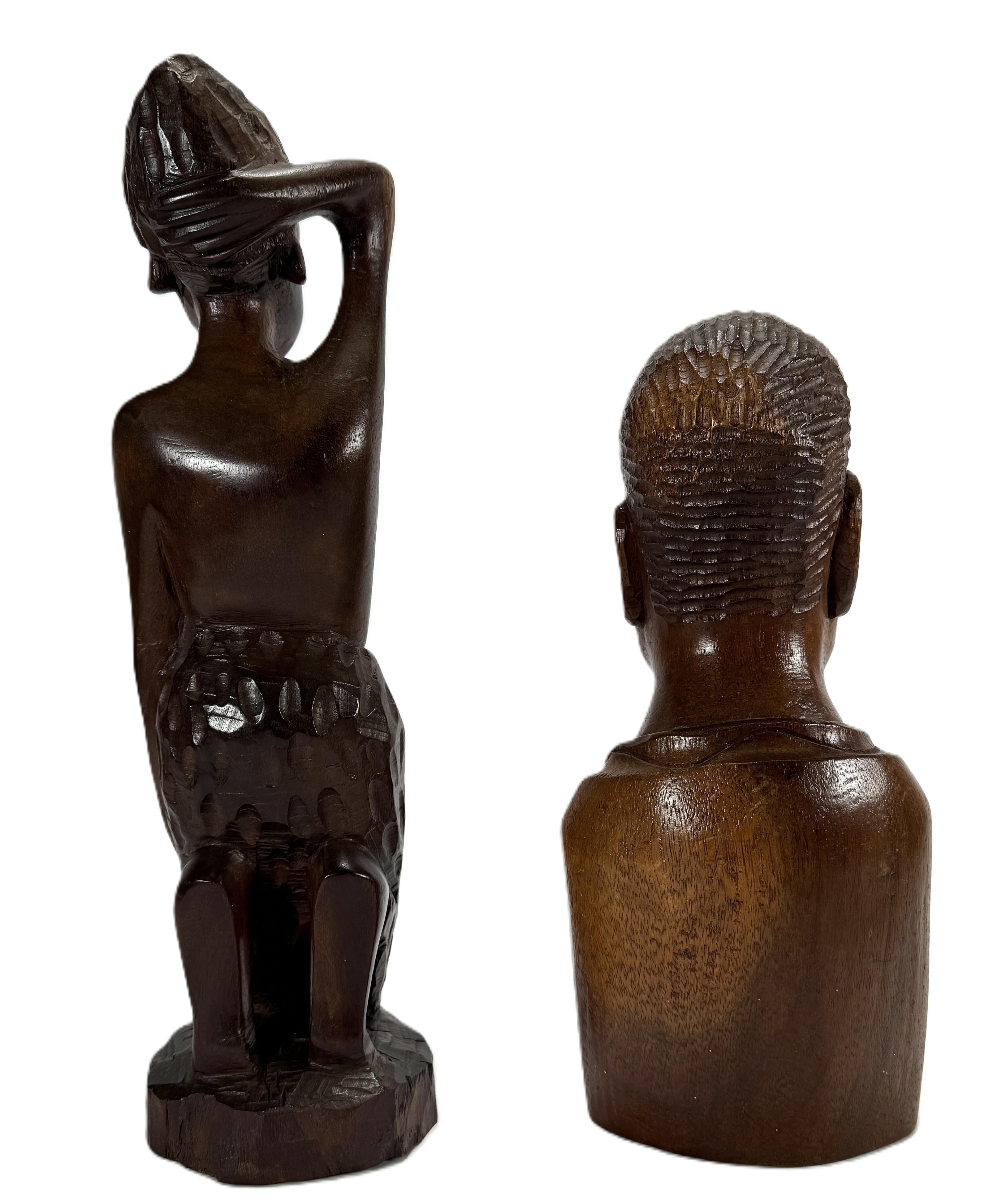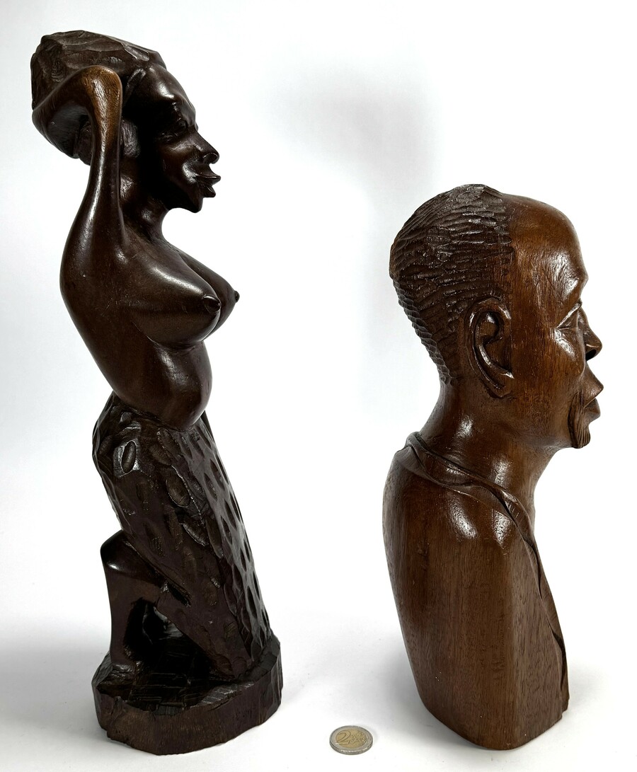 Oost-Afrikaanse beelden uit Tanzania, eind 20e eeuw, uitgevoerd in gesneden hardhout. De set bevat een naturalistische mannelijke buste en een knielende vrouwelijke figuur met karakteristieke Makonde stijlkenmerken. De figuren vertonen gedetailleerde gelaatstrekken en een egale, gepolijste patina zonder rituele gebruikssporen. Geïnteresseerd? Bezoek onze kijkdagen op 10, 11 en 12 april van 11:00 tot 17:00 uur. |