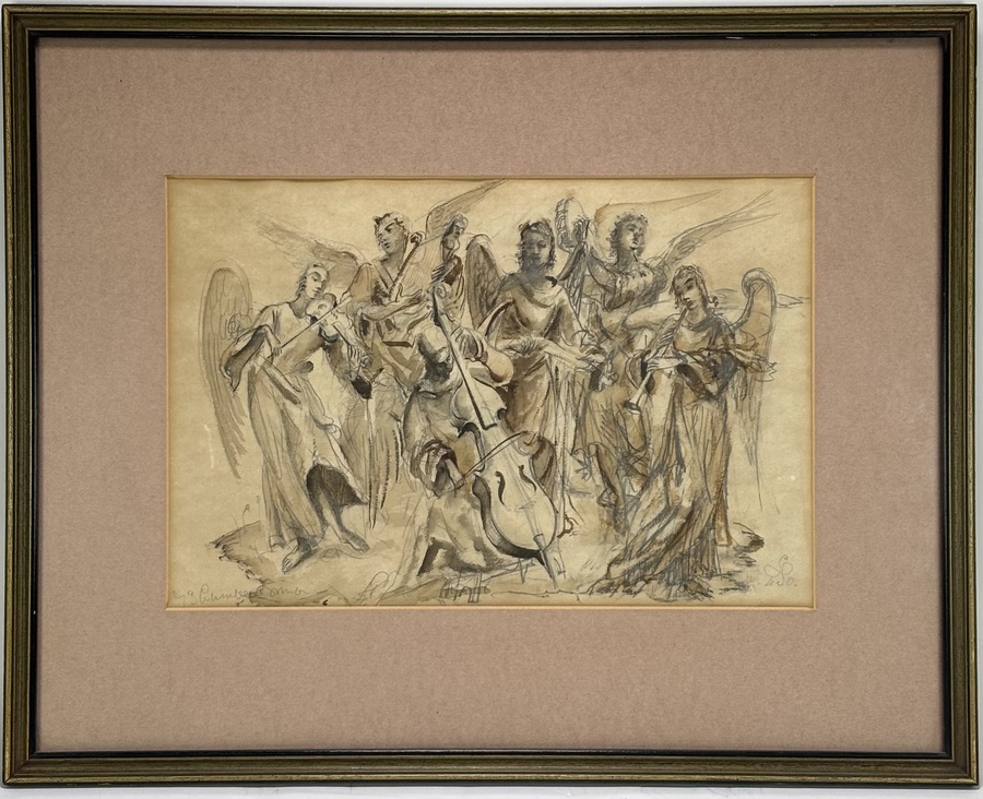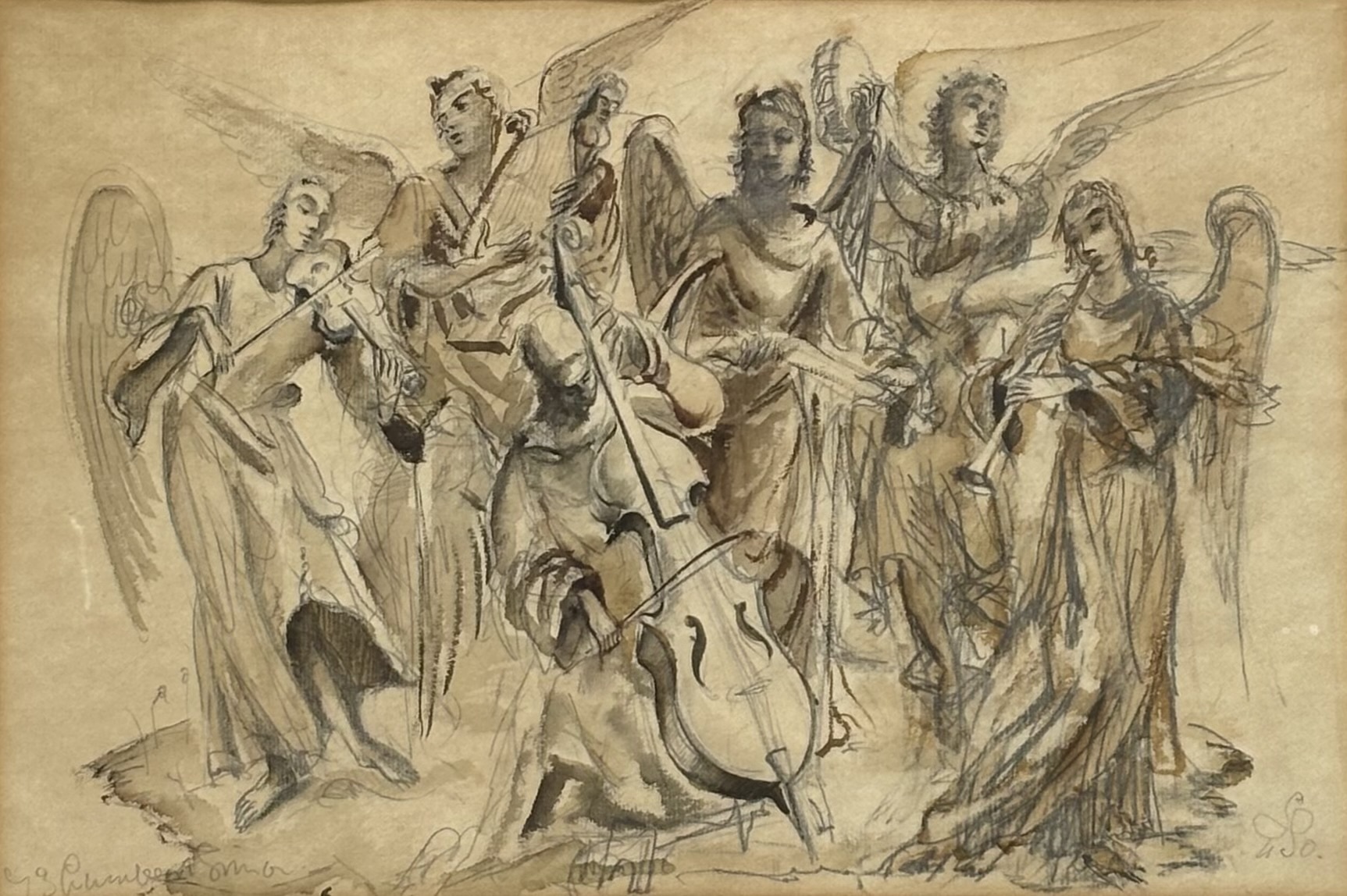 Tekening van onbekende kunstenaar toont een groep musicerende engelen rond een centraal geplaatste cellist in academisch klassieke stijl, uitgevoerd in potlood en grijze wassing op papier. De compositie is horizontaal opgebouwd met overlappende figuren en vloeiende contourlijnen. Het ingetogen palet van grijs- en aardtonen benadrukt de plastische modellering. Onduidelijk gesigneerd linksonder. Het werk dateert uit de eerste helft van de 20e eeuw en heeft een Europese herkomst. Wil je direct deelnemen? Plaats vanaf 3 april alvast een schriftelijk bod via onze website! |