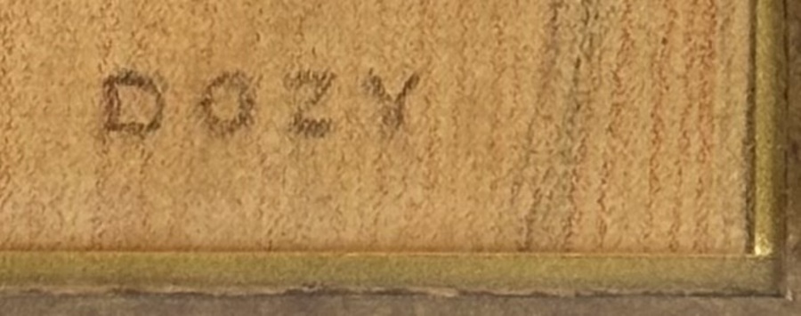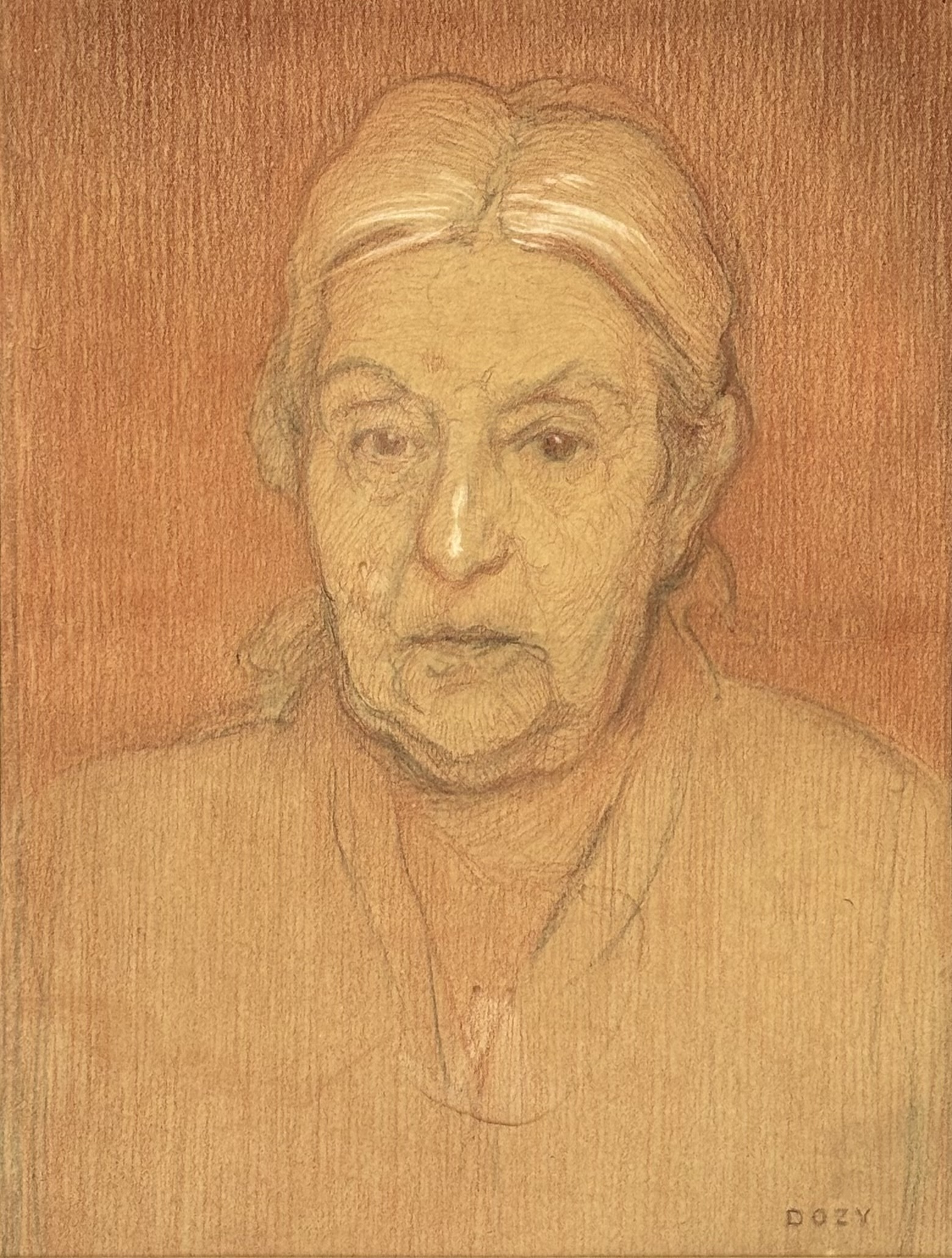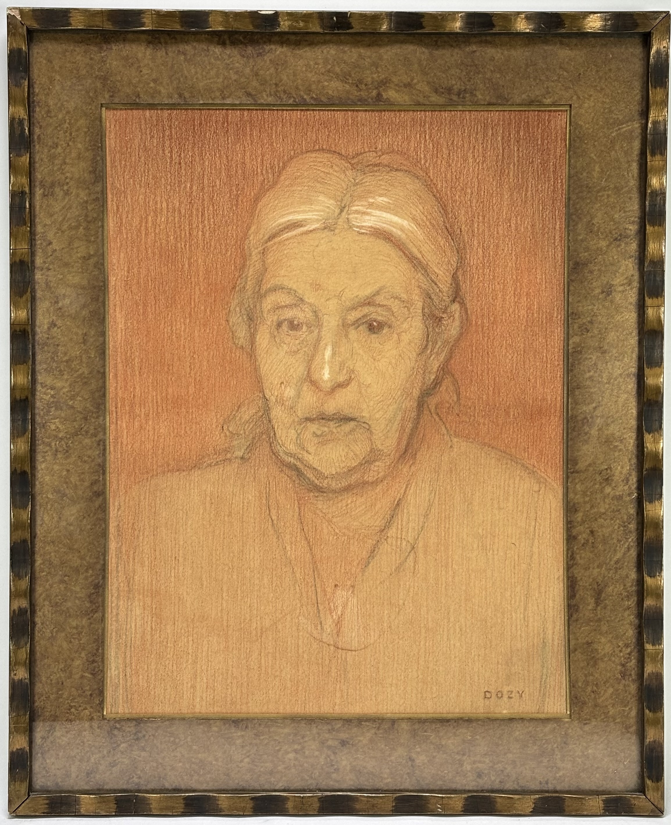Portrettekening door Reinhart Dozy (1880–1947), uitgevoerd in potlood en krijt op papier, eerste helft 20e eeuw. Het werk toont een oudere vrouw in naturalistische stijl. Rechtsonder gesigneerd “DOZY” en voorzien van een goudkleurige lijst.