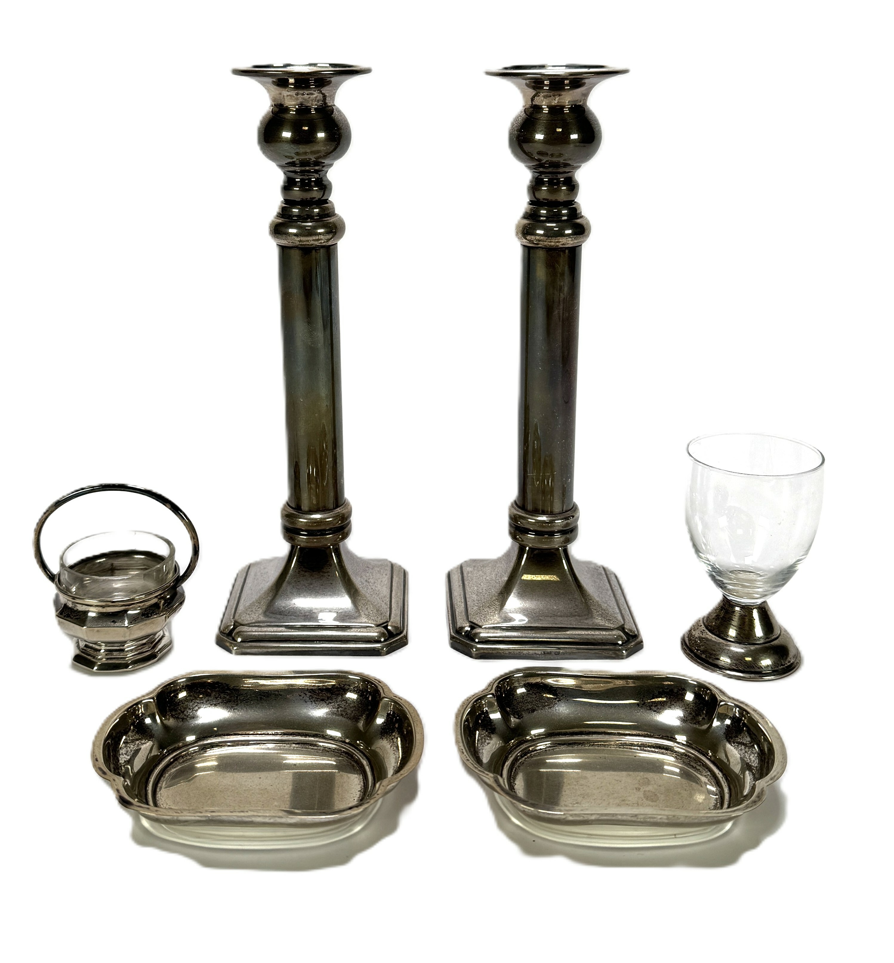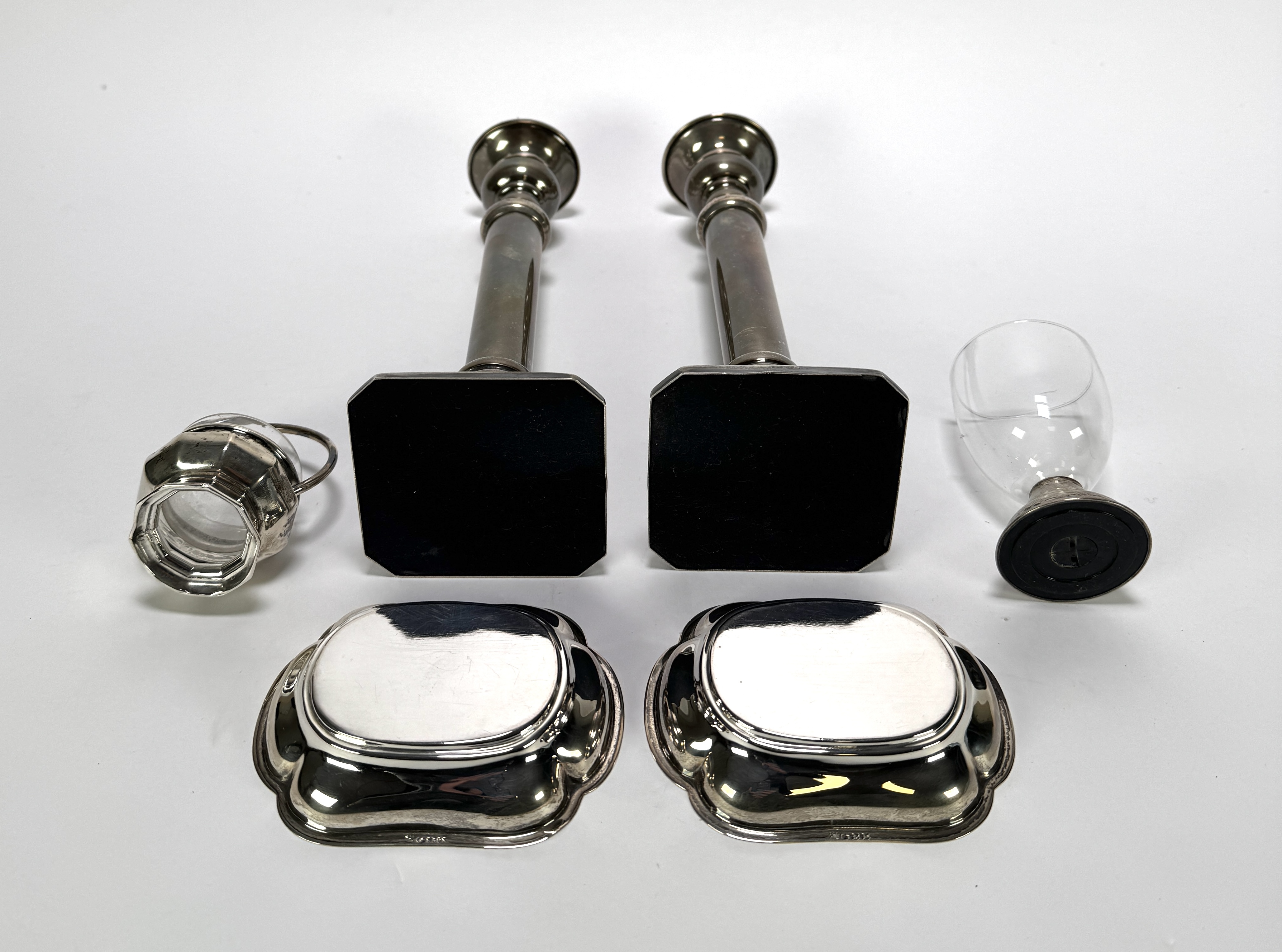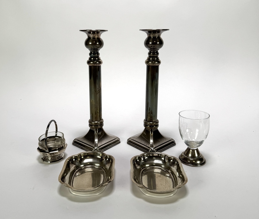 Art Deco tafelzilver - kandelaars, schaaltjes en glas, eerste helft 20e eeuw