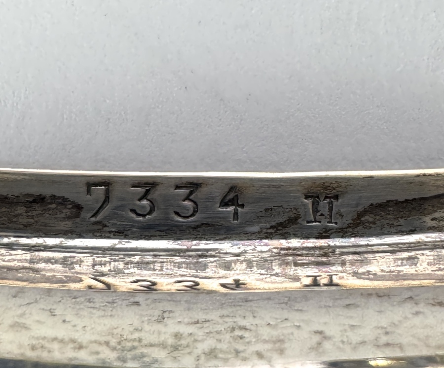 Art Deco tafelzilver, vervaardigd uit zilver en glas, bestaande uit een paar hoge kandelaars met vierkante voet, twee bijbehorende schaaltjes met afgeronde hoeken, een klein zilveren schaaltje en een glas op zilveren voet. De voorwerpen zijn uitgevoerd met strakke geometrische lijnen en contrasterende cilindrische vormen. Diverse zilverkeuren zijn zichtbaar, datering eerste helft van de 20e eeuw en een West-Europese herkomst. Geïnteresseerd? Bezoek onze kijkdagen op 10, 11 en 12 april van 11:00 tot 17:00 uur! |