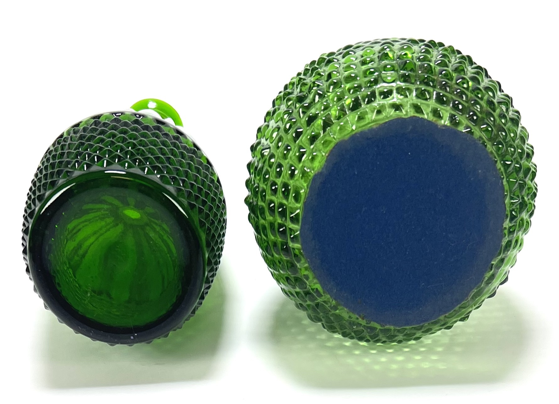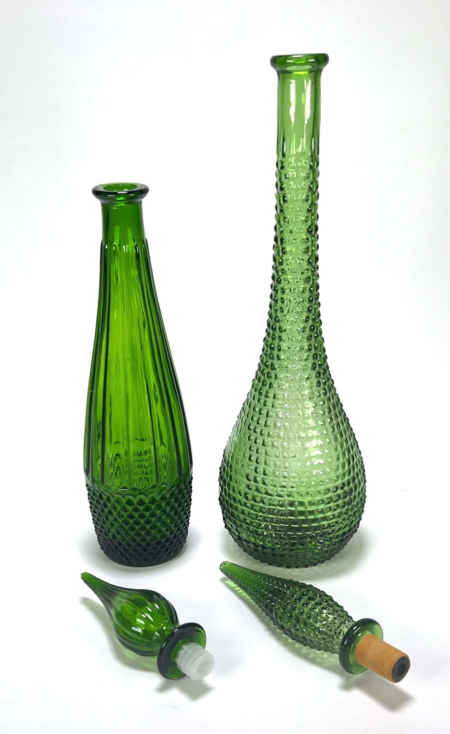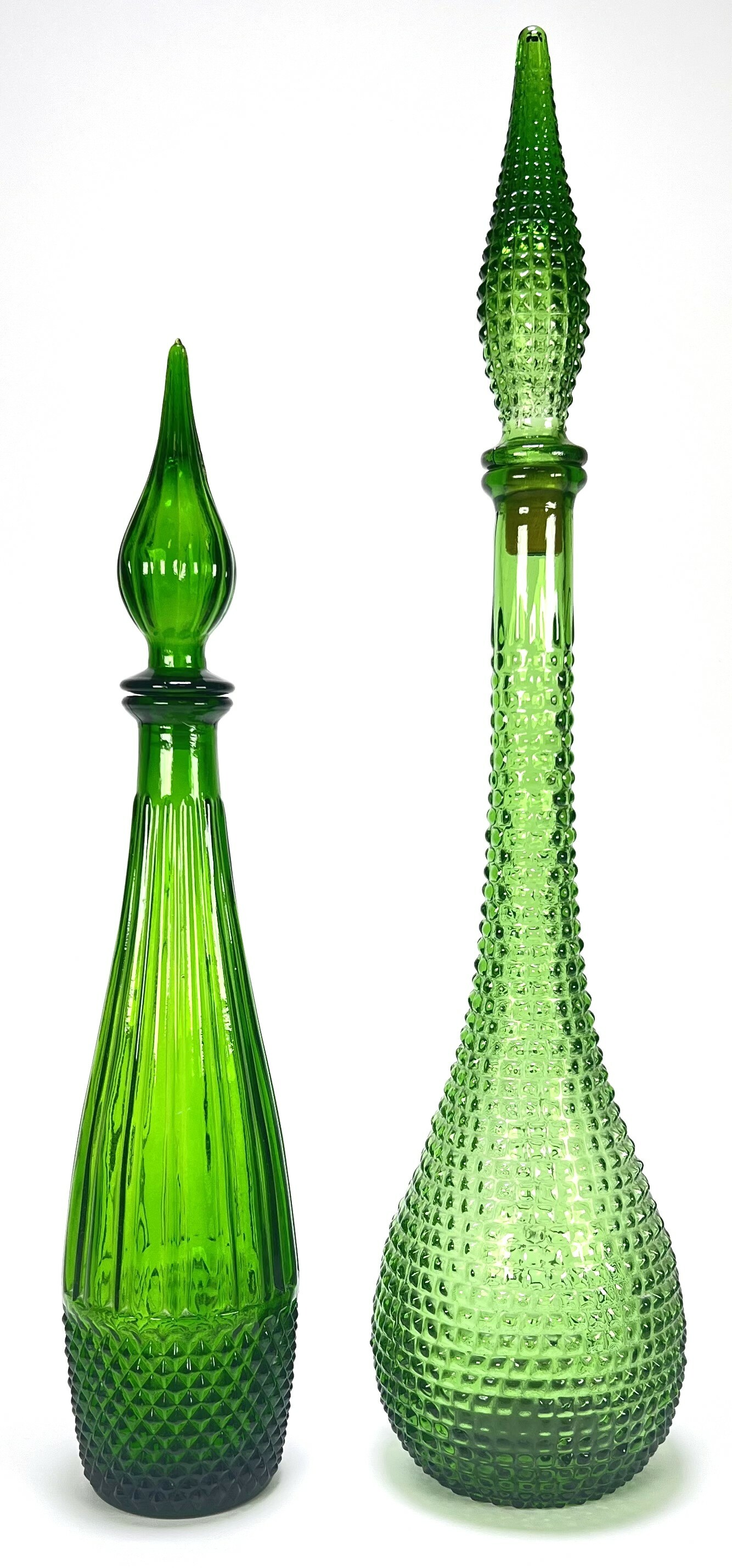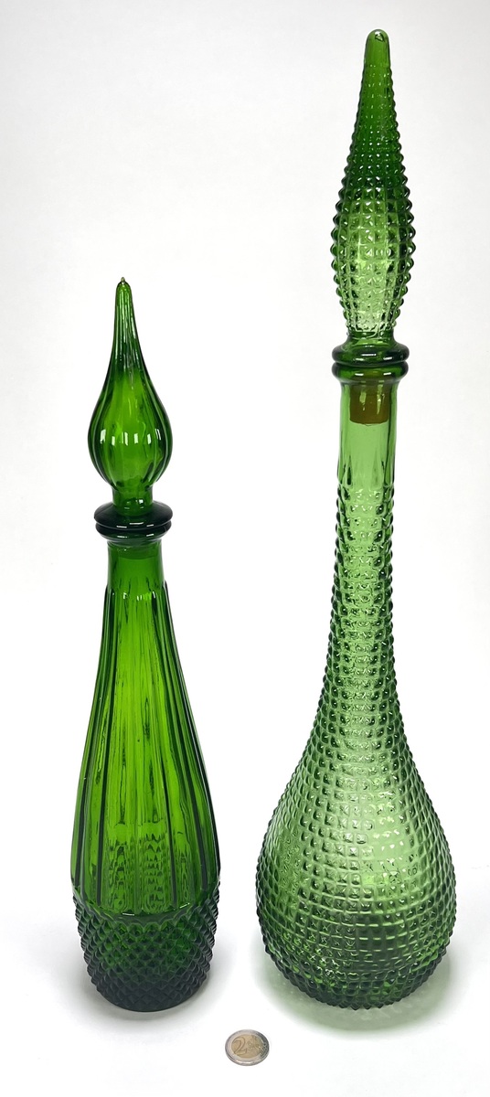 Karaffen van Empoli vervaardigd uit groen glas met reliëf, twee verschillende modellen zogenaamde "Genie Bottles". Een karaf toont een verticale ribstructuur gecombineerd met ruitmotief en een karaf heeft een doorlopend hobnail-patroon. Datering tweede helft 20e eeuw en een Italiaanse herkomst. Wil je direct deelnemen? Plaats vanaf 3 april alvast een schriftelijk bod via onze website! |