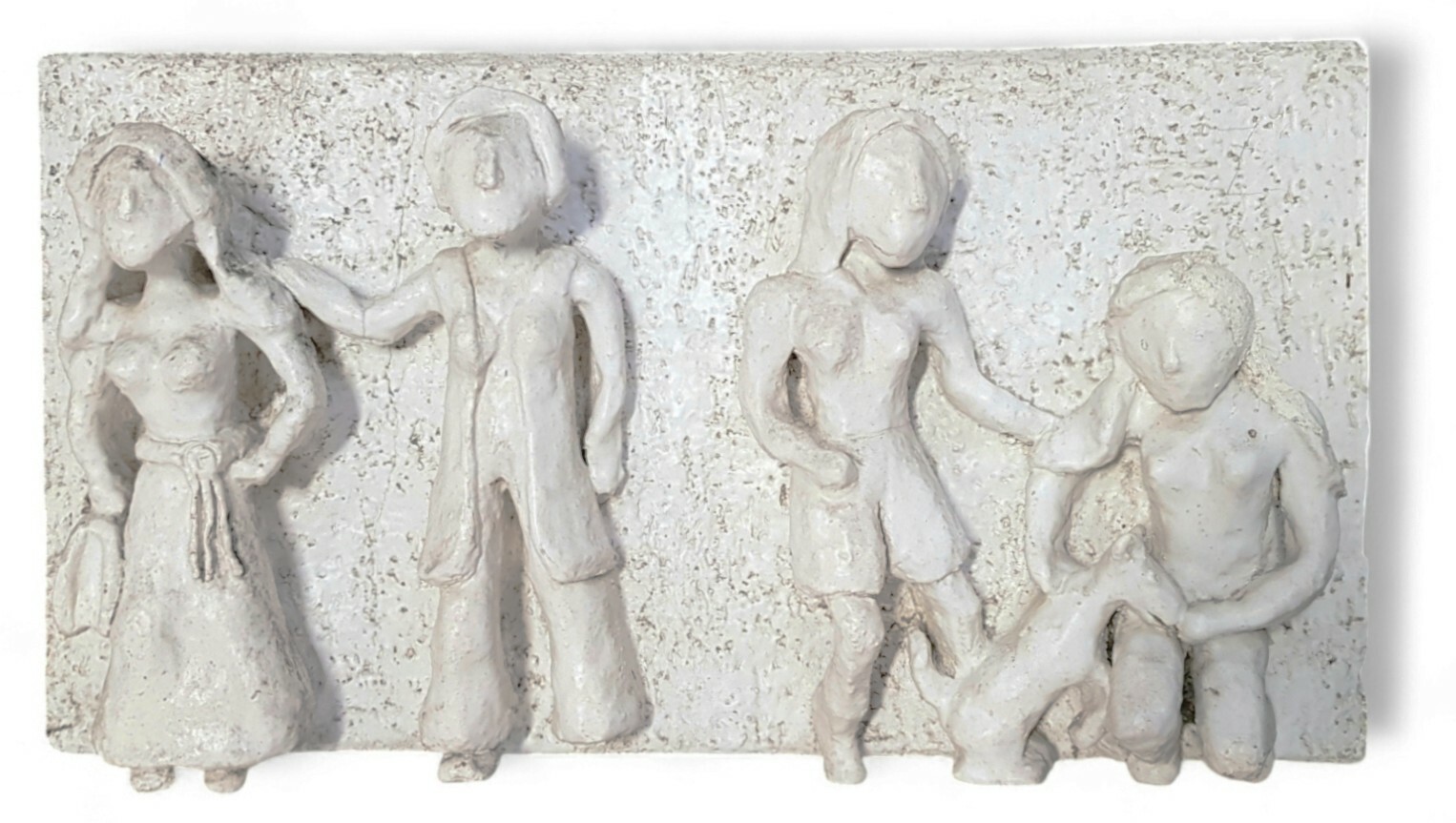 Keramiek reliëf paneel in expressionistische stijl, met een gemodelleerde voorstelling van vier gestileerde figuren met hond. Het aardewerk is handgevormd en afgewerkt met een ruwe gespikkelde witte glazuur. Het paneel is bedoeld als gevelversiering en dateert uit midden 20e eeuw. Registreren nu en bied eenvoudig online mee op dit paneel! |
