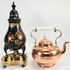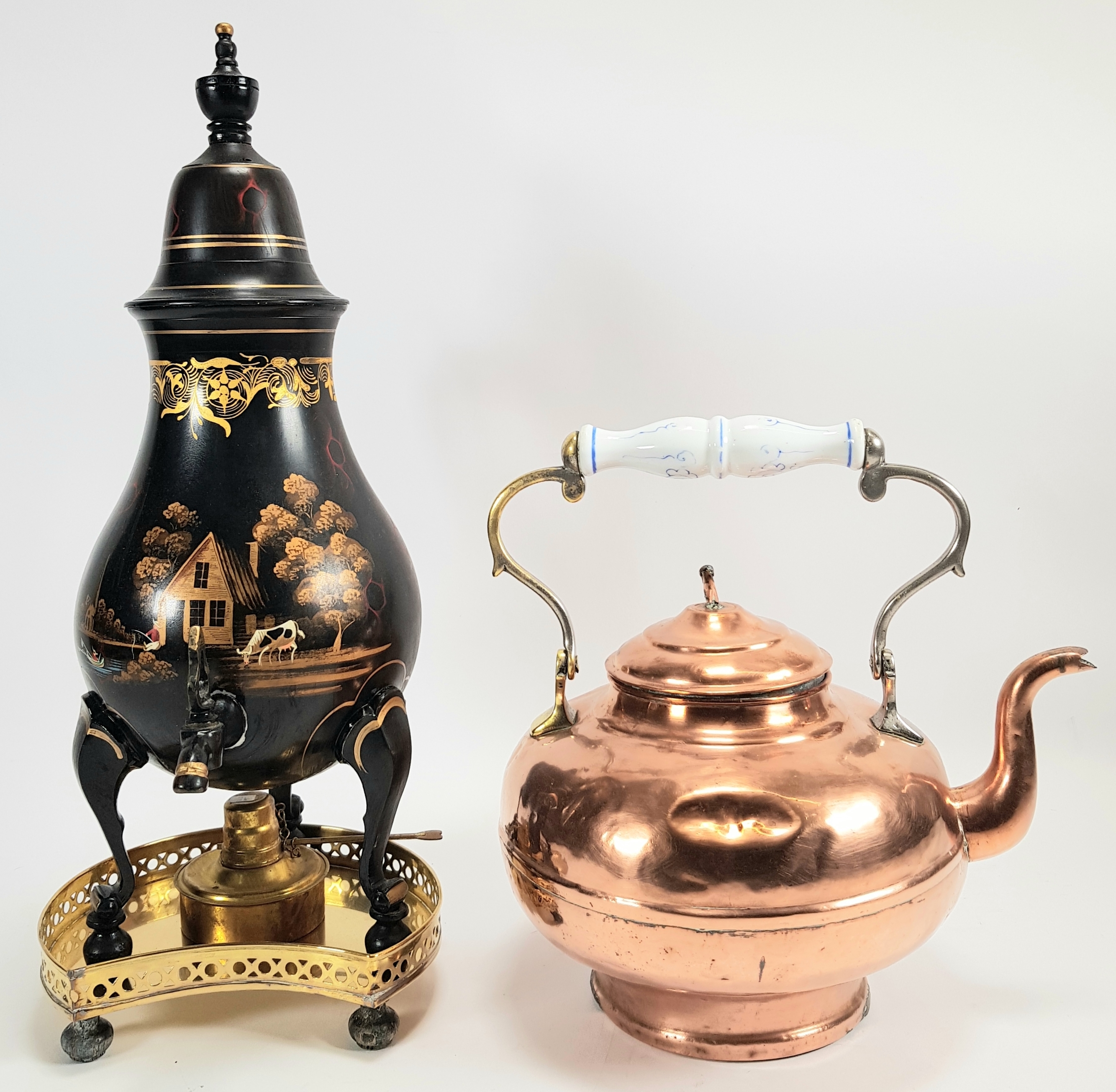 Biedermeier droppelmina en ketel vervaardigd uit koper en zwartgelakt metaal. De kraantjeskan op een goudkleurig messing onderstel is gedecoreerd met handgeschilderde florale motieven en een landschap met vee. De koperen ketel is voorzien van een wit porseleinen handvat met blauw decor. De voorwerpen dateren uit de 19e eeuw en hebben een Nederlandse herkomst. Zeker zijn van deelname? Plaats vanaf 3 april een schriftelijk bod online! |