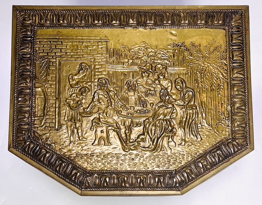 Houten kist met messing reliëfs - genretaferelen, ca. 1900