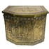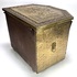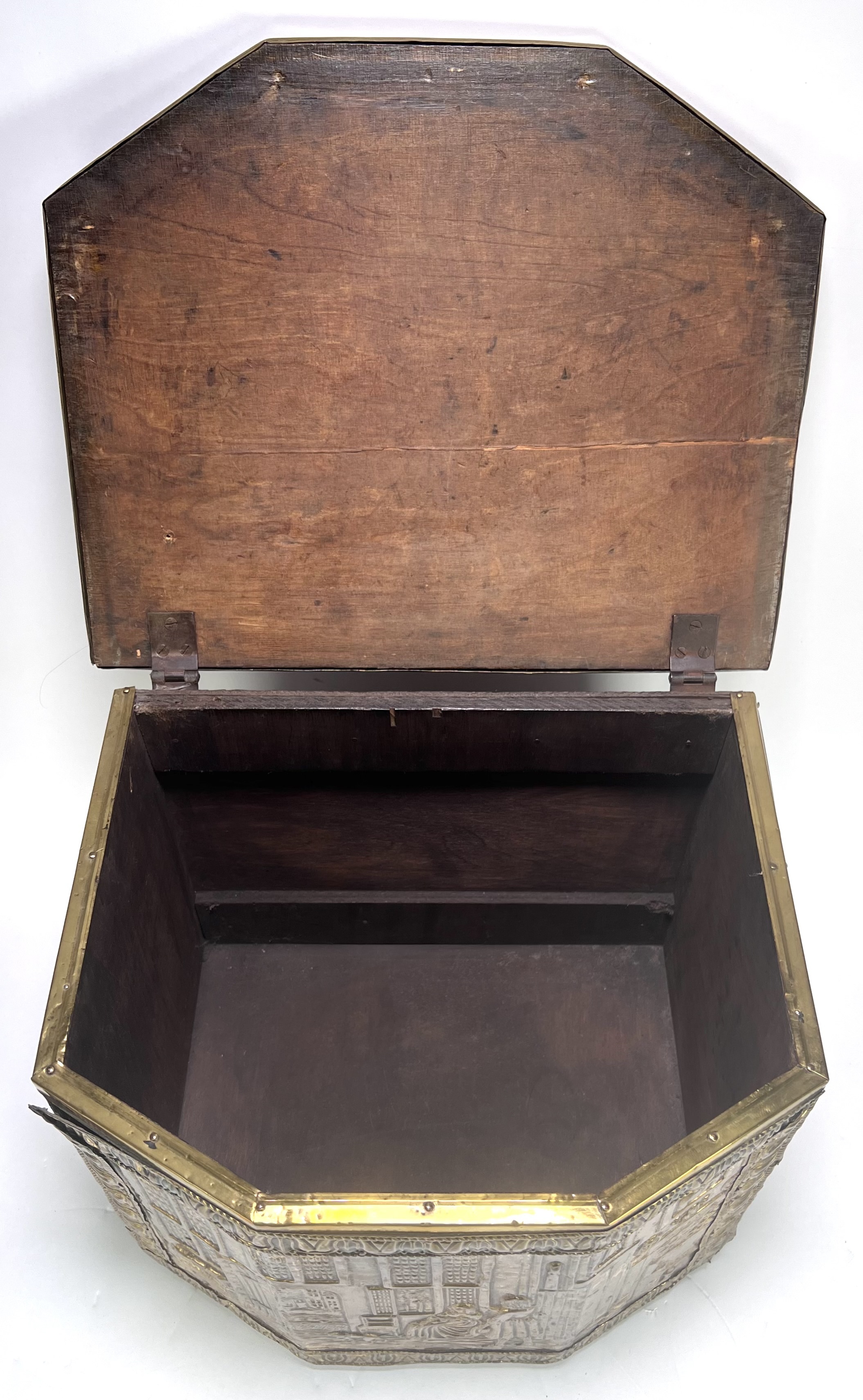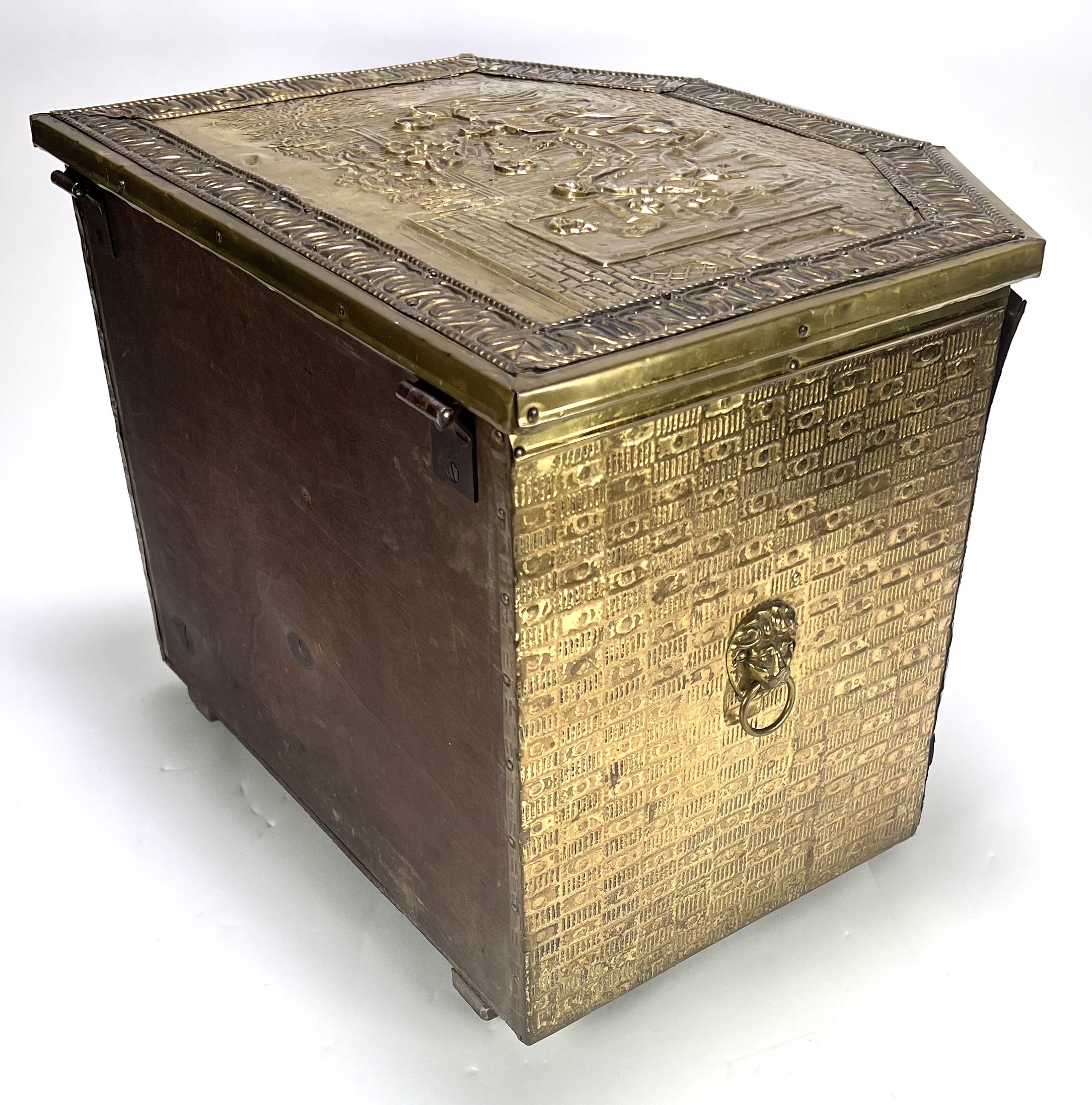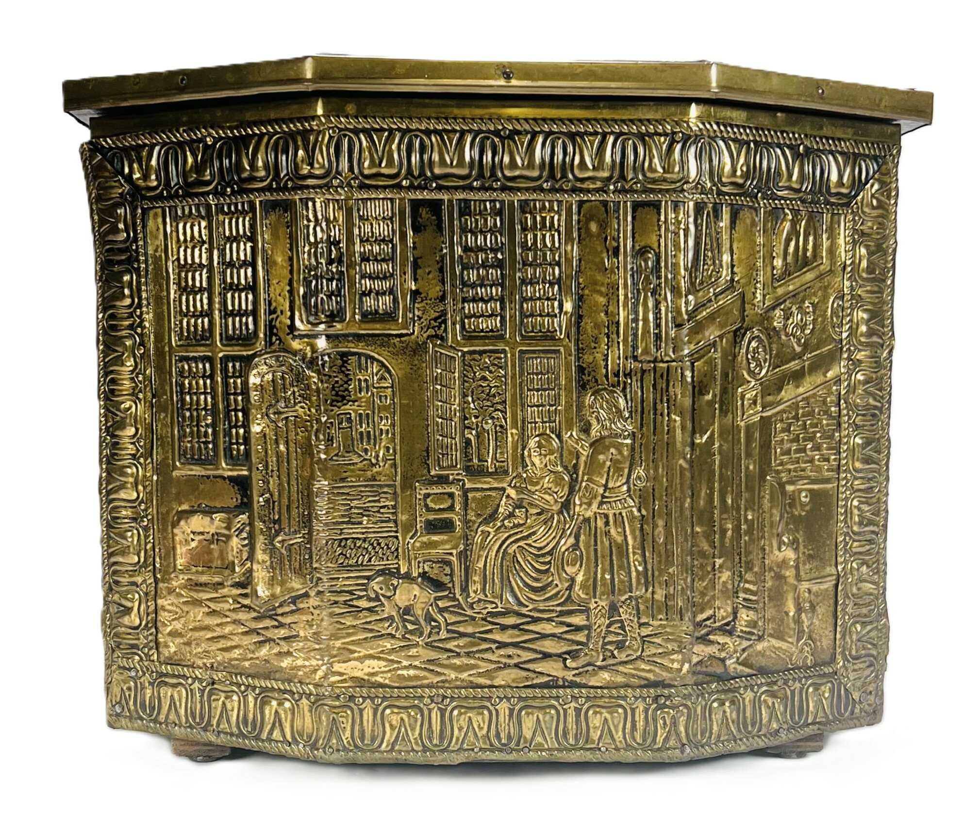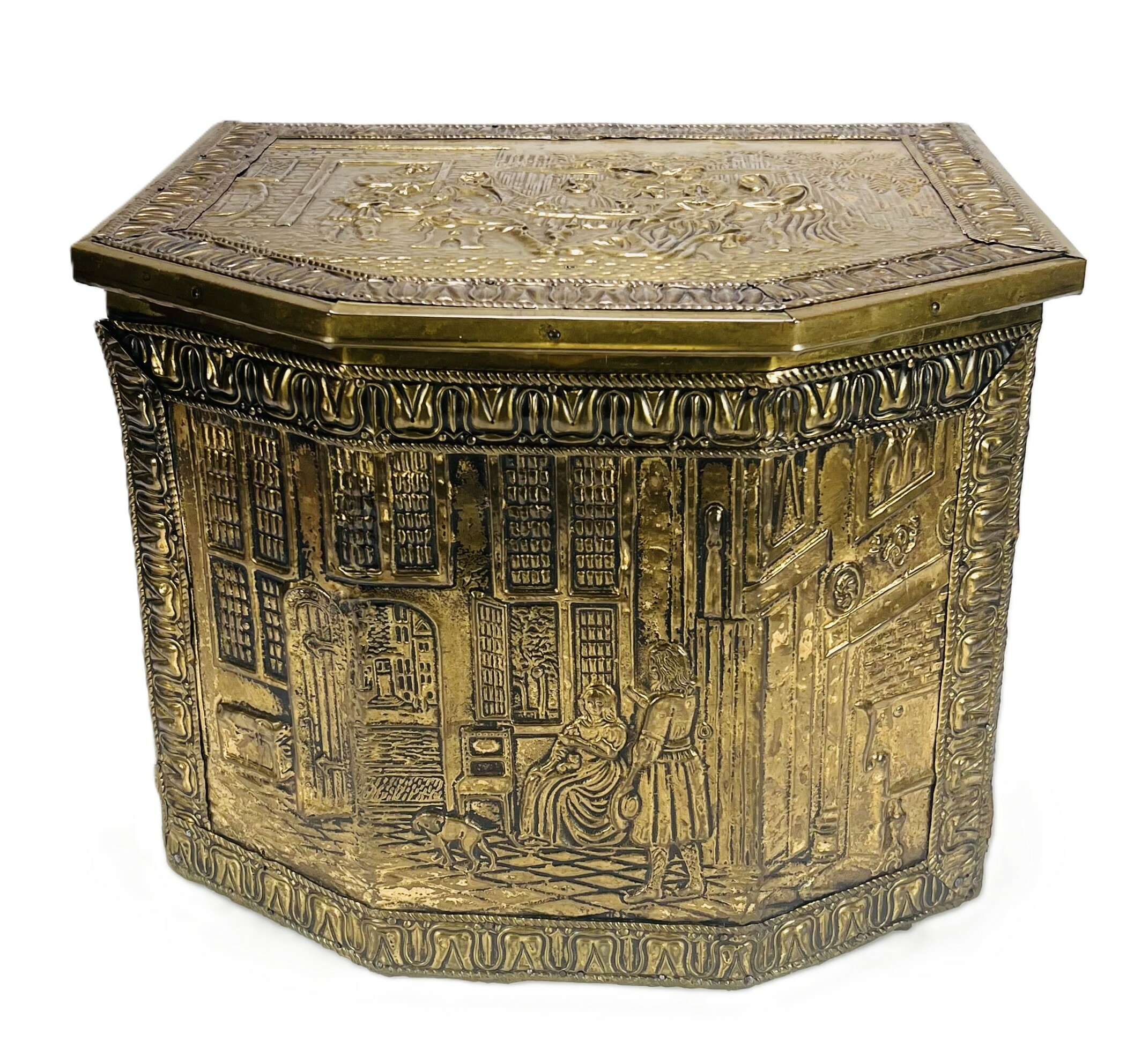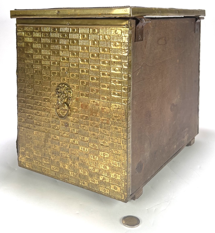Kist in Neorenaissance stijl, vervaardigd uit hout bekleed met gedreven messing. De wanden en het scharnierende deksel tonen gedetailleerde reliëfs van Hollandse genretaferelen naar 17e-eeuwse meesters, geflankeerd door decoratieve biezen en leeuwenkoppen met ringelanten. Dit type kist fungeerde historisch als kolenbak bij de haard. De kist dateert van circa 1900 en heeft een herkomst in West-Europa. Voeg deze kist toe aan je verzameling en doe een bod! |