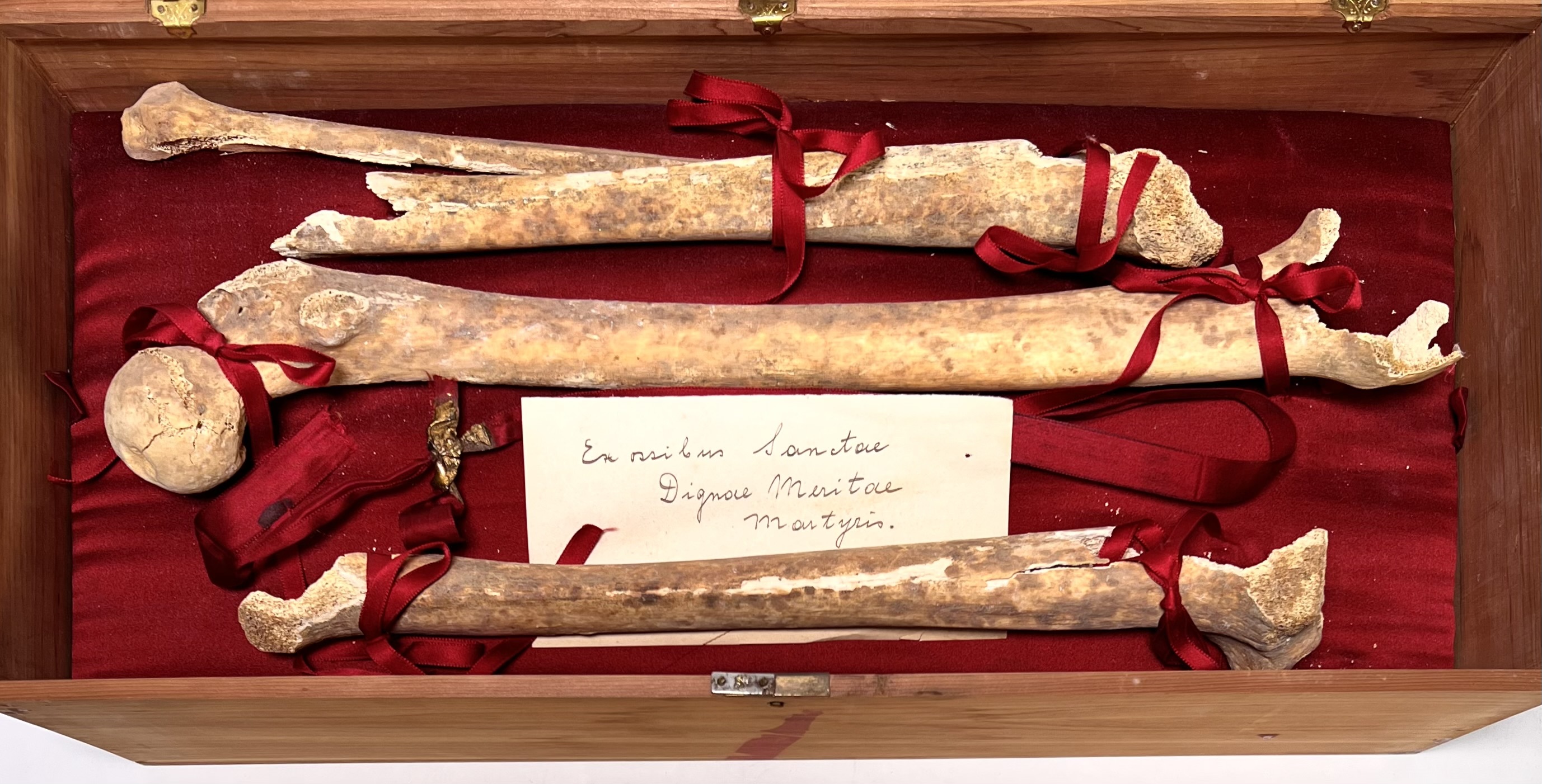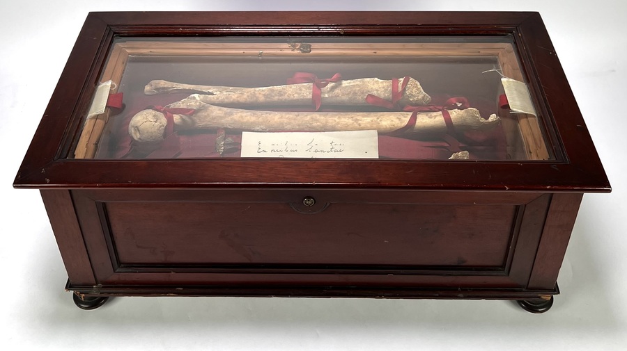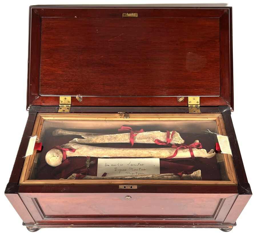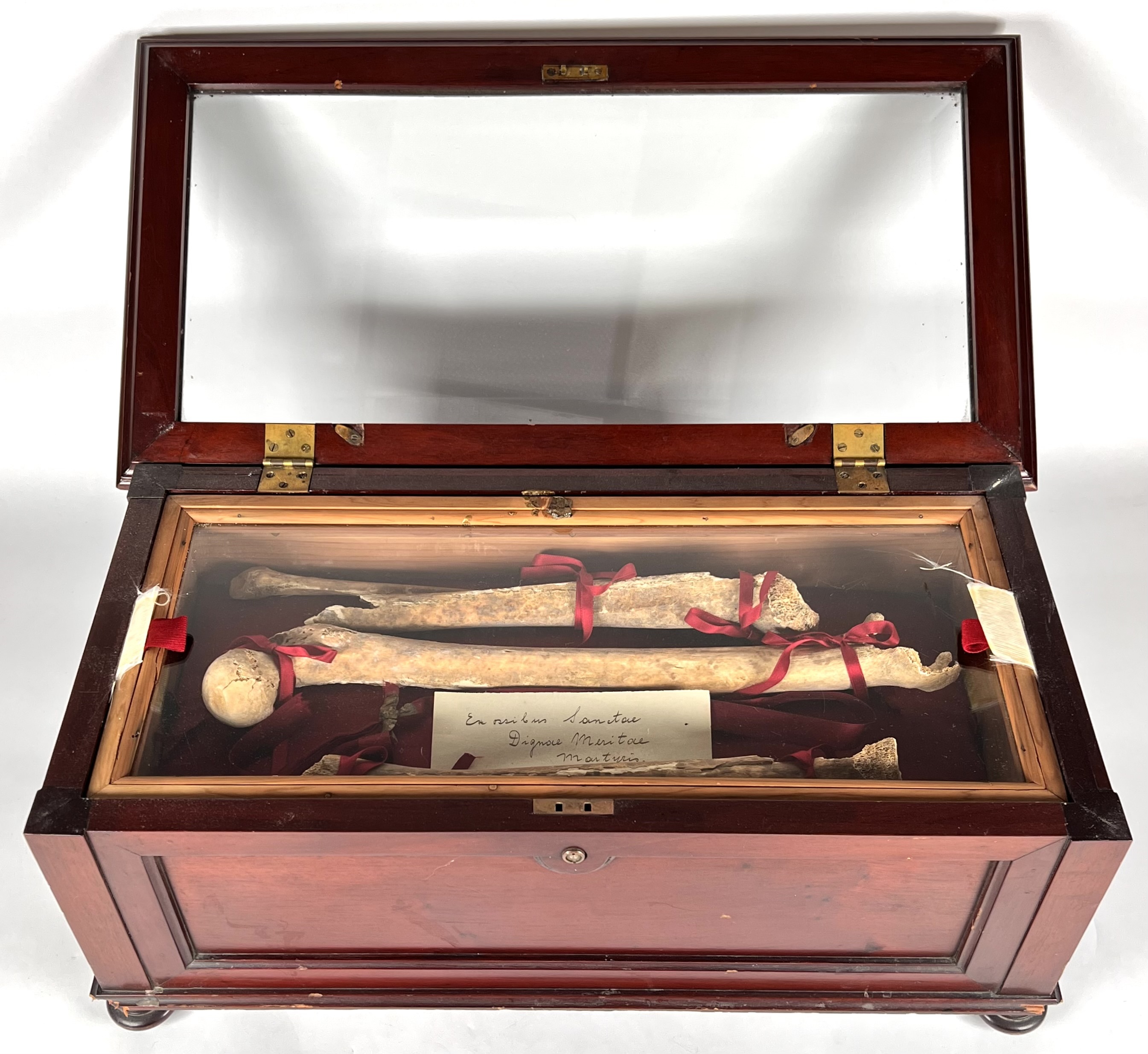 Reliekhouder uit de 19e eeuw, vervaardigd uit mahoniehout met een glazen presentatievenster. De houten schrijn bevat drie menselijke botresten van de Heilige Digna Merita, die met rode zijden linten op een bordeauxrood fluwelen kussen zijn bevestigd. Een handgeschreven Latijnse tekst “Ex ossibus Sanctae Dignae Meritae martyris" identificeert de martelares. De reliekhouder dateert uit de negentiende eeuw en heeft een kunsthistorische herkomst in Malta. Klaar om te bieden? Registreer je nu en doe mee aan de veiling! |