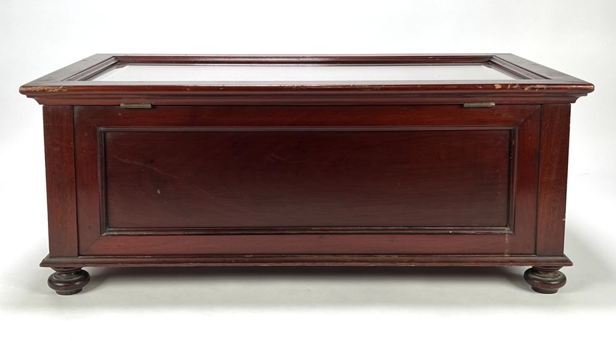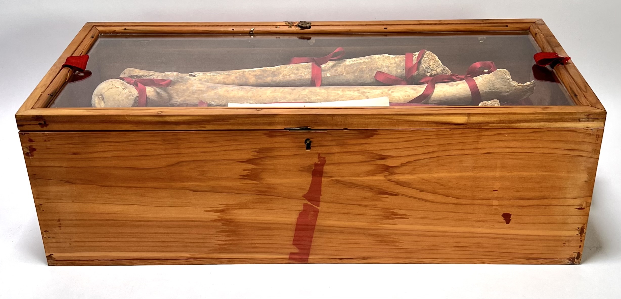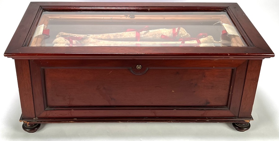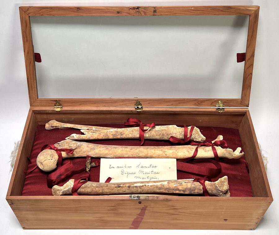 Reliekhouder uit de 19e eeuw, vervaardigd uit mahoniehout met een glazen presentatievenster. De houten schrijn bevat drie menselijke botresten van de Heilige Digna Merita, die met rode zijden linten op een bordeauxrood fluwelen kussen zijn bevestigd. Een handgeschreven Latijnse tekst “Ex ossibus Sanctae Dignae Meritae martyris" identificeert de martelares. De reliekhouder dateert uit de negentiende eeuw en heeft een kunsthistorische herkomst in Malta. Klaar om te bieden? Registreer je nu en doe mee aan de veiling! |