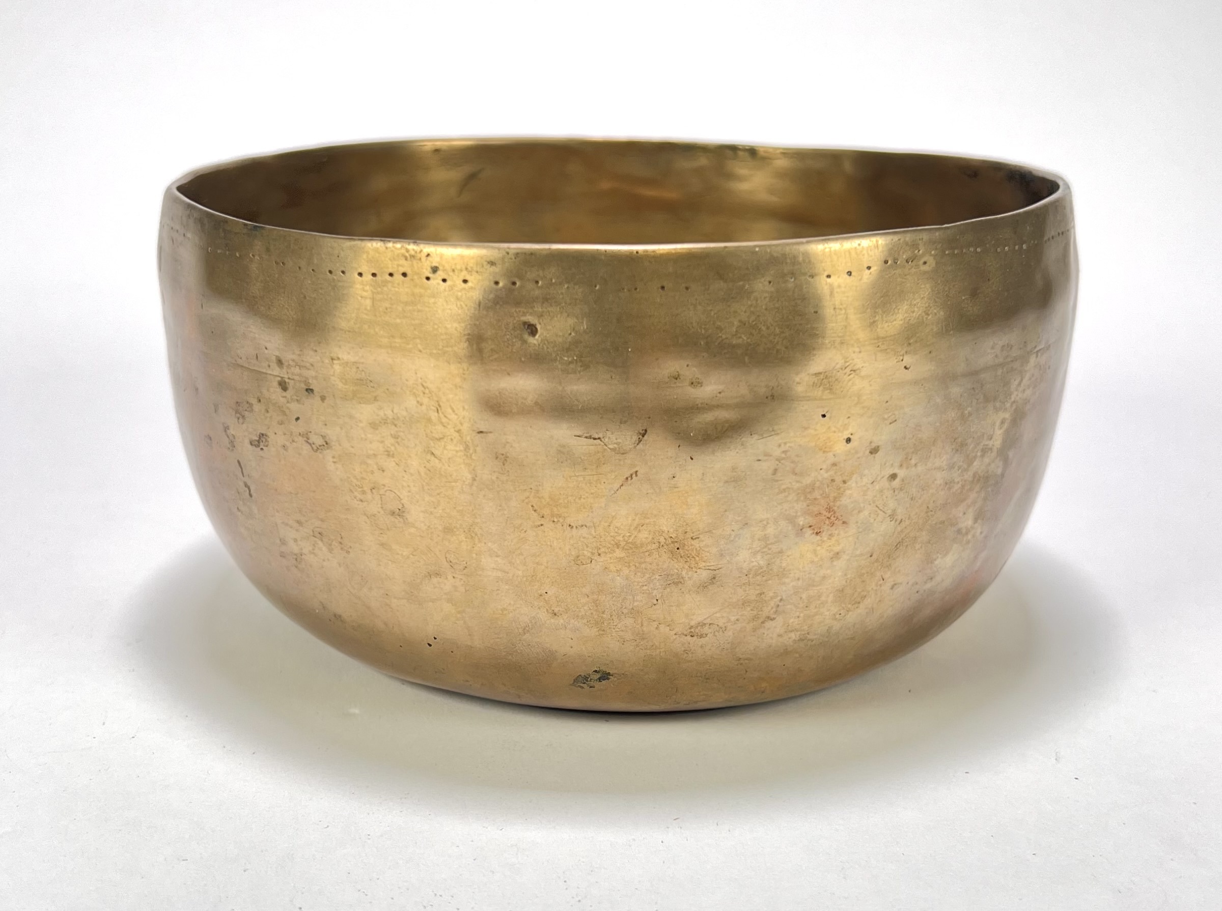 Klankschaal in Tibetaanse stijl, vervaardigd uit hand gesmeed messing met een karakteristiek gehamerd oppervlak. De diepe, halfronde corpus is nabij de rand gedecoreerd met een subtiel gepunteerd motief van kleine cirkelvormige inkepingen. De schaal is uitgevoerd in een traditionele legering voor optimale resonantie en wordt vergezeld door een bijbehorende slagstok. De klankschaal dateert uit de tweede helft van de 20e eeuw en heeft een Aziatische herkomst. Klaar om te bieden? Registreer je nu en doe mee aan de veiling! |