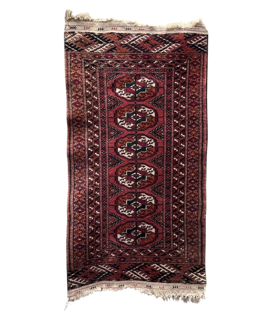 Turkmen kleed uit het midden van de 20e eeuw, vervaardigd met symmetrische knoop in wollen pool op wollen schering en inslag. Het veld toont herhalende ovale gül motieven in verticale ordening op een donkerrode grond, met accenten in blauwzwart en ivoor. Het kleed wordt omlijst door meervoudige smalle randen met geometrische haak- en bandmotieven. Herkomst Afghanistan. Kom langs tijdens de kijkdagen (10 t/m 12 april) en ontdek dit kleed zelf! |