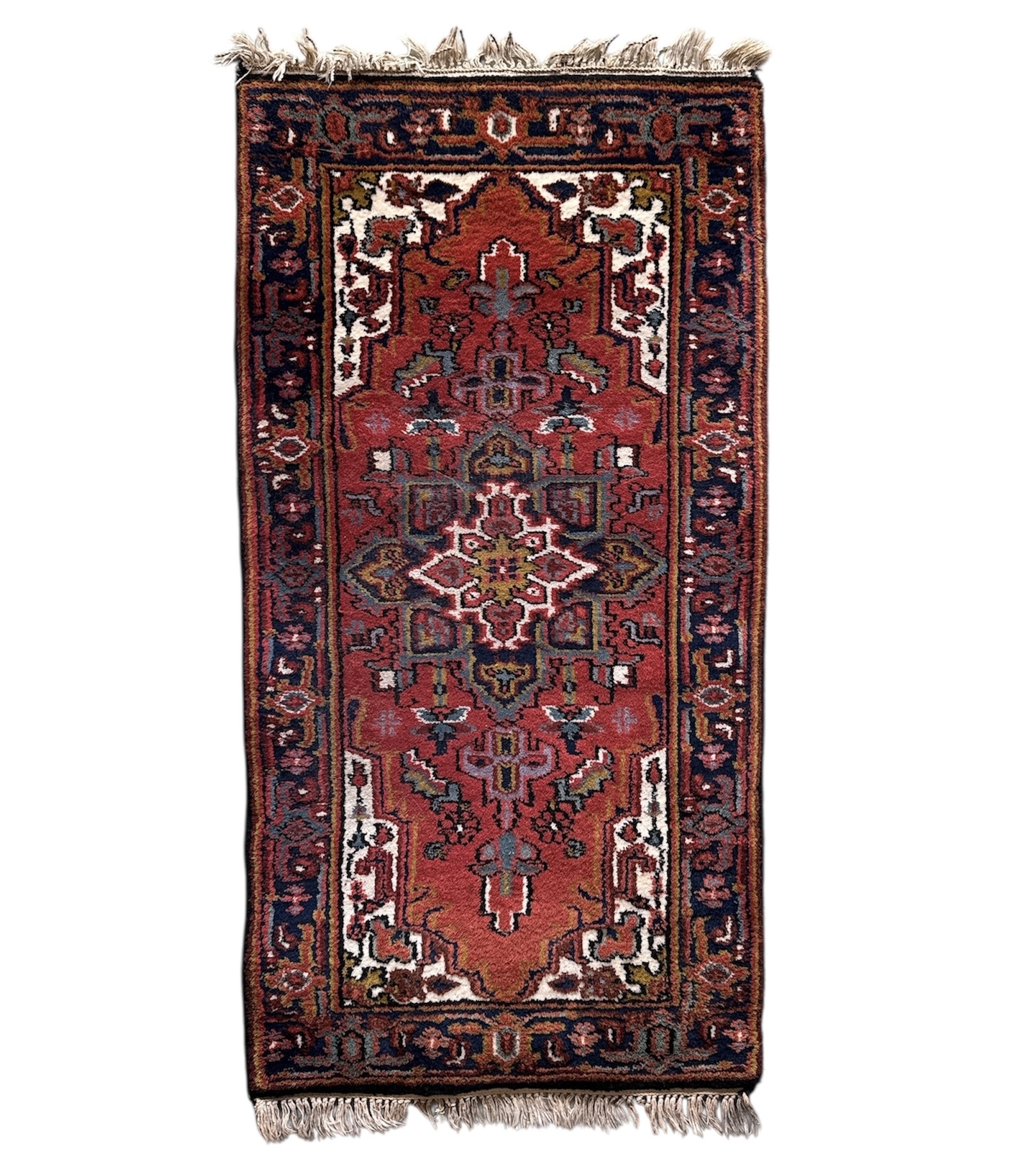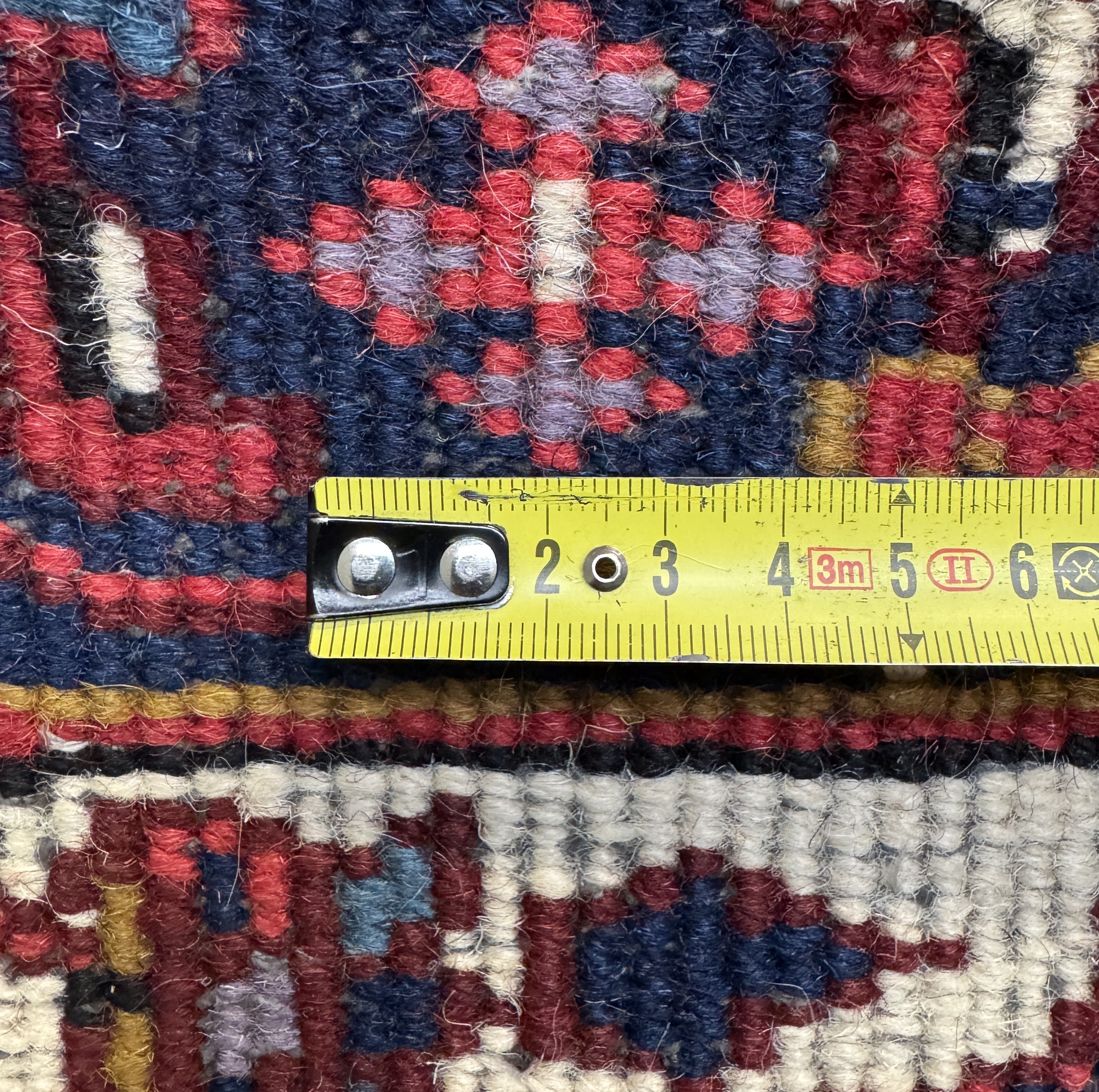 Hamadan-gebied kleed uit het midden van de 20e eeuw, vervaardigd met symmetrische Ghiordes-knoop in wollen pool op katoenen schering en inslag. Het kleed toont een geometrisch centraal medaillon met contrasterende hoekstukken, geplaatst op een meekrap grond met indigo en ivoorkleurige accenten. De hoofdrand is uitgevoerd met herhalende geometrisch florale motieven. West-Perzische herkomst. Dit kleed zelf beoordelen? Je bent welkom op onze kijkdagen op 10, 11 en 12 april! |