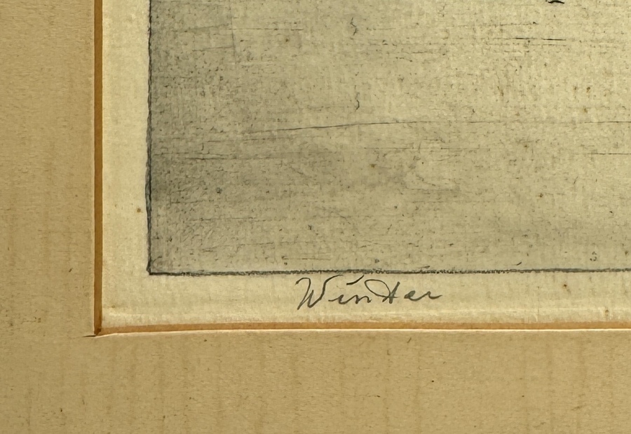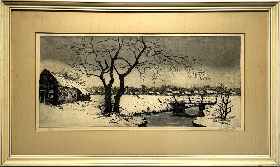 Ets door Antoon van Hemert (1883–1944) toont een Hollands winterlandschap in realistische stijl, uitgevoerd in kleurenets op papier. Linksonder bevindt zich de titel "Winter" en rechtsonder is het werk met potlood gesigneerd. Het werk dateert uit circa 1920 en heeft een Nederlandse herkomst. Het werk bevindt zich in een goudkleurige lijst. Ontdek deze ets en voeg het toe aan jouw collectie! Registreer nu voor de veiling. |